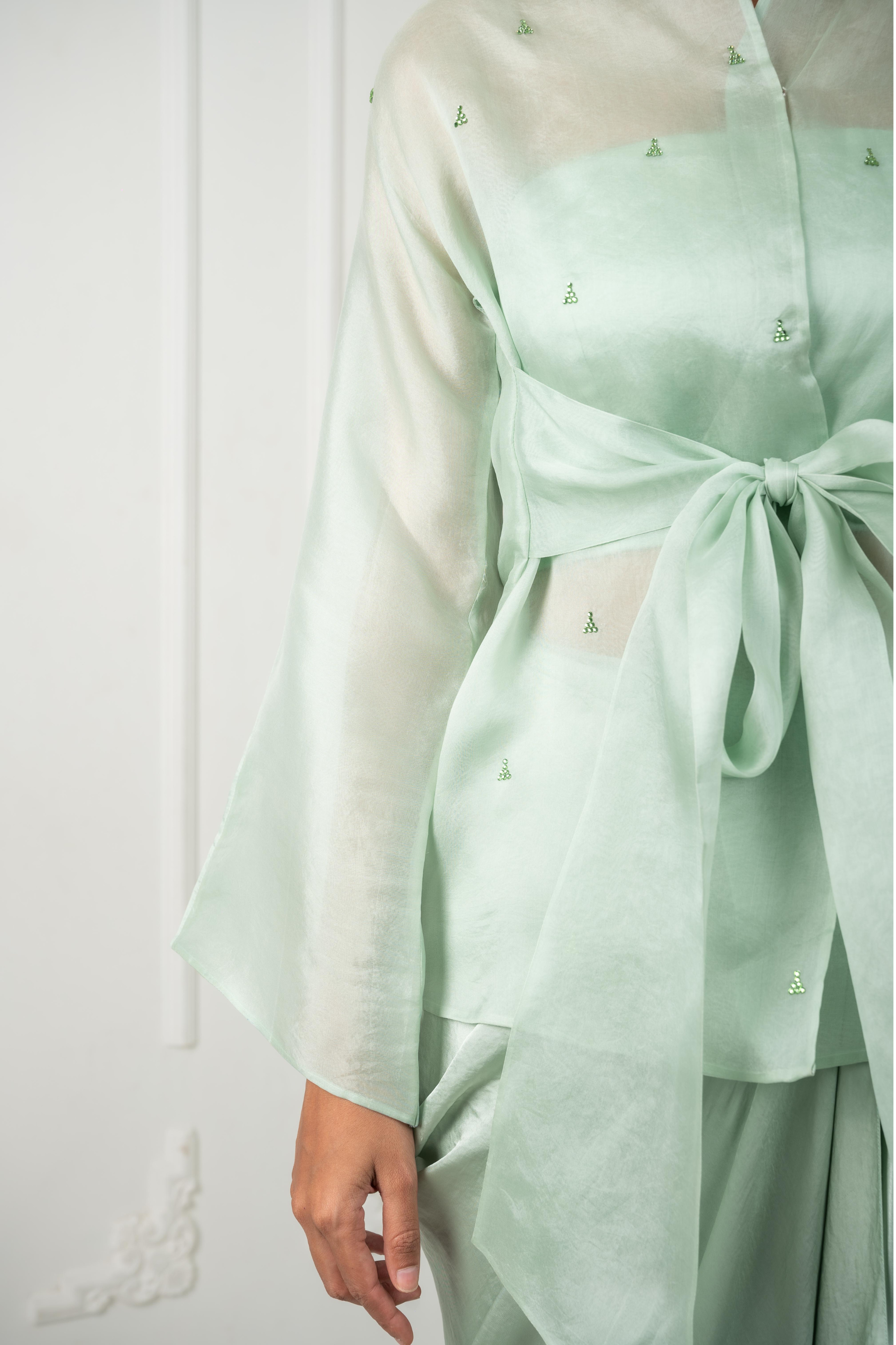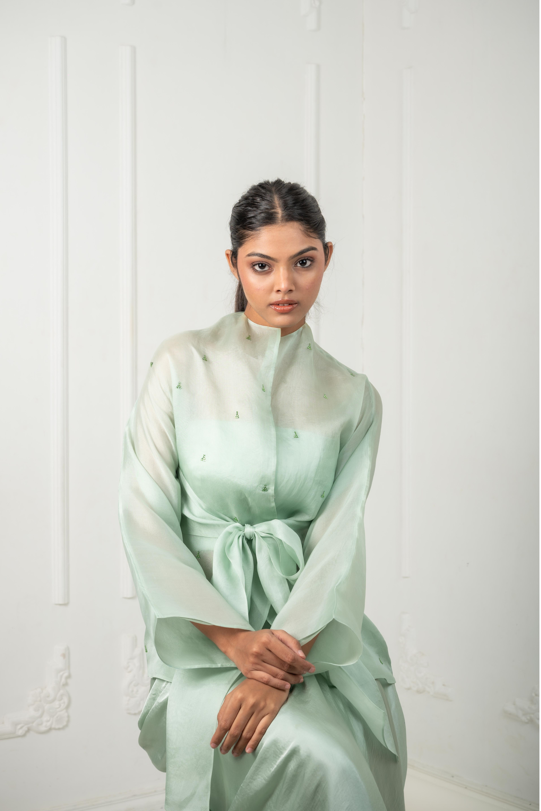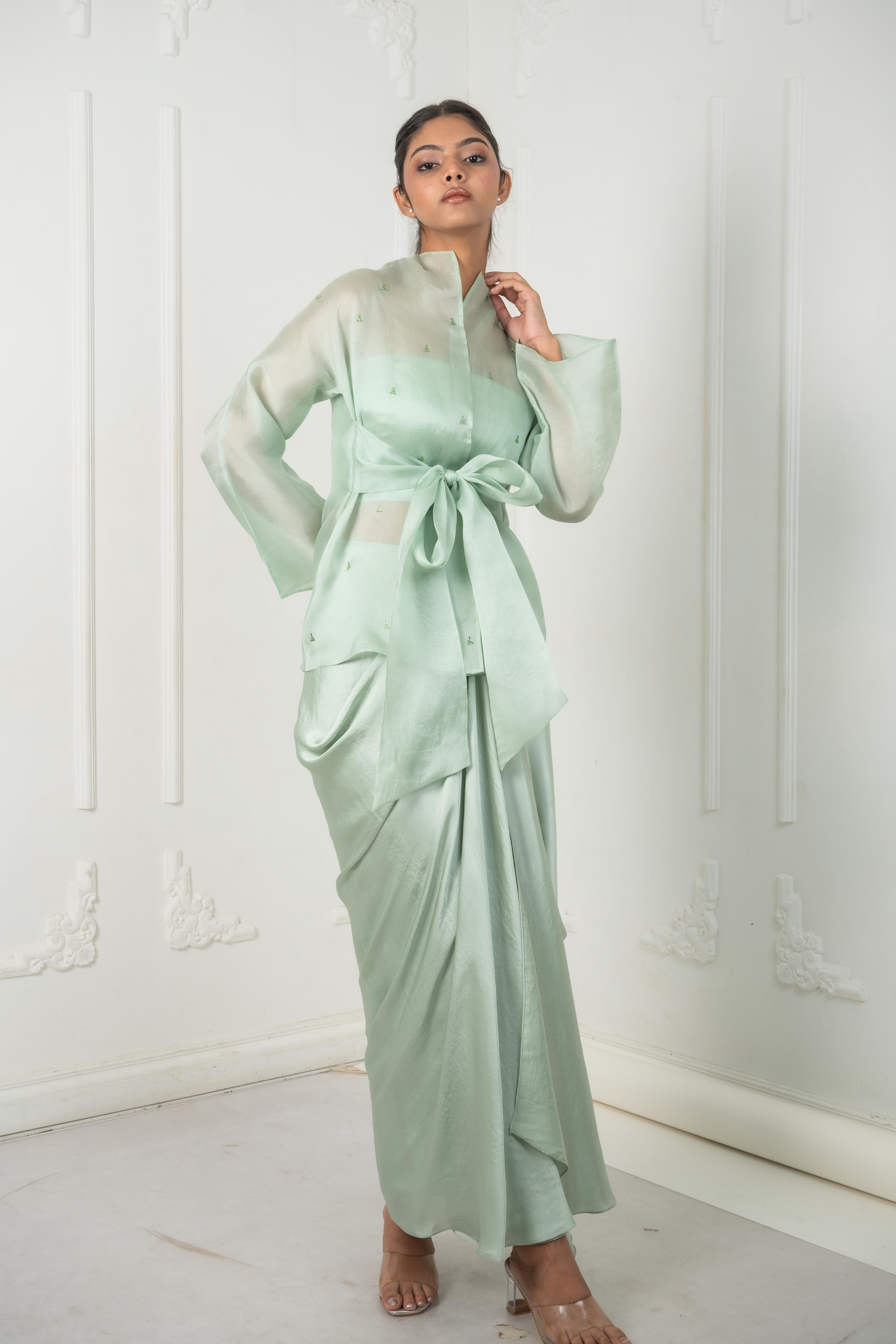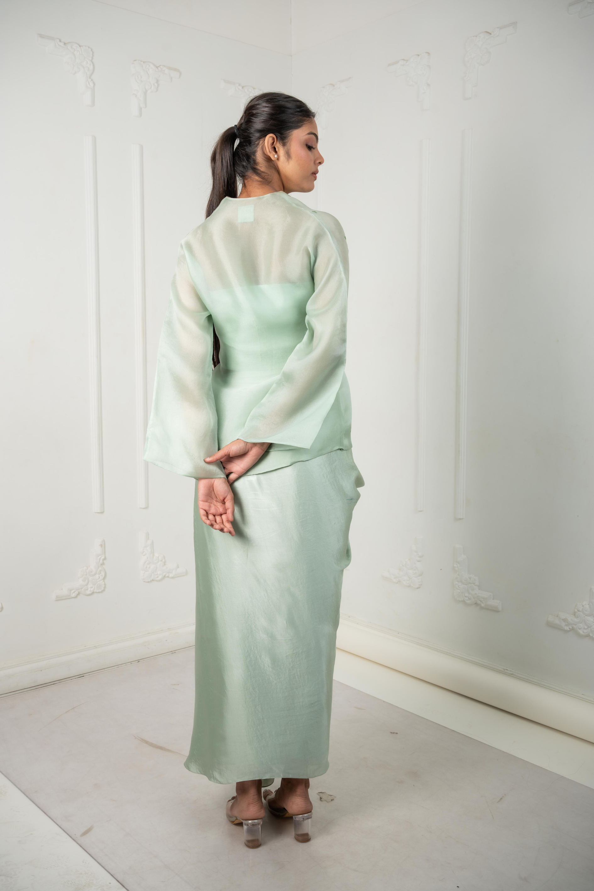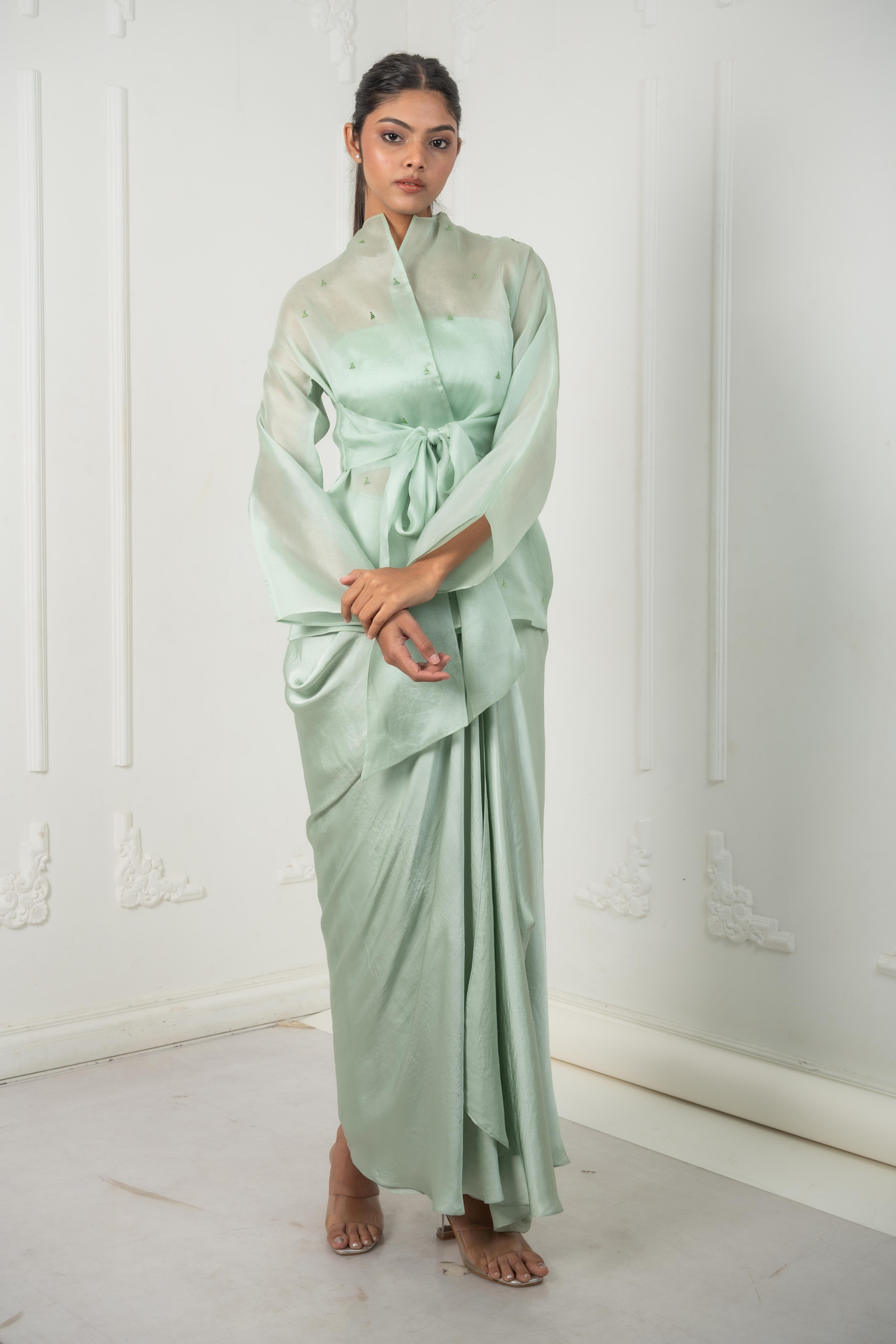Like twilight in motion, it glows softly—elegant, effortless, unforgettable.A love letter to elegant dressing, Daphne is the designer’s personal favourite—full of charm and just a hint of drama. The fluid sage green organza top ties into a soft bow, paired with a satin dropped skirt that flows with quiet grace. Scattered crystals shimmer like stardust, with minimal embroidery that lets every detail breathe.