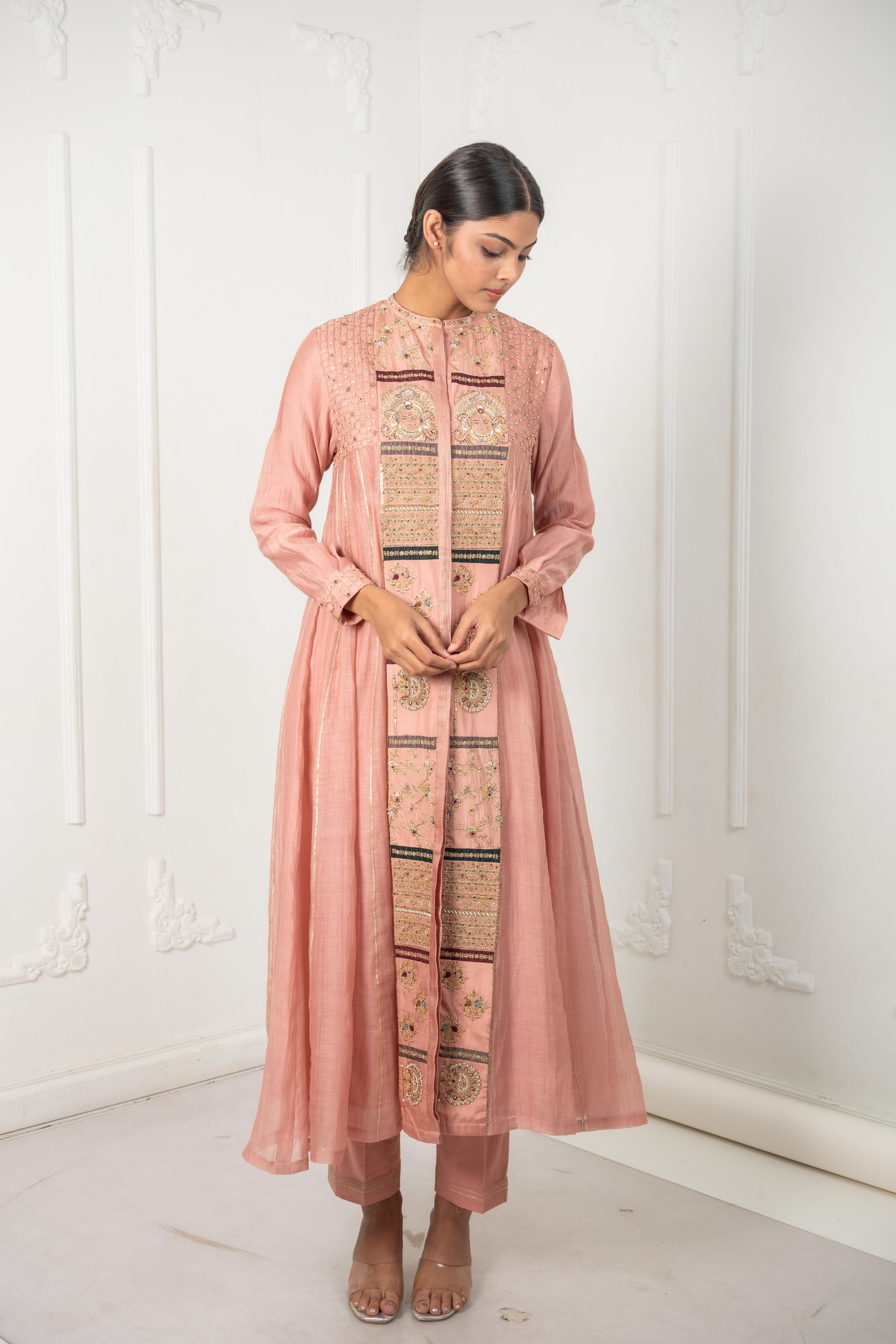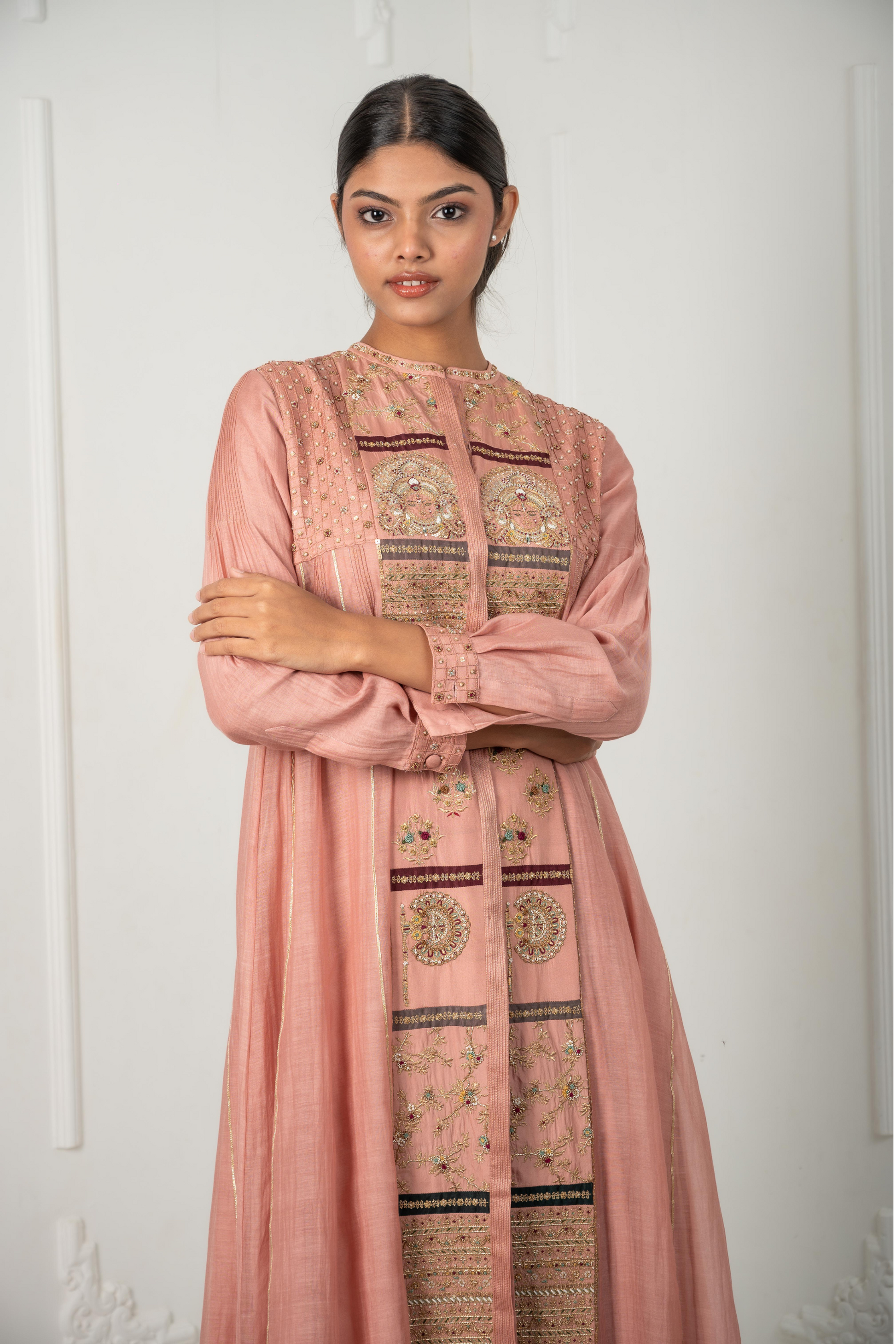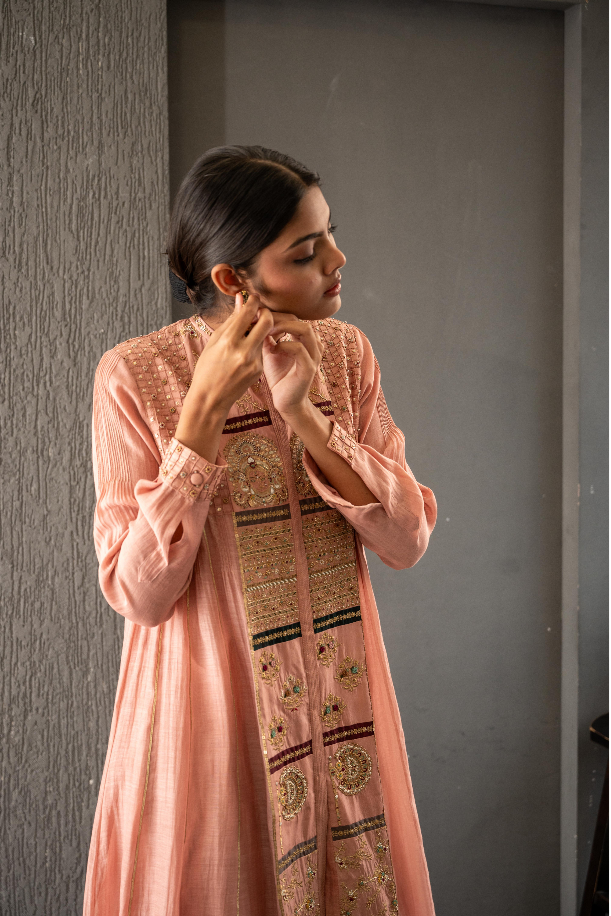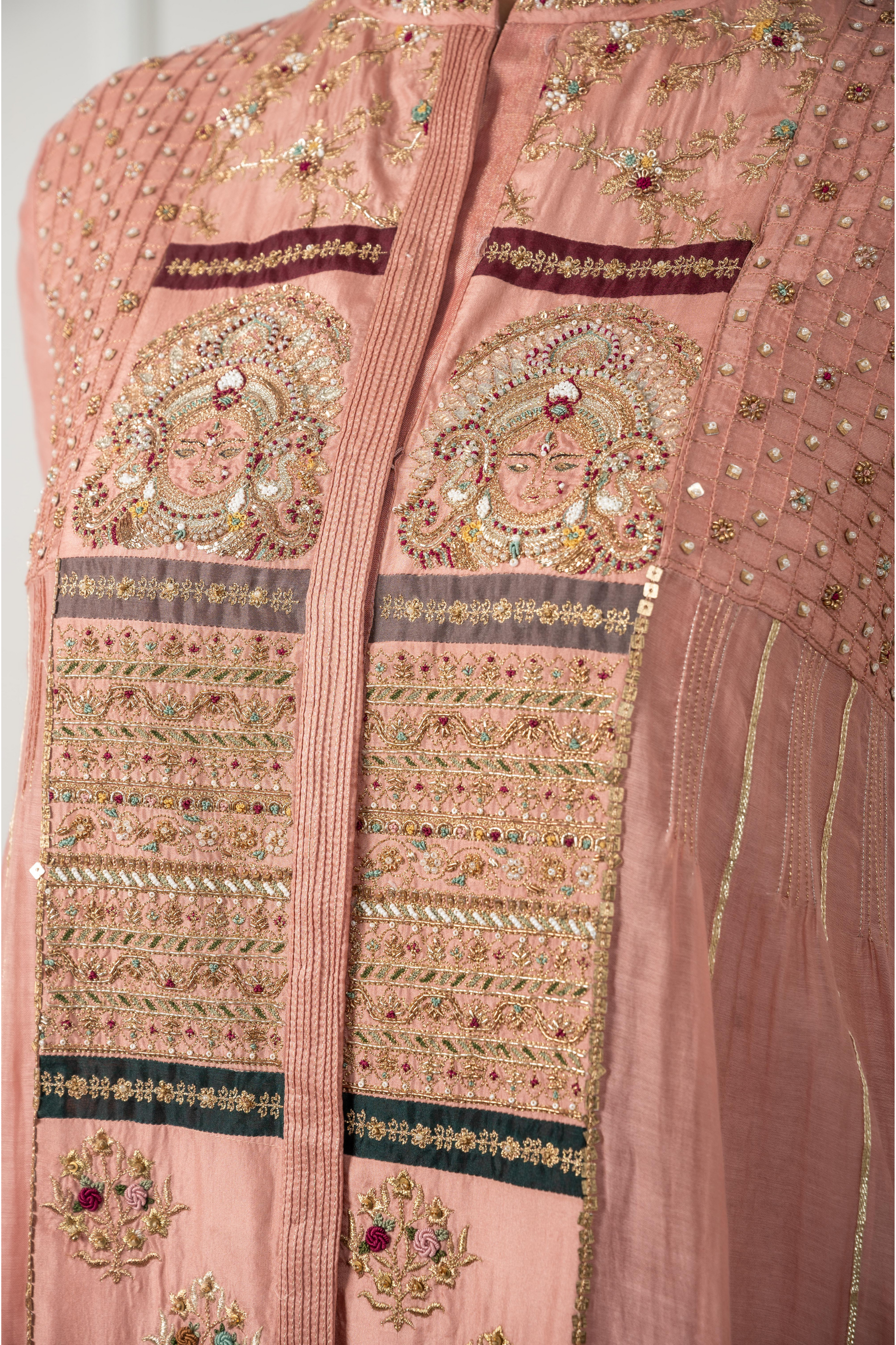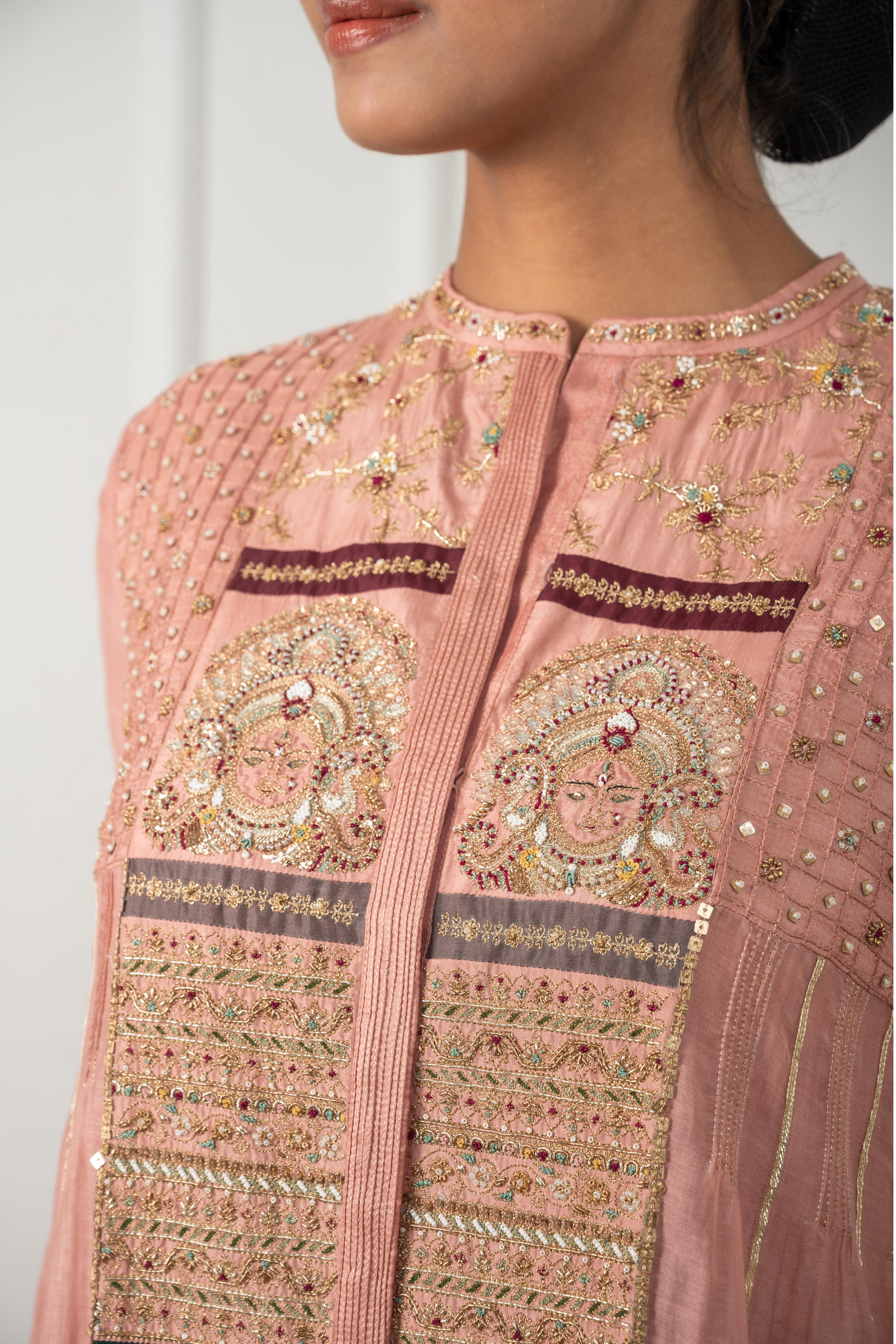 The Devi is a tribute to the goddess within every woman - an ode to femininity in its most graceful form. Crafted in pink nude hues of chanderi, mulmul, and silk, this kalidaar features an embroidered front panel adorned with motifs of Devi and Pankhi, reflecting intricate traditional artistry. The shoulder sparkles softly with checkered pintucks, gold beads, and sequins, while side panels are finished with subtle gota. Perfect for sacred celebrations, temple visits, or moments when you wish to honour your feminine spirit.