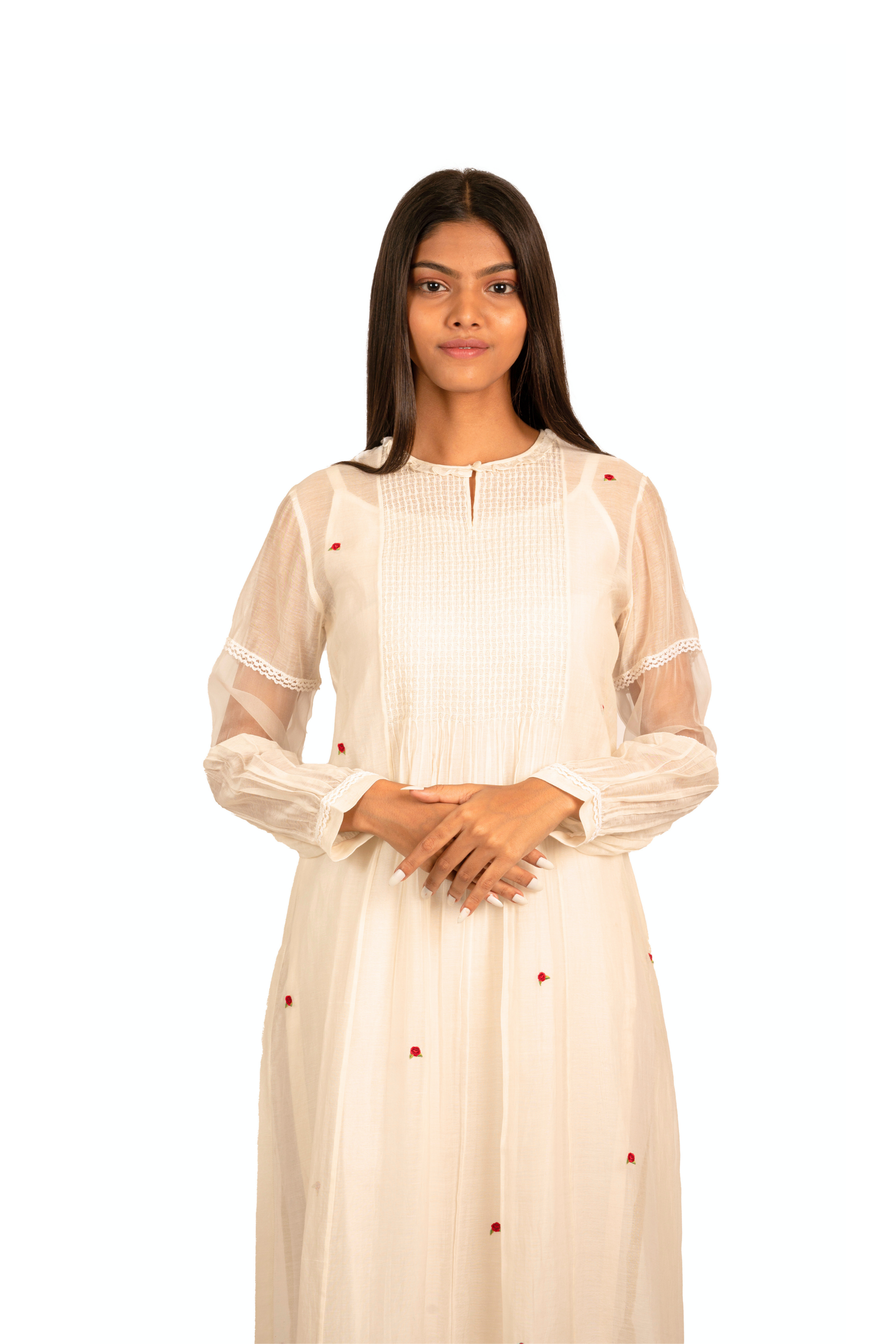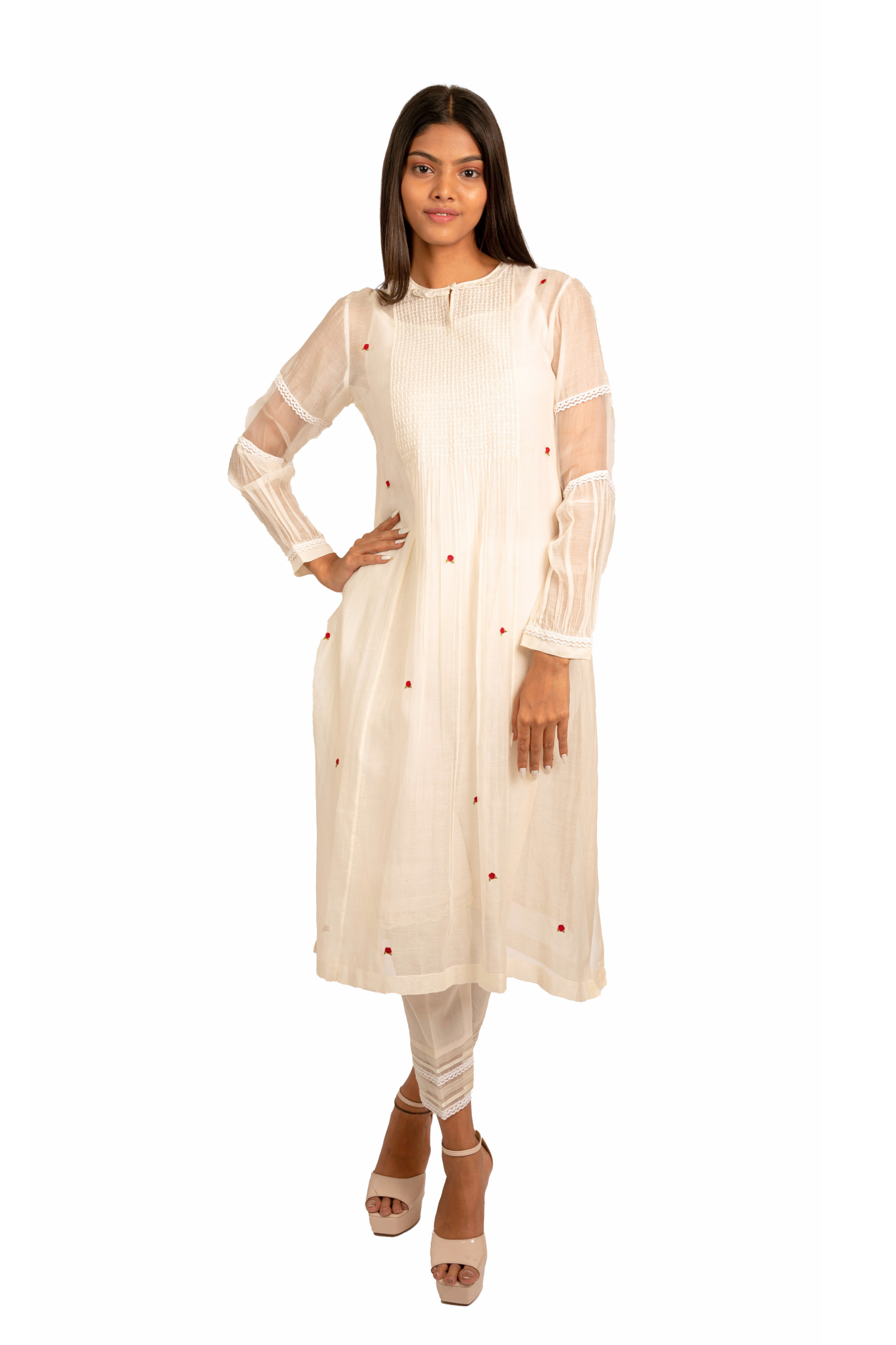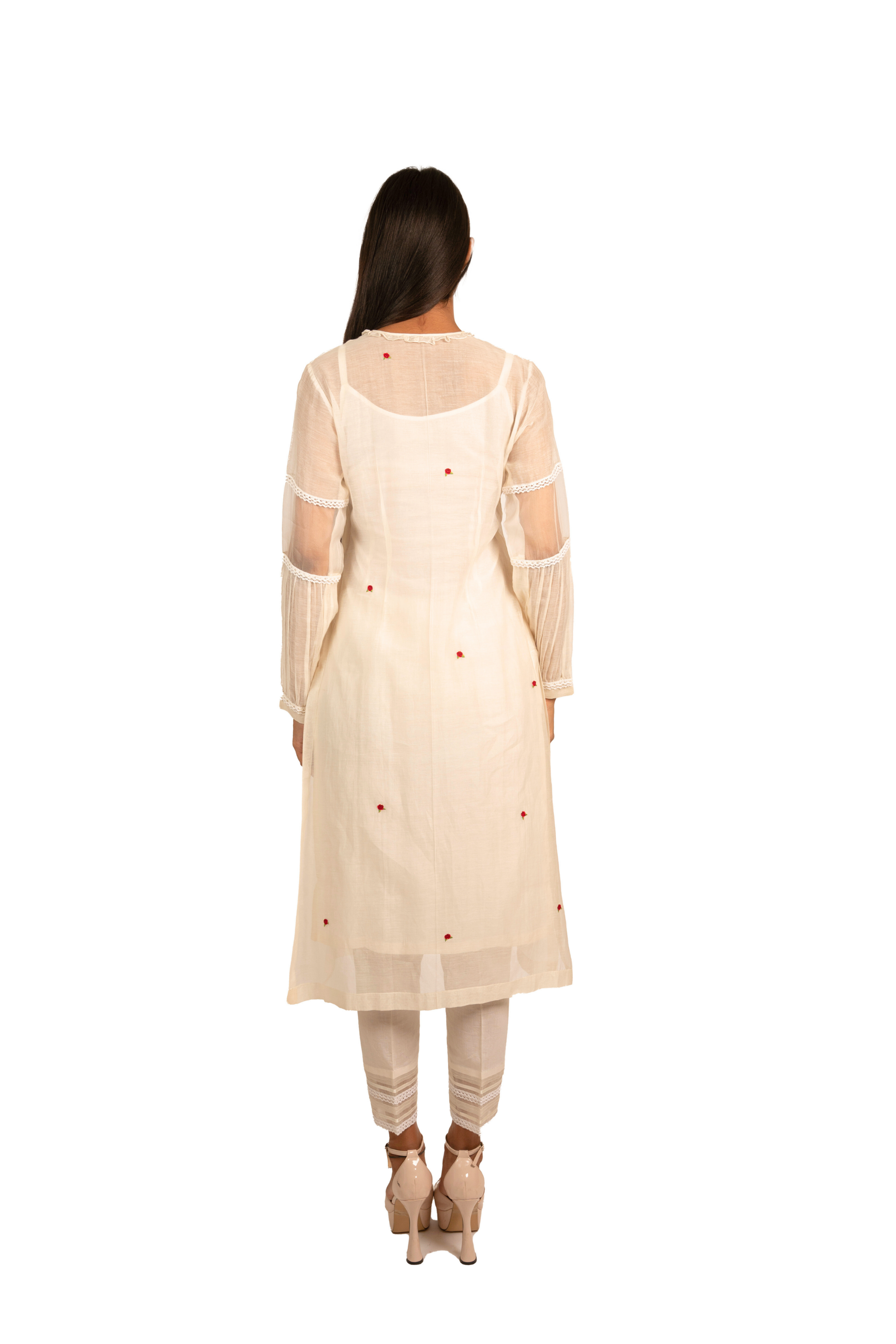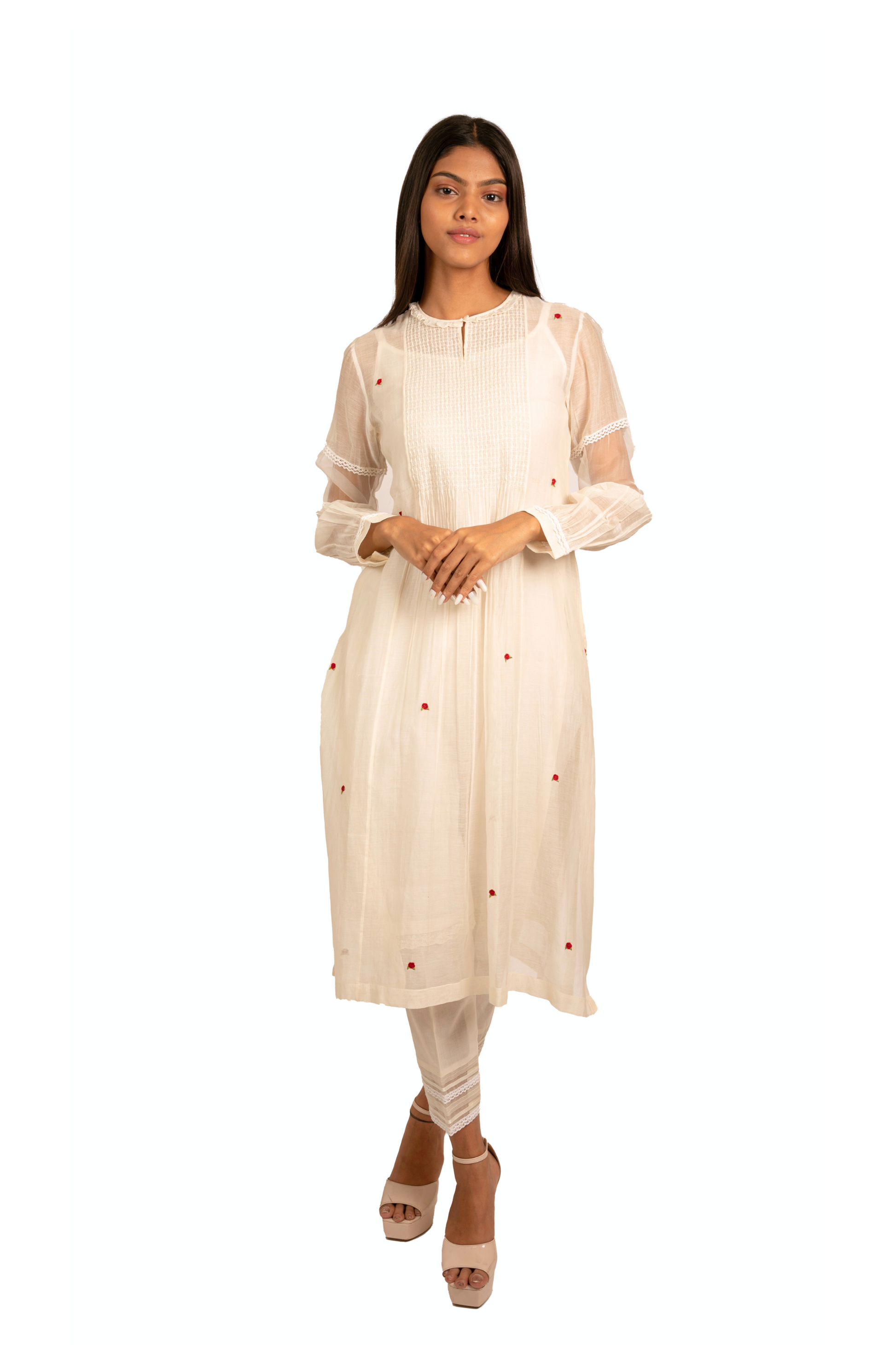 The Rosa – A tender tribute to the flower of love, this ivory chanderi mulmul tunic is scattered with dainty rose motifs that bloom softly across its surface. The yoke features very fine twisted pleats, while the sleeves are adorned with lace and sheer organza, adding a dreamy finish. A timeless summer favorite, full of grace and ease.