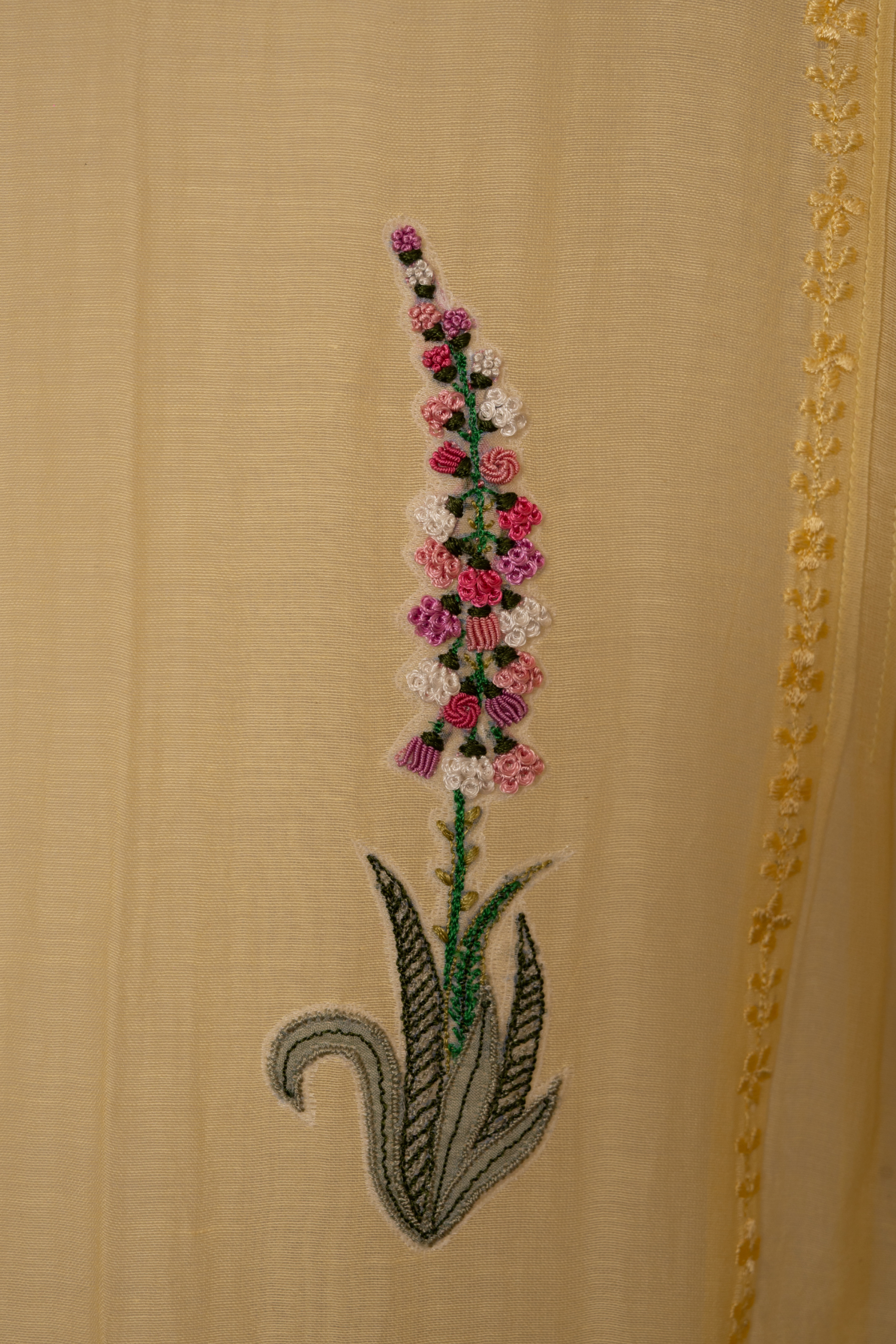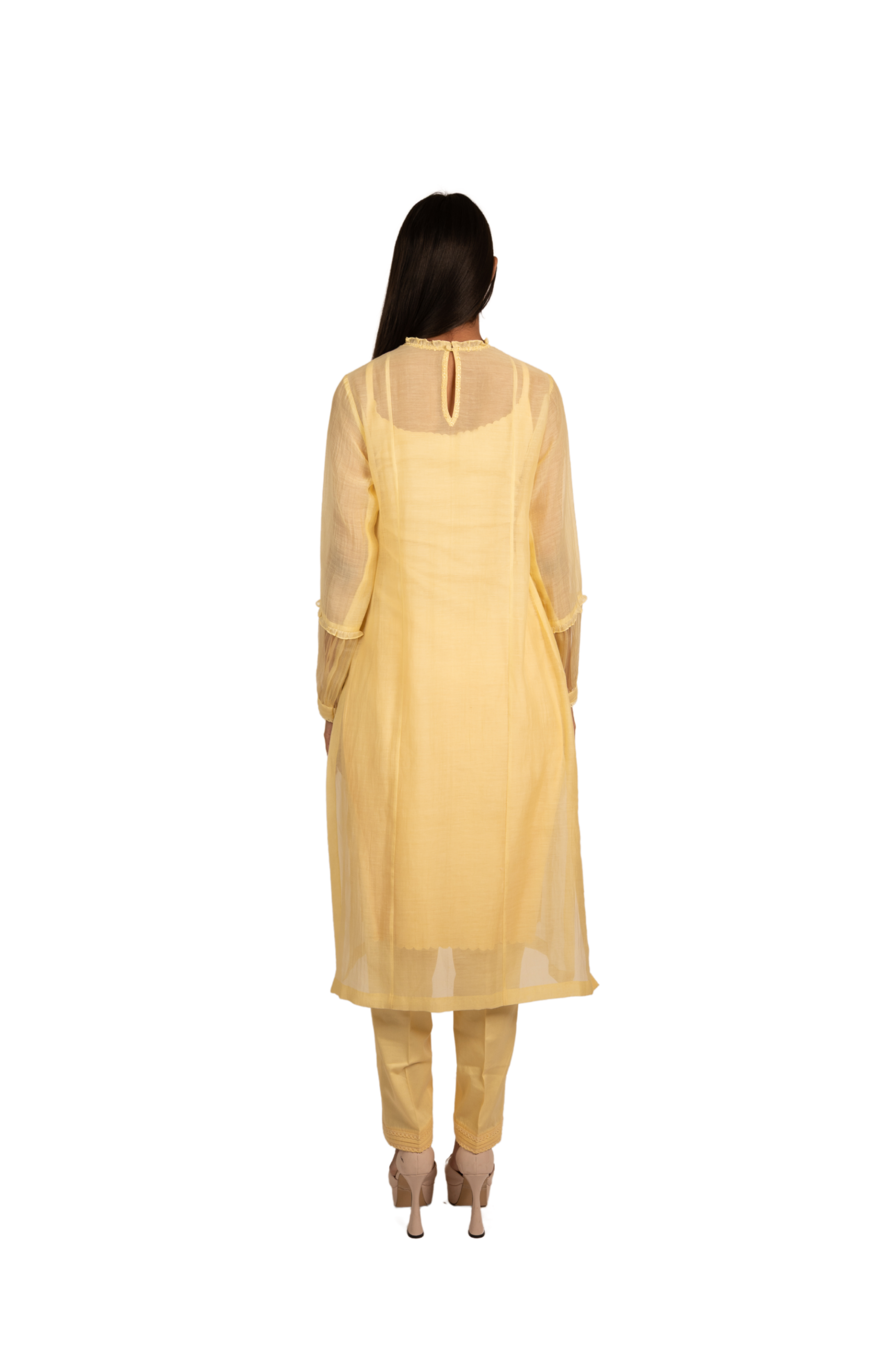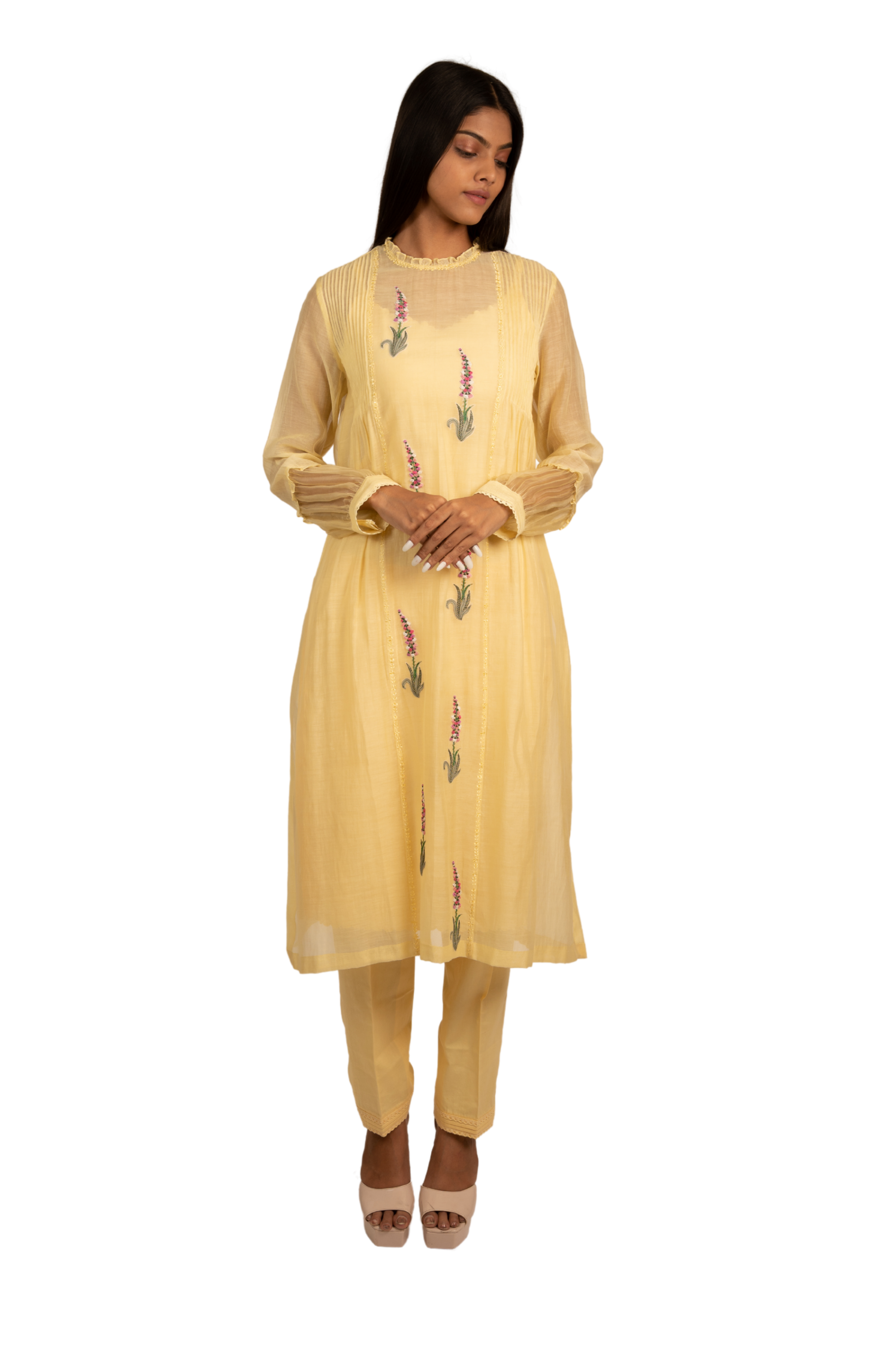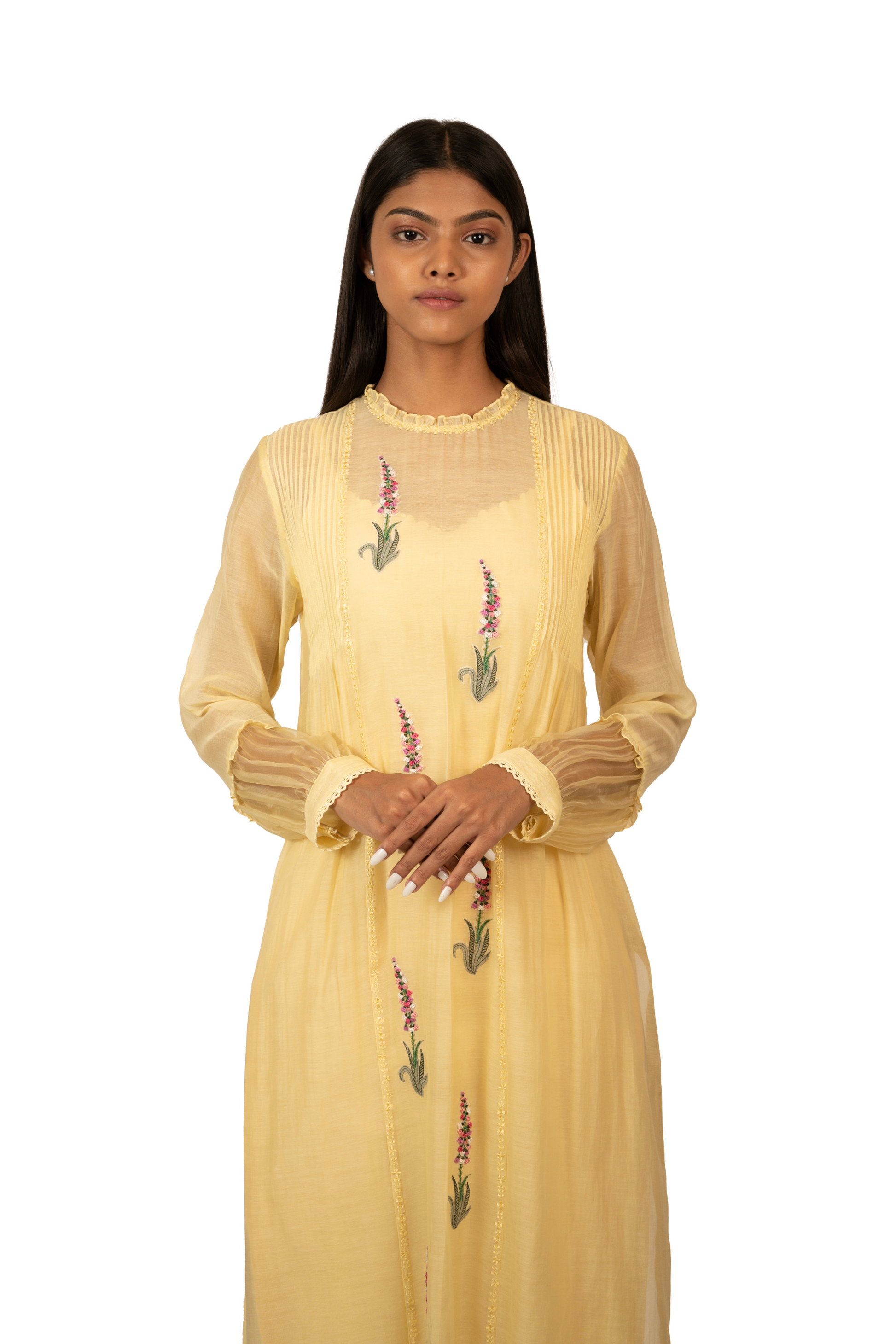This yellow chanderi tunic captures the warmth of sitting by the lake. Hand-embroidered blooms in delicate shades of pink blossom across the fabric, while sheer organza and lace-trimmed sleeves add a soft, romantic finish. Inspired by quiet memories of flowers and sunlit shores is perfect for garden brunches, holiday strolls, or dreamy summer getaways.