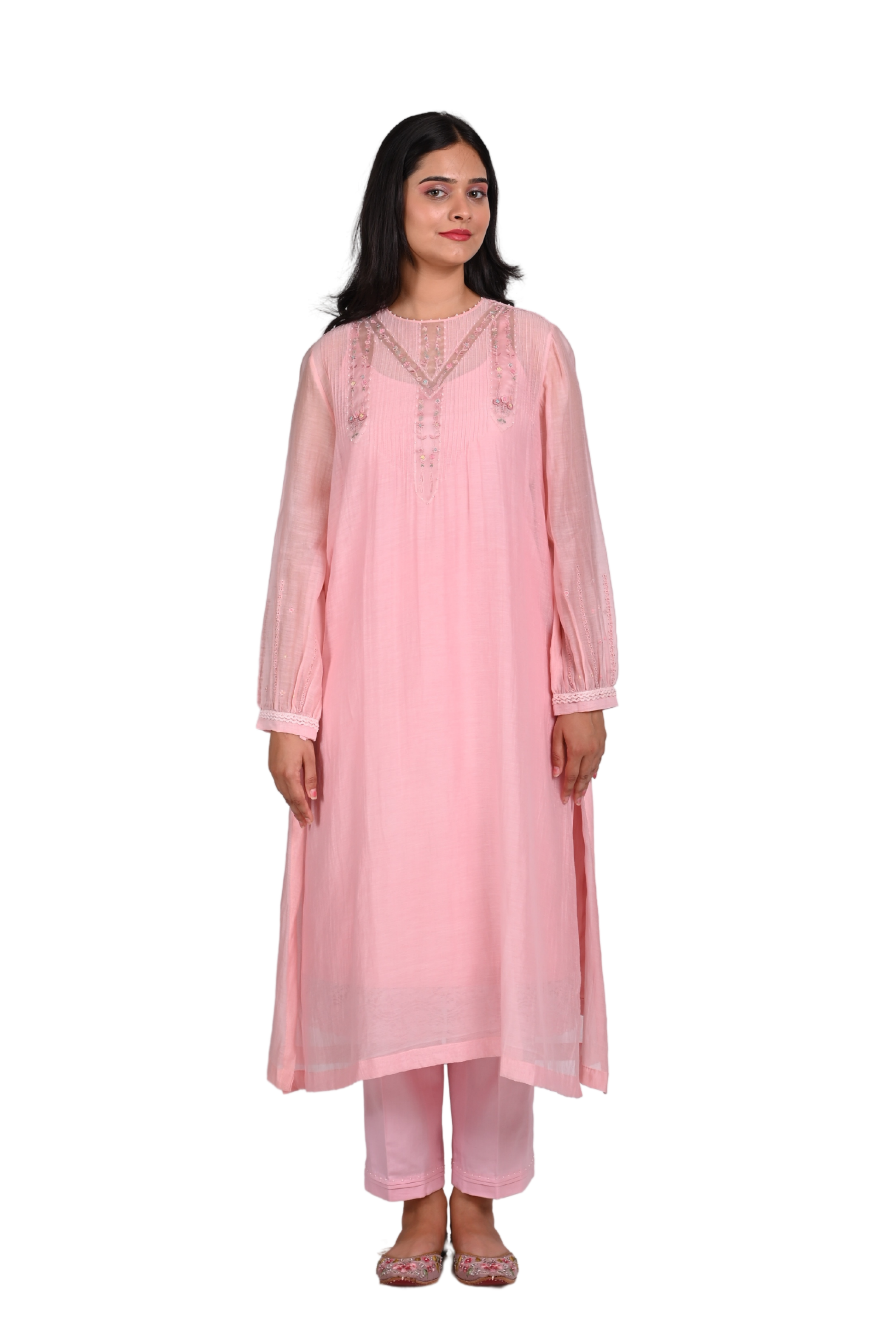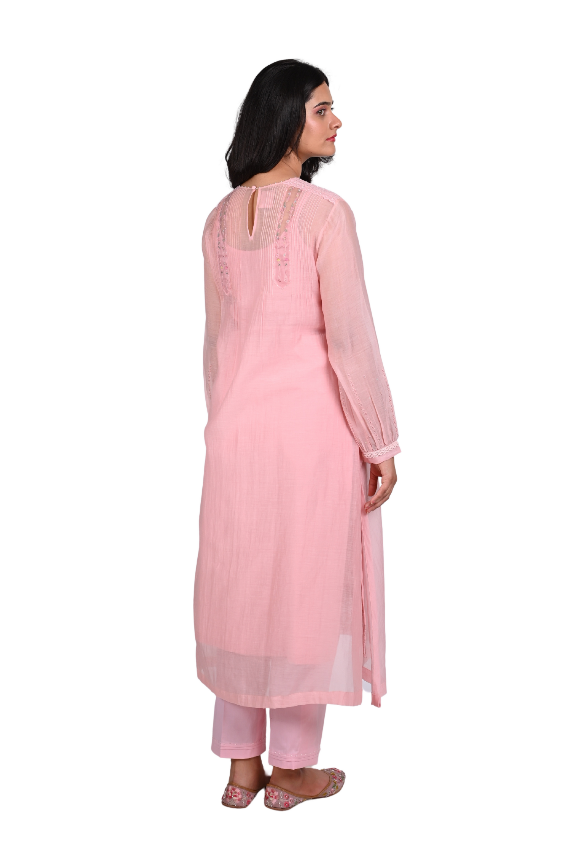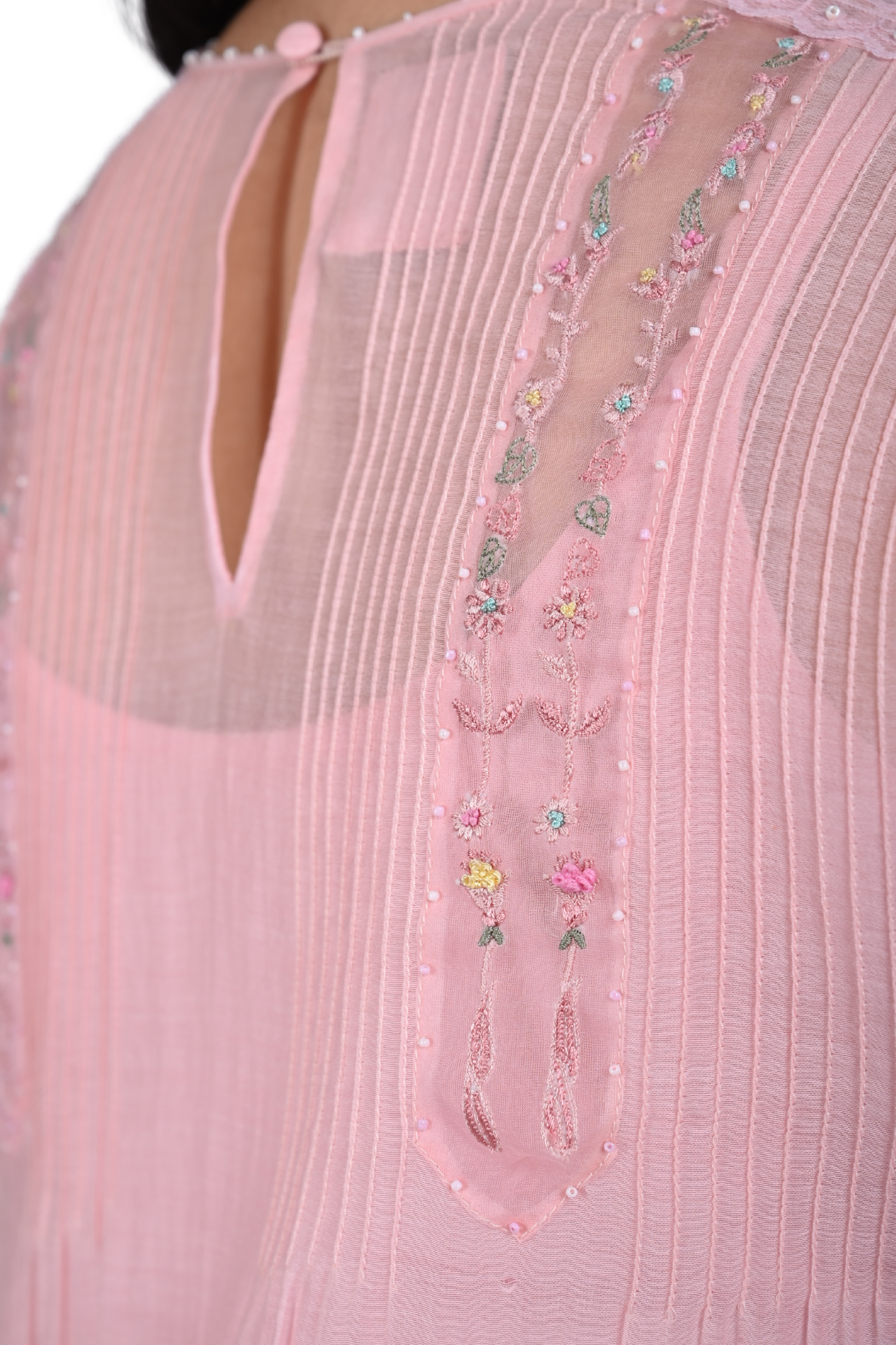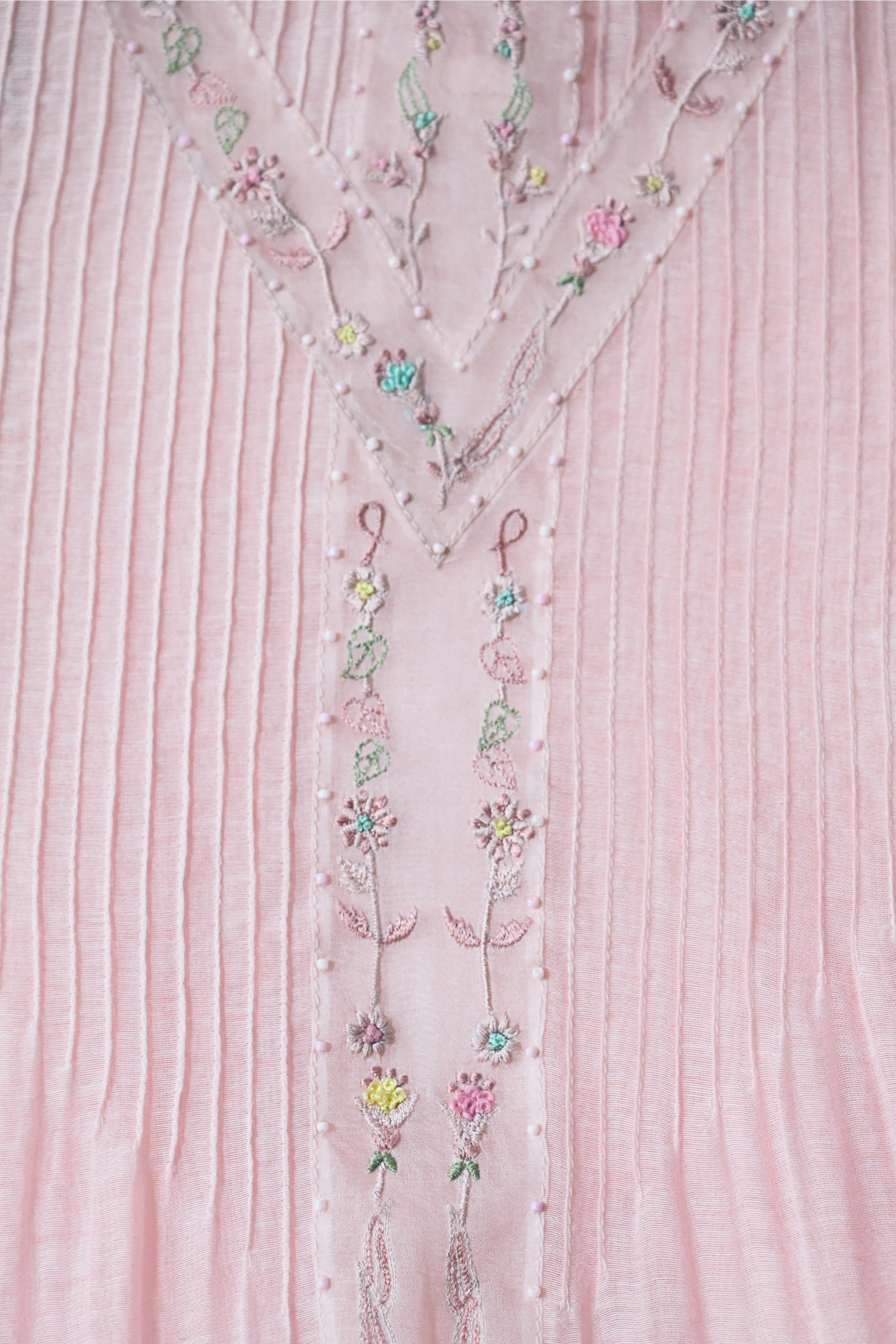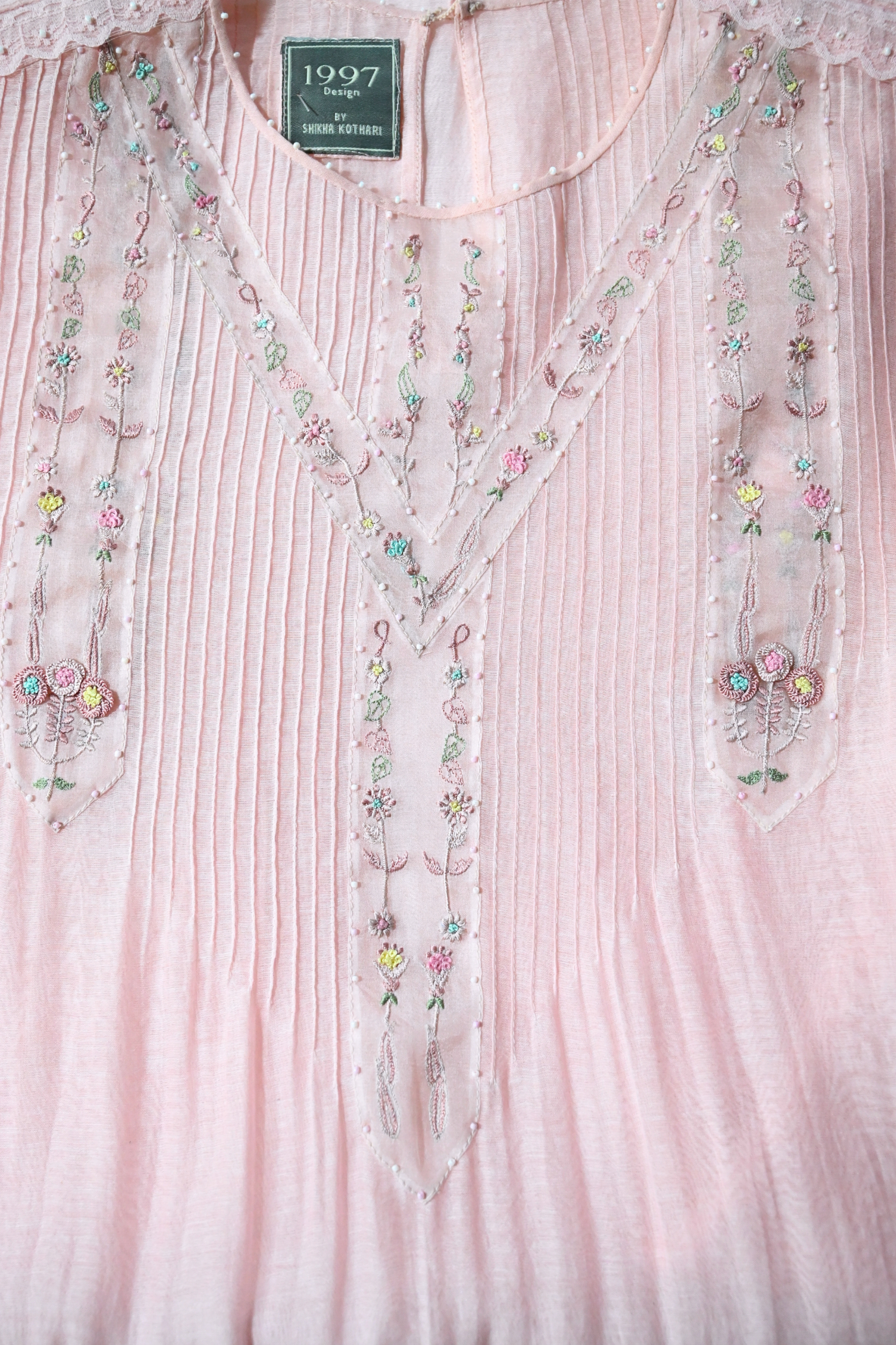 The Admire tunic in baby pink has balanced organza insets—shaped in a V and vertical line—creating a calm, geometric harmony.. Tonal floral embroidery blooms gently with accents of colour, while fine pintucks add a linear texture to soft chanderi.
