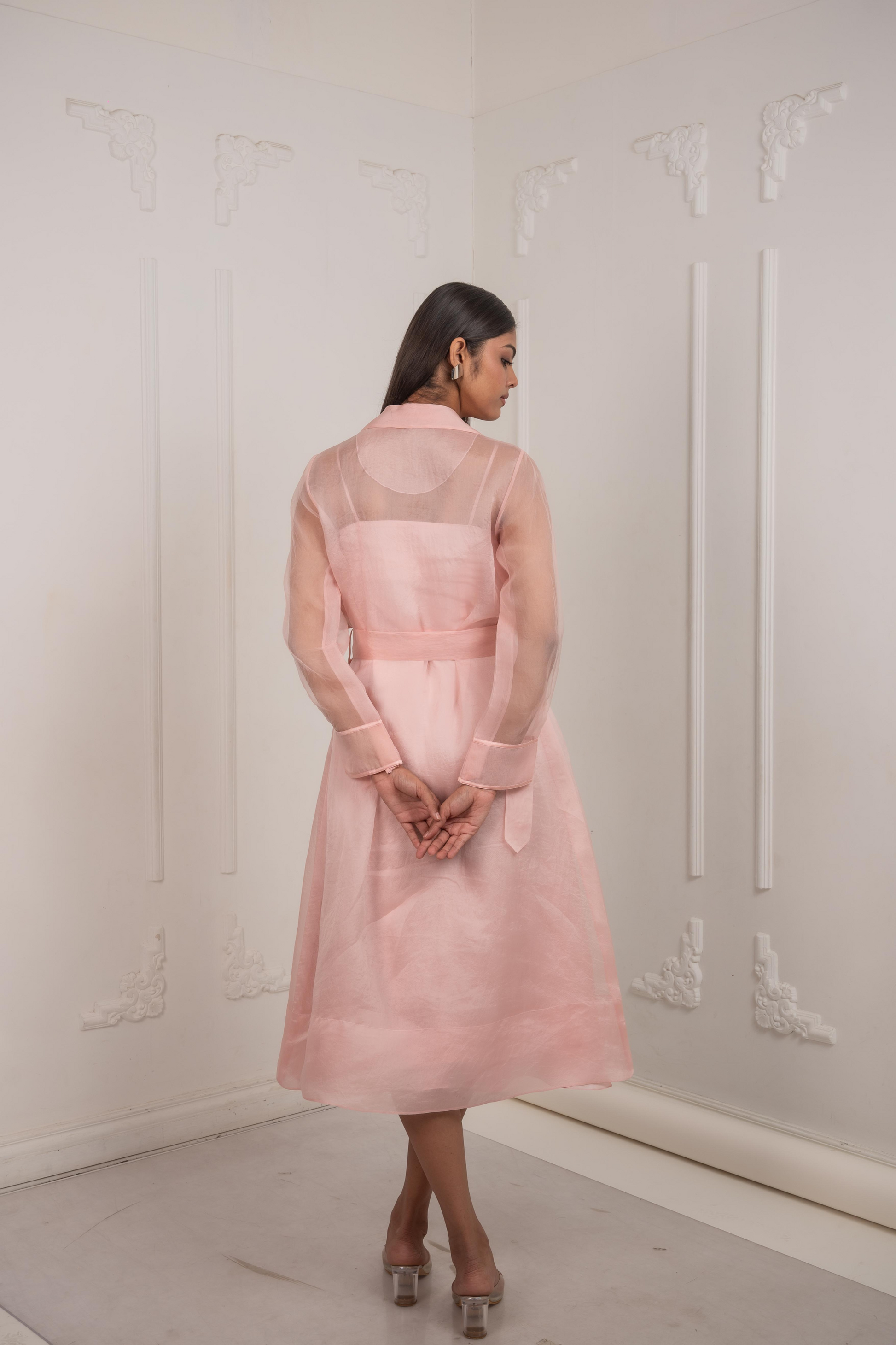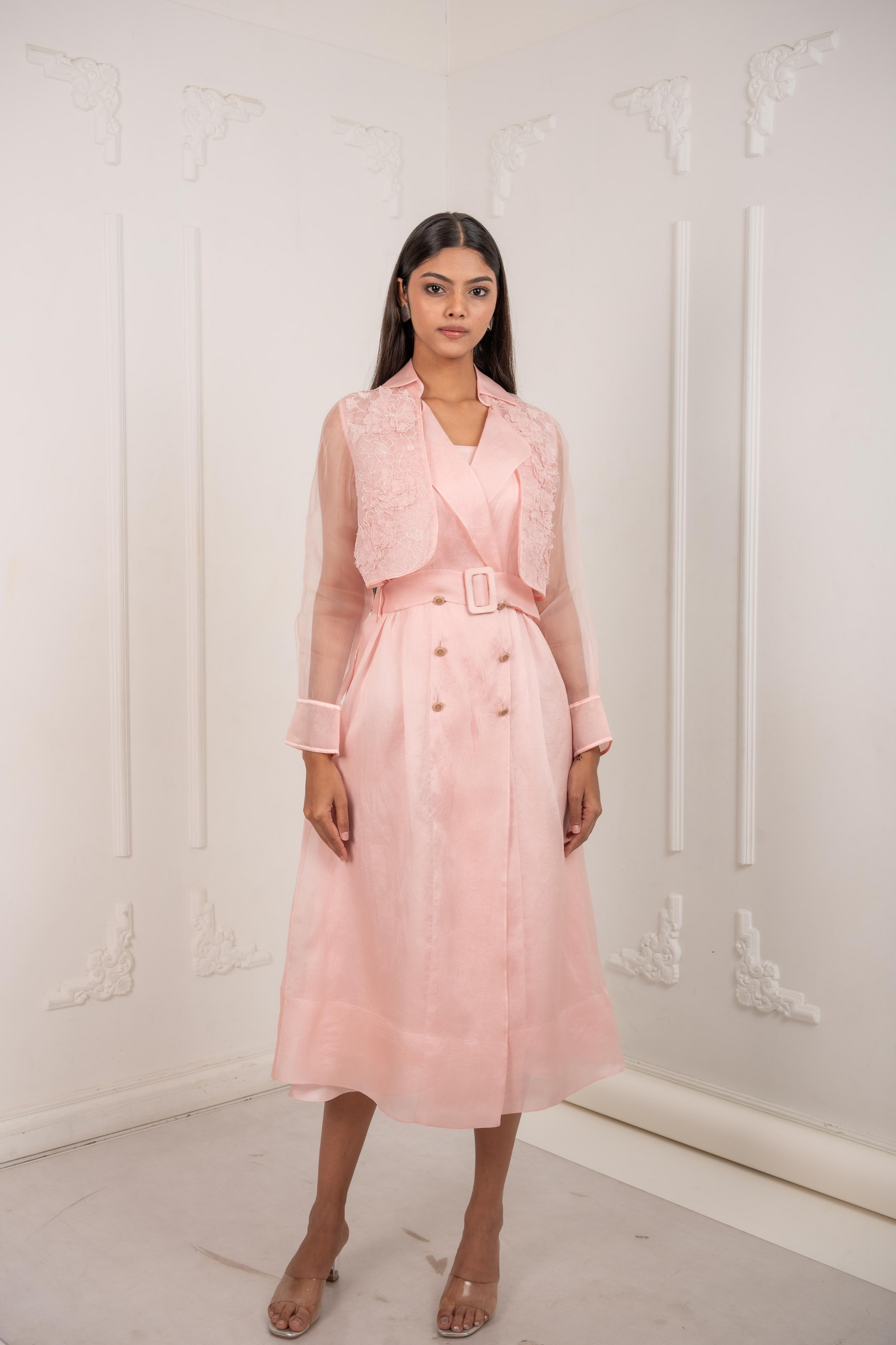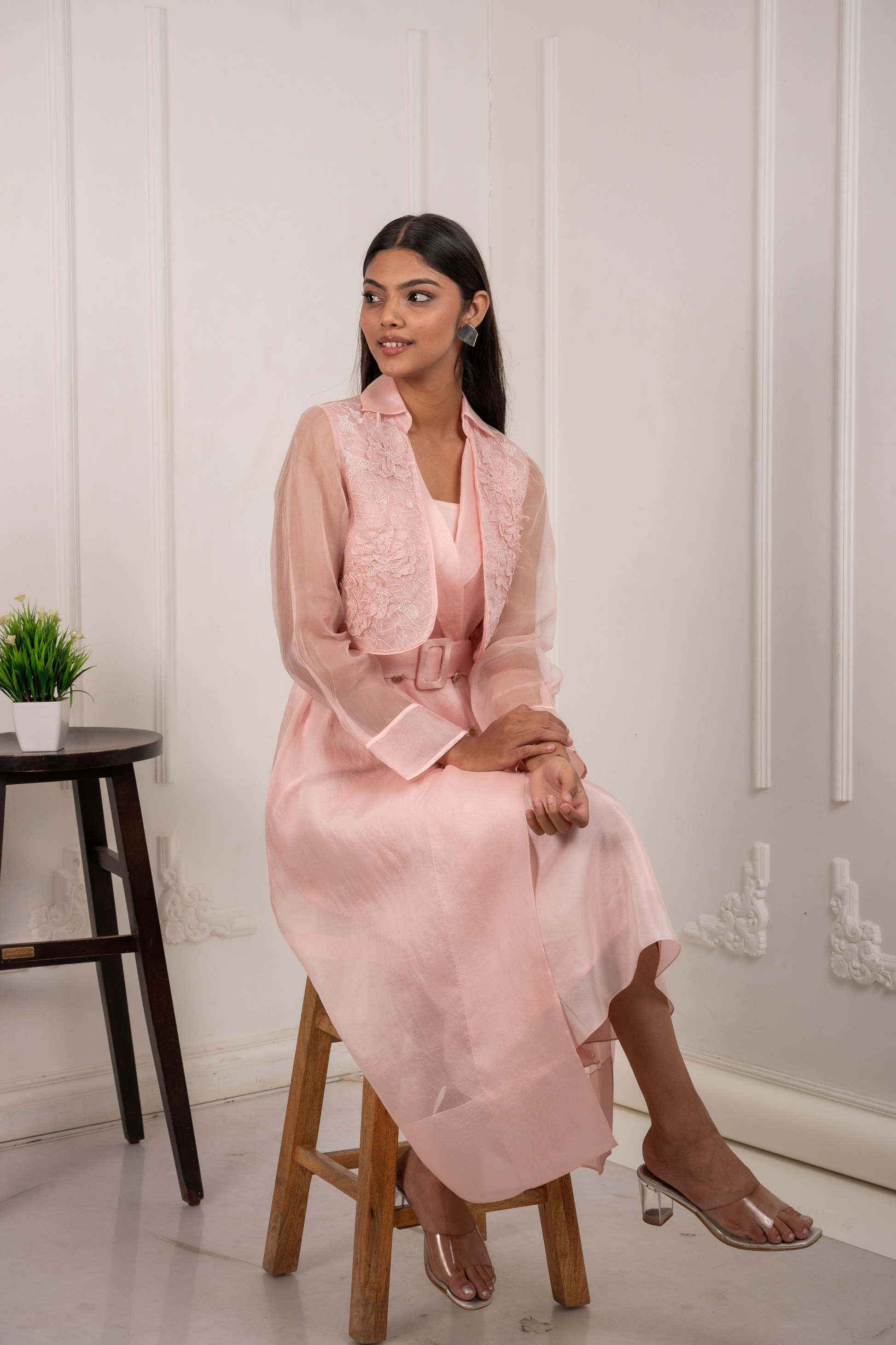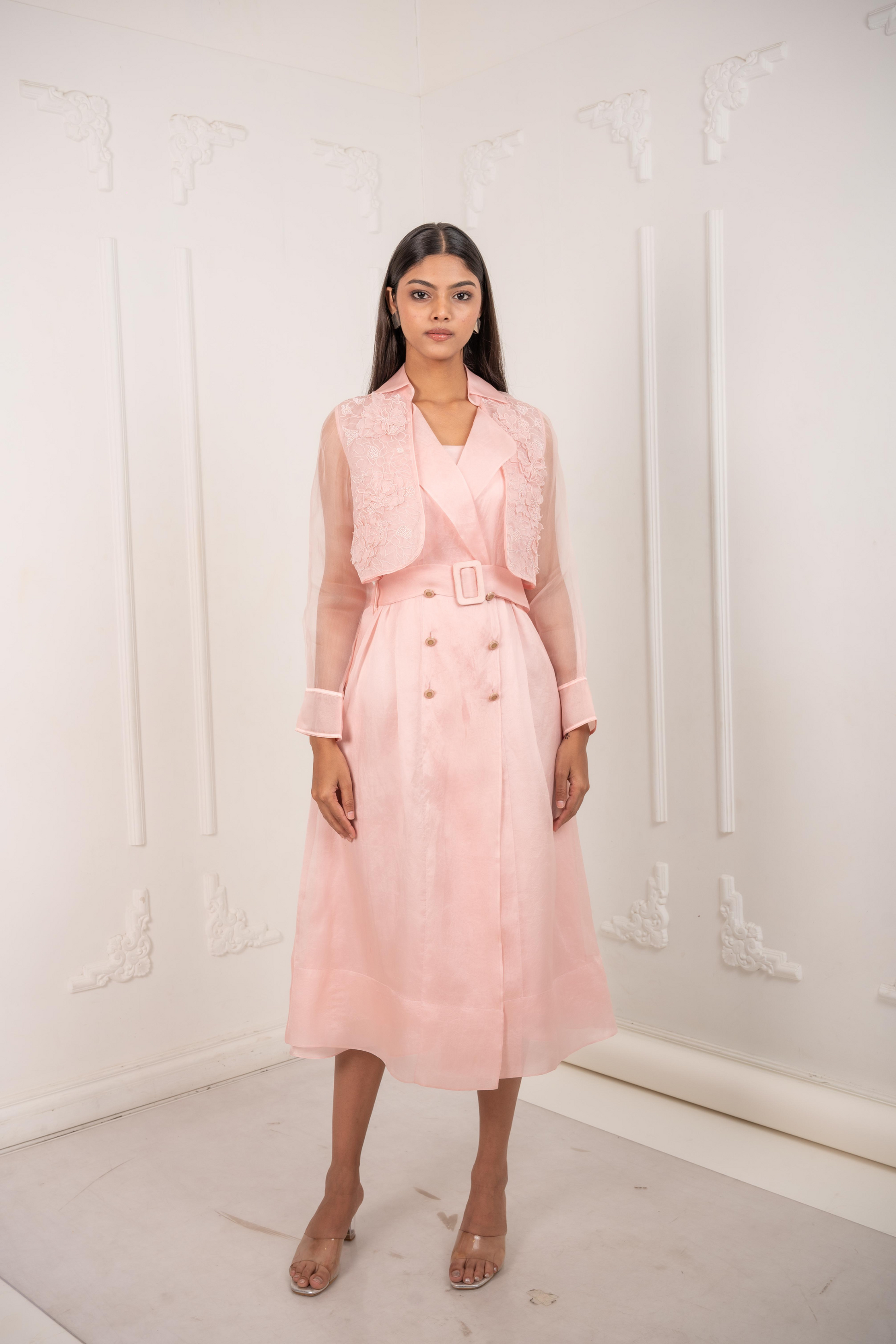 Like a love letter from Paris, it wraps you in grace and quiet beauty. The Adora coat is a romantic reimagining of a classic French silhouette—crafted entirely in dreamy baby pink organza. Delicate tonal embroidery blooms with soft 3D florals, raised petals, and subtle beading that catch the light with every move. With a structured collar and tailored fit, it's elegance, whispered.
