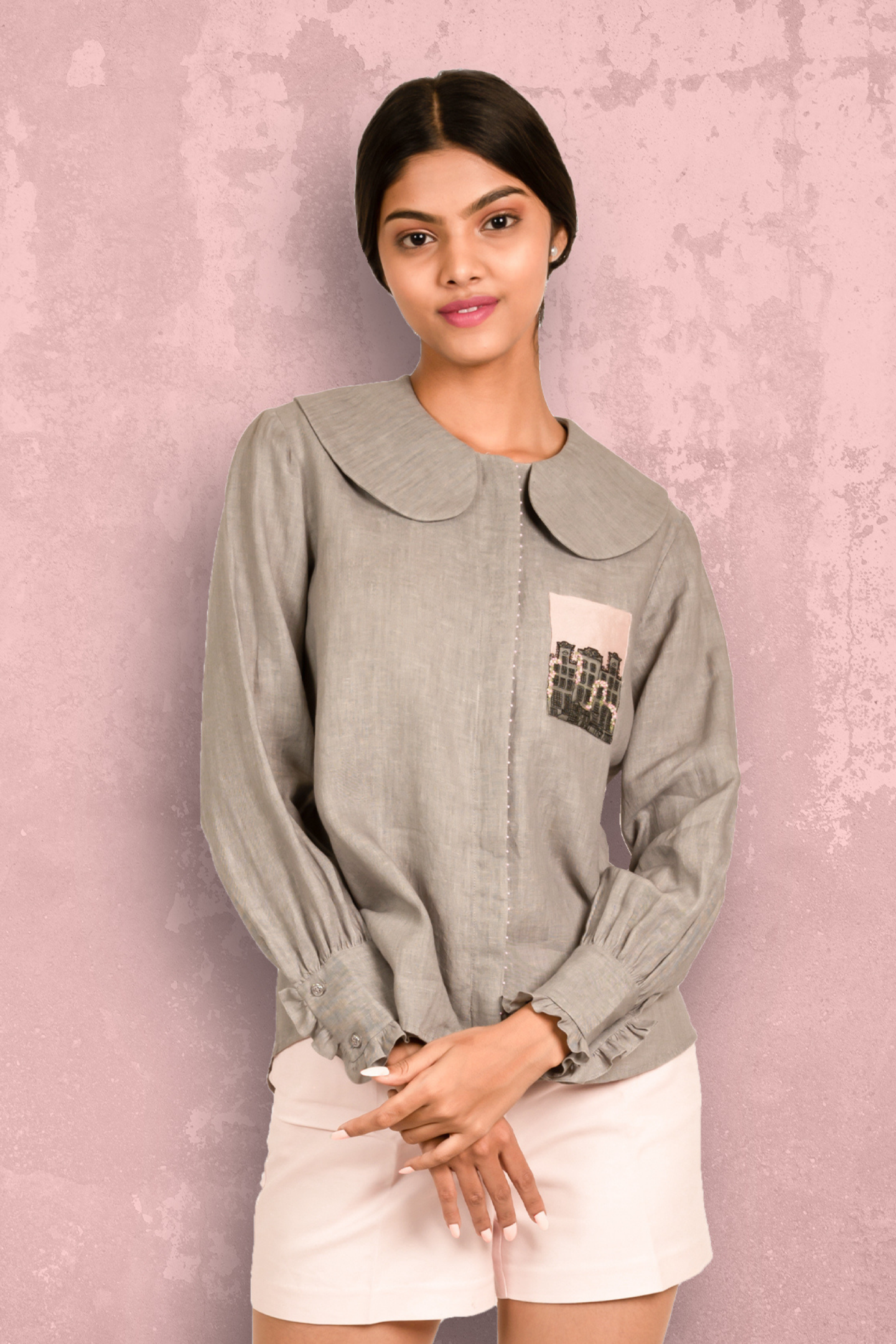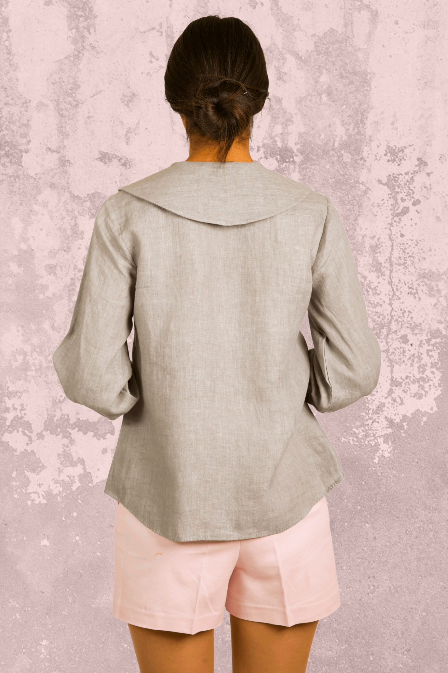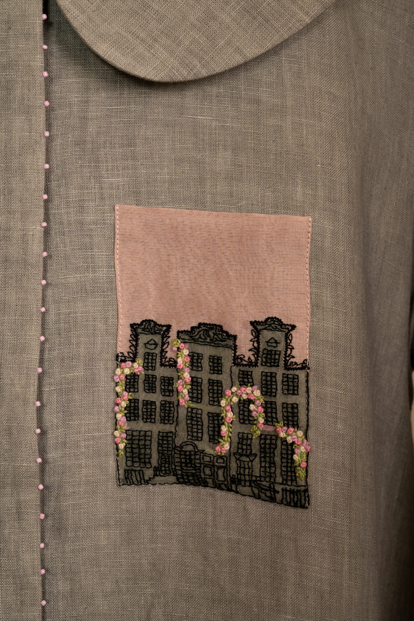 This Pure Grey linen tunic is designed to remind you of your Dutch holiday. A dainty organza pocket embroidered with Dutch row houses and forget-me-not flowers captures the charm of the city, while a classic Dutch collar and delicate bead detailing complete the look with quiet elegance. A wistful nod to cobbled streets and canal-side mornings which is perfect for travel days, coffee catch-ups, or a gallery afternoon.