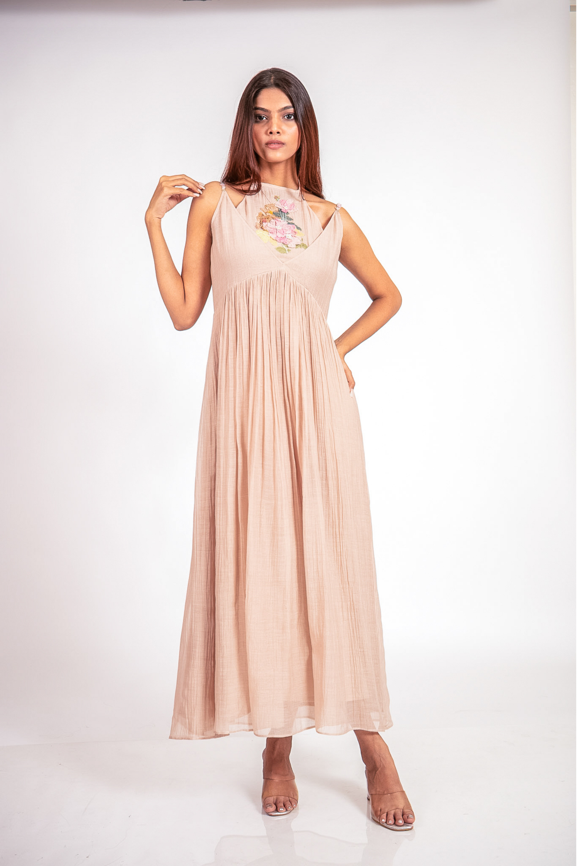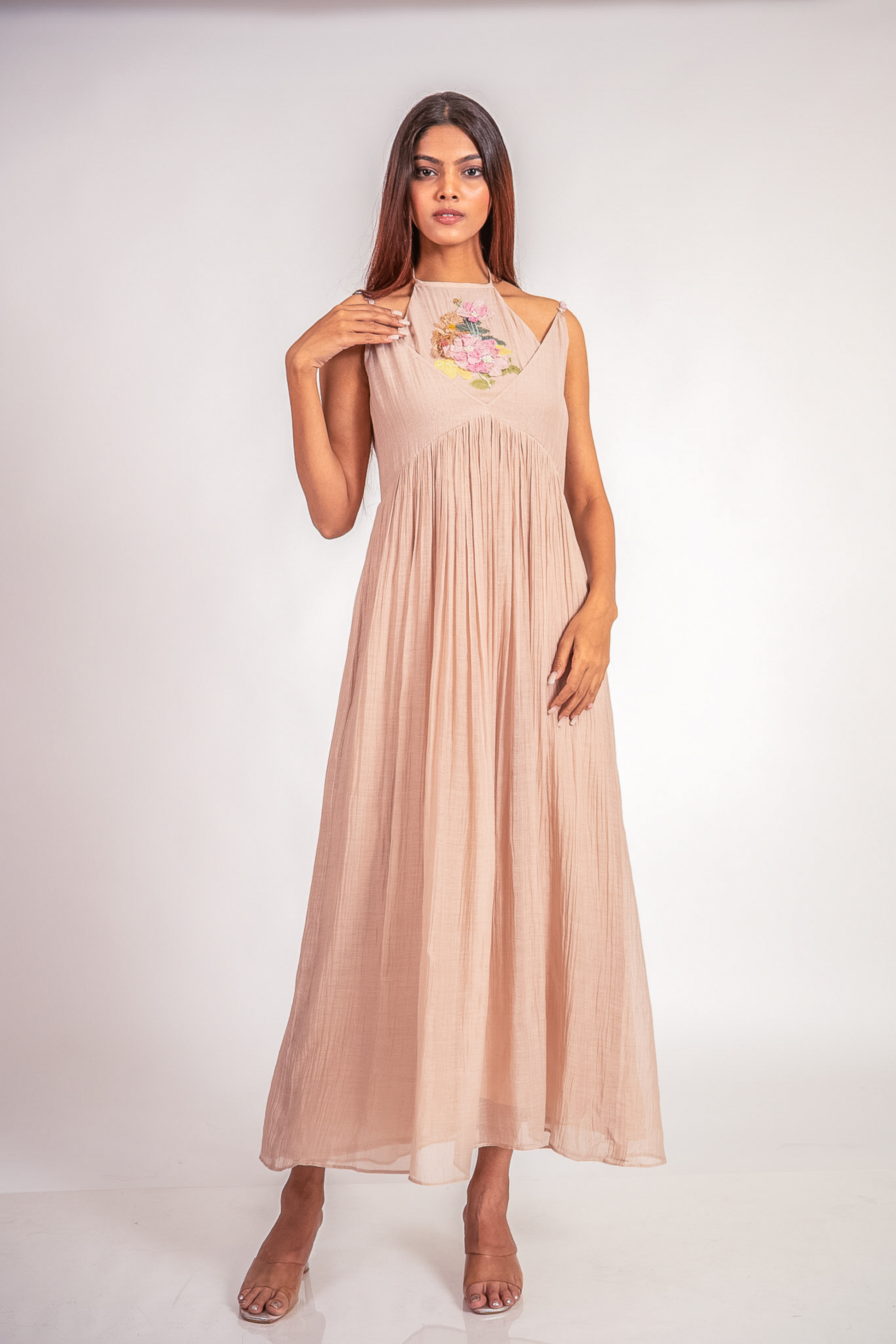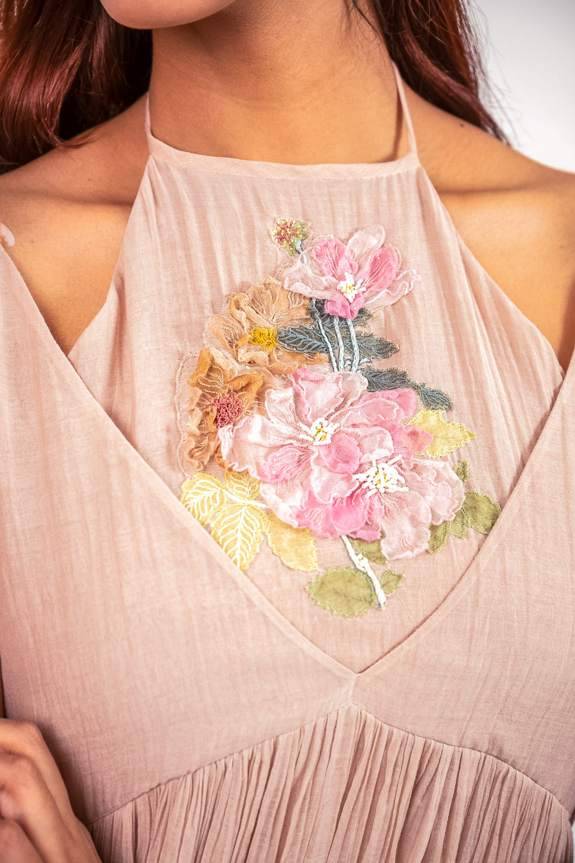 "A nude halter maxi dress featuring the delicate Dainty Beis rose in 3D floral embroidery. Light and flowing, the silhouette moves with grace.