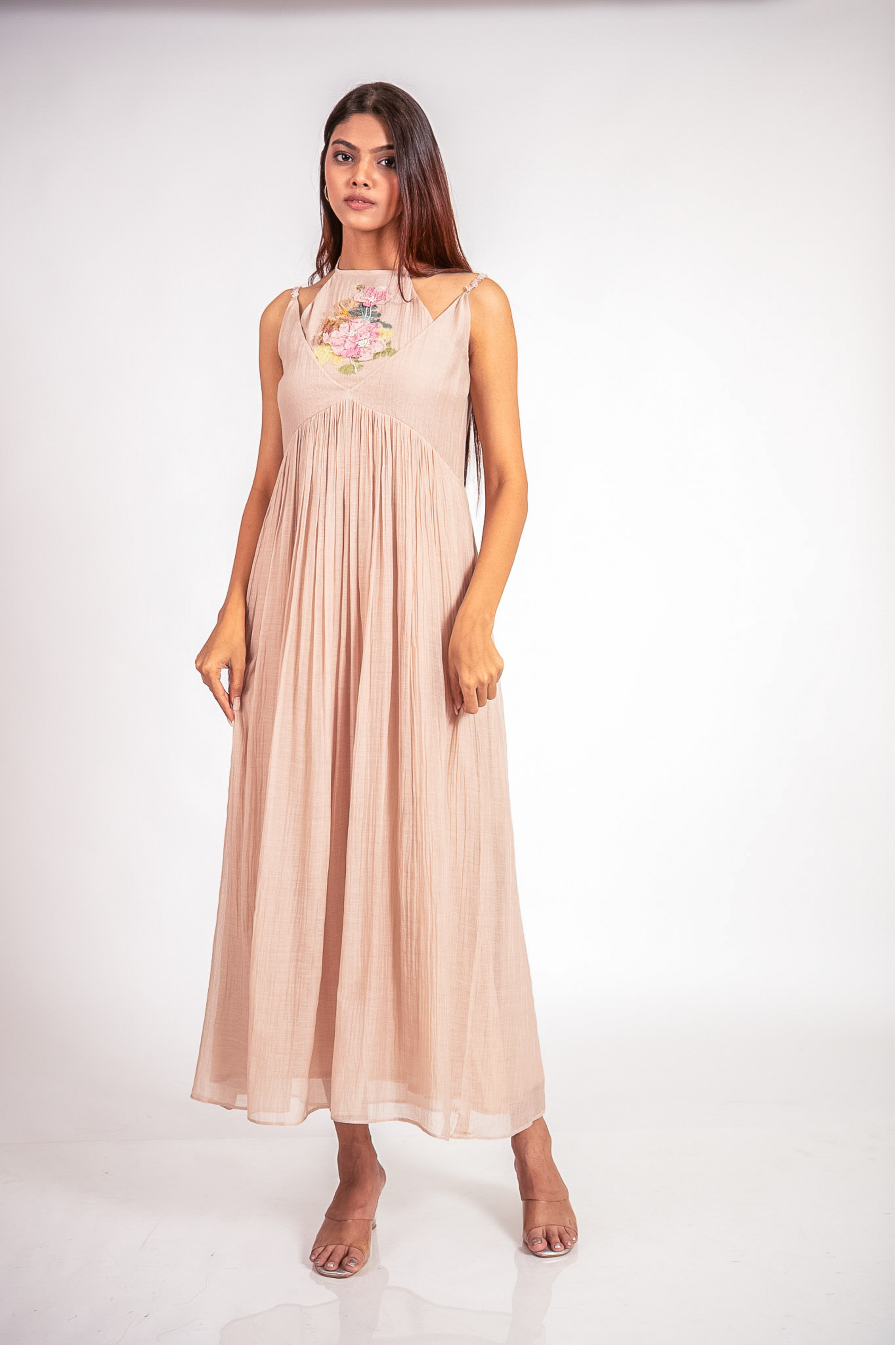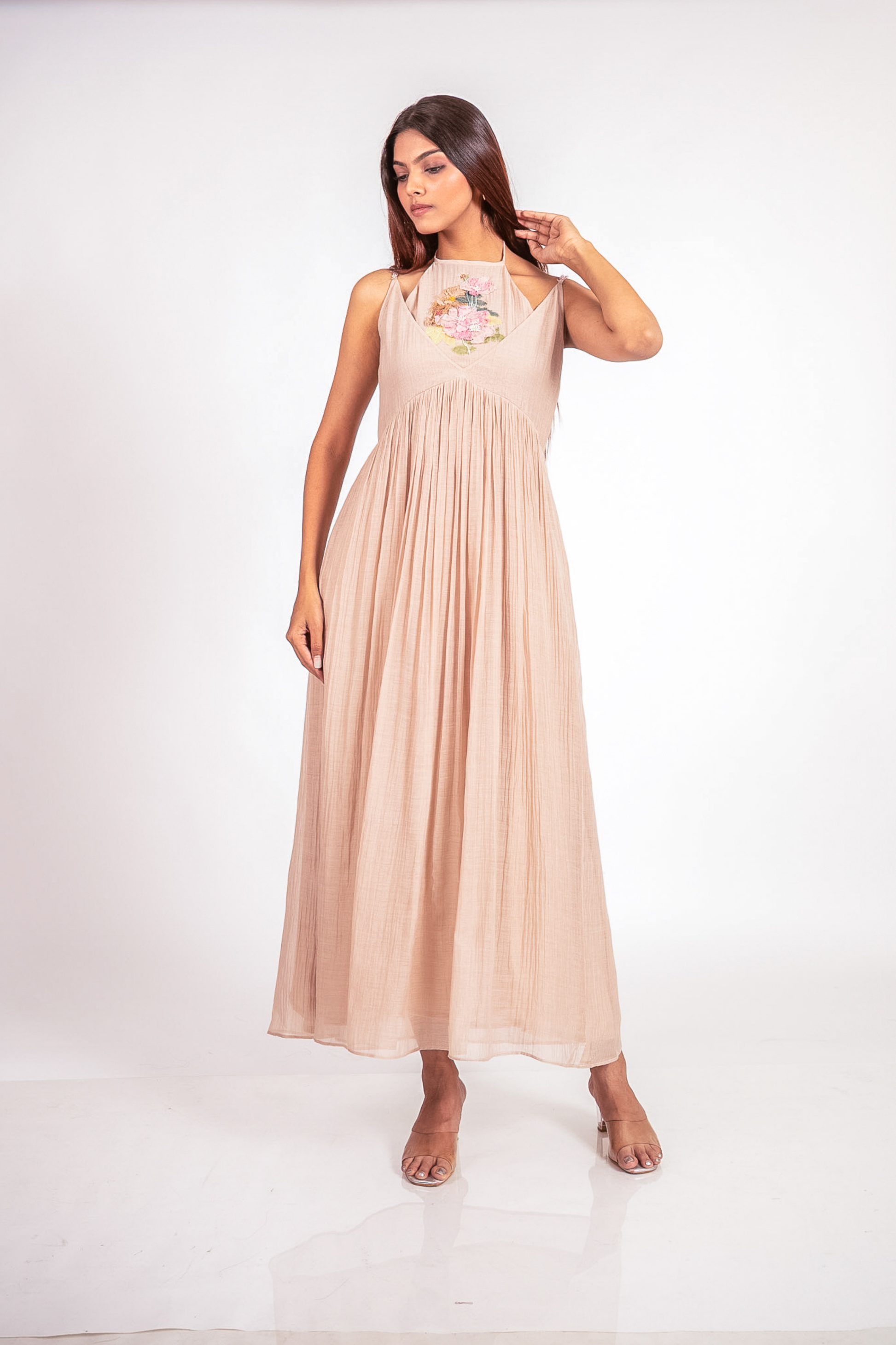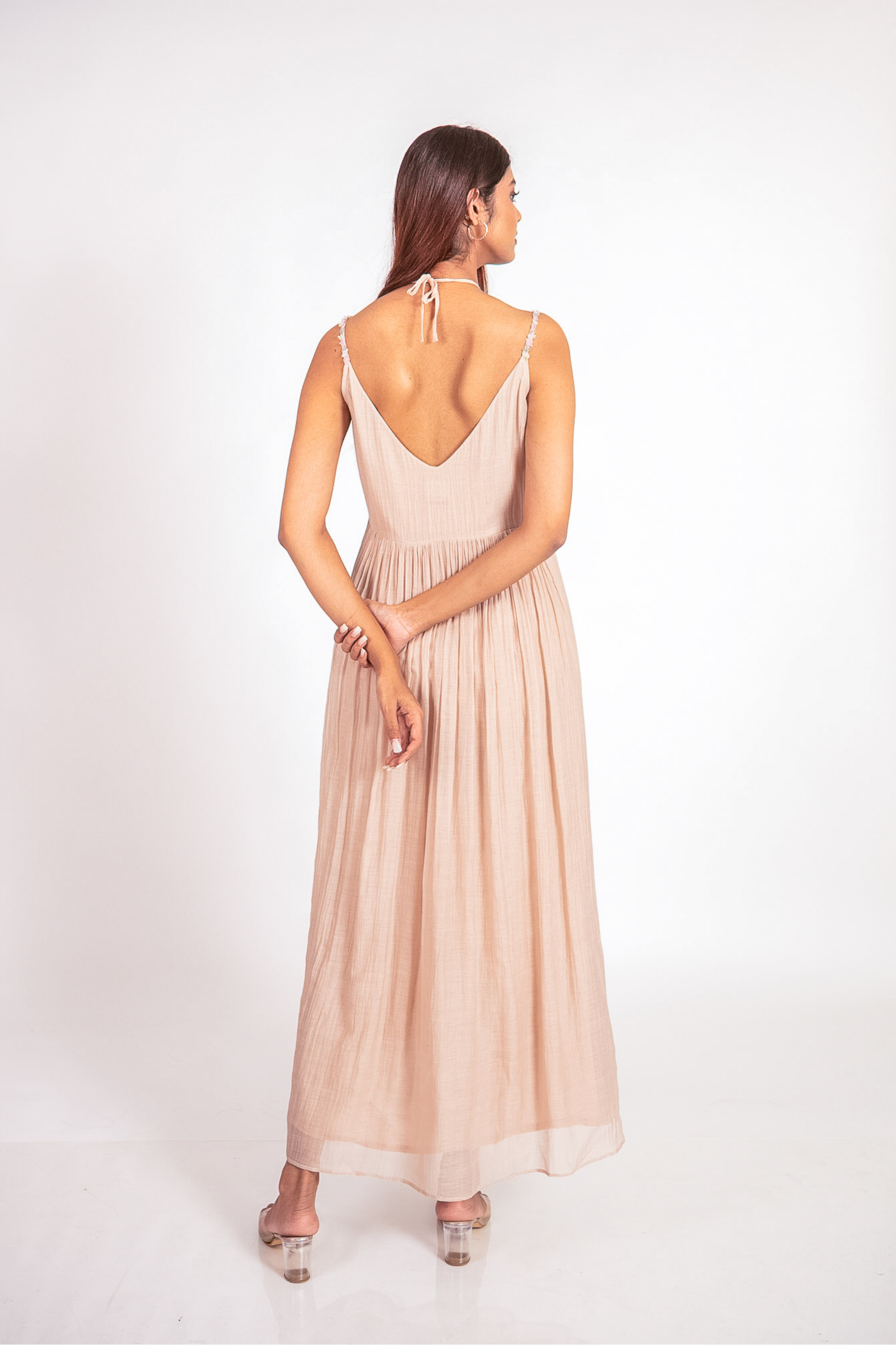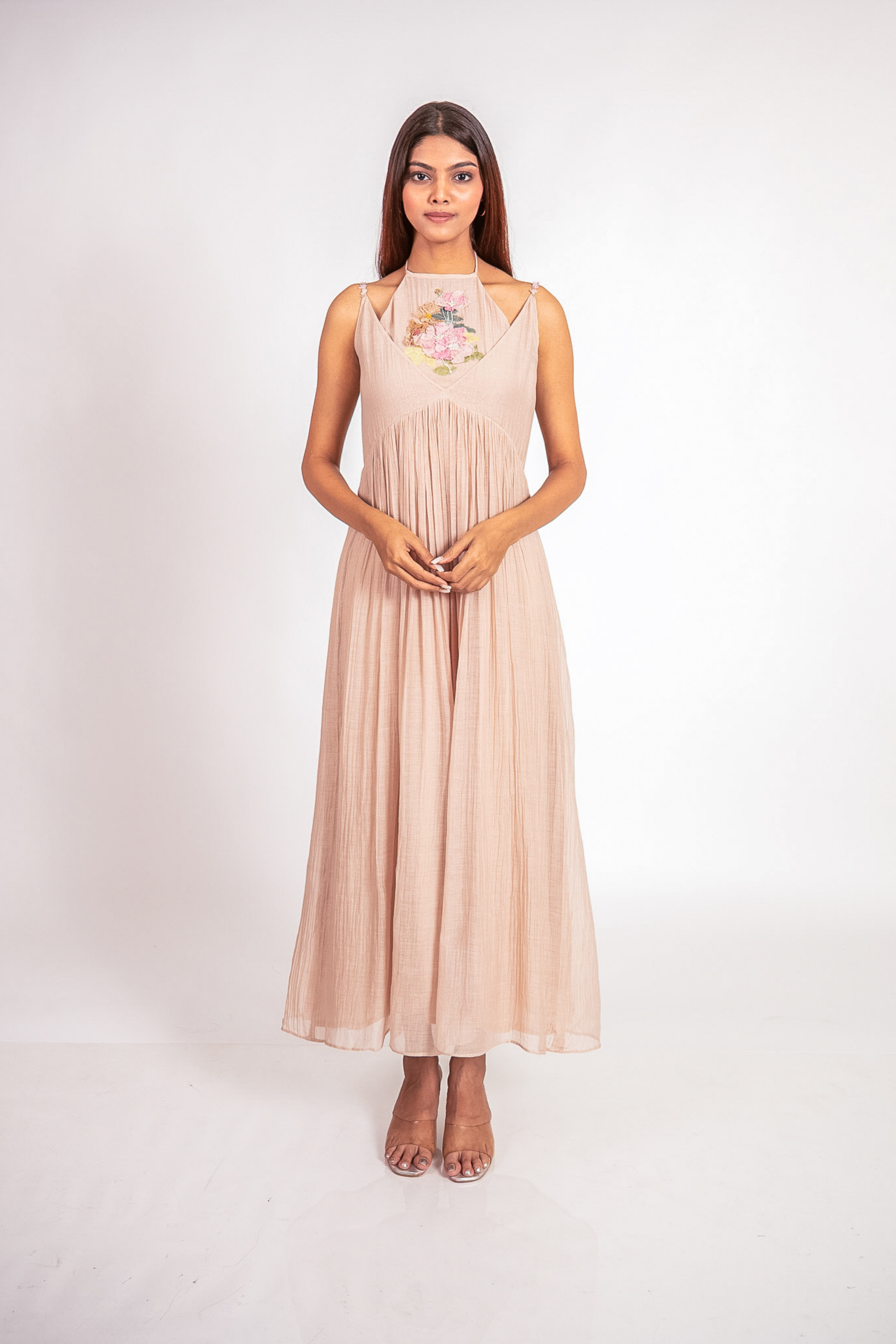 "A nude halter maxi dress featuring the delicate Dainty Beis rose in 3D floral embroidery. Light and flowing, the silhouette moves with grace.