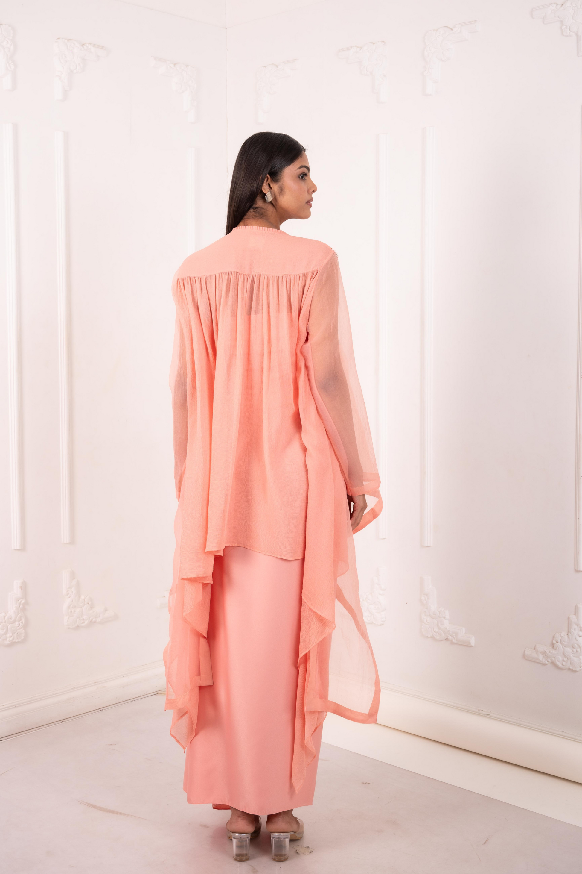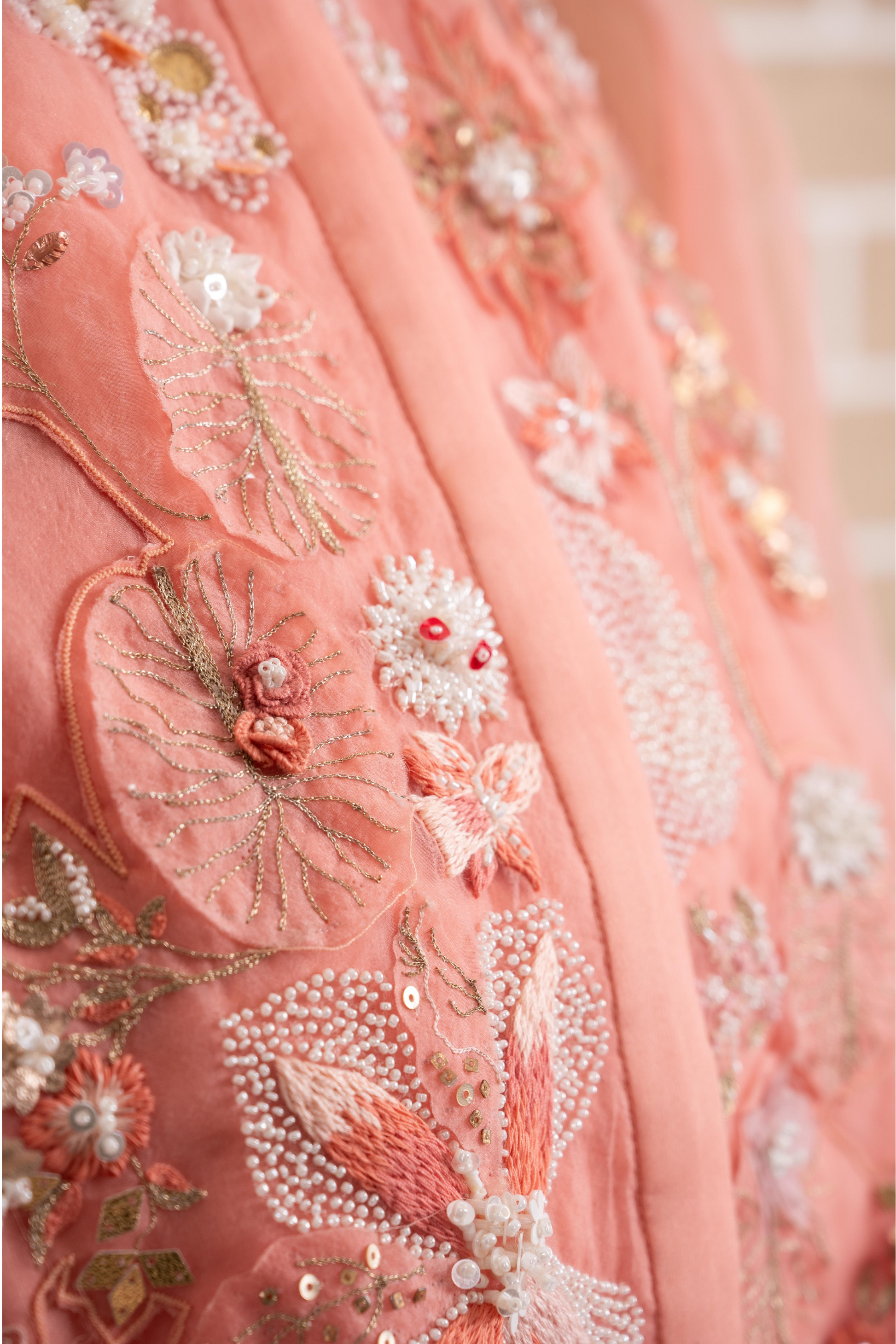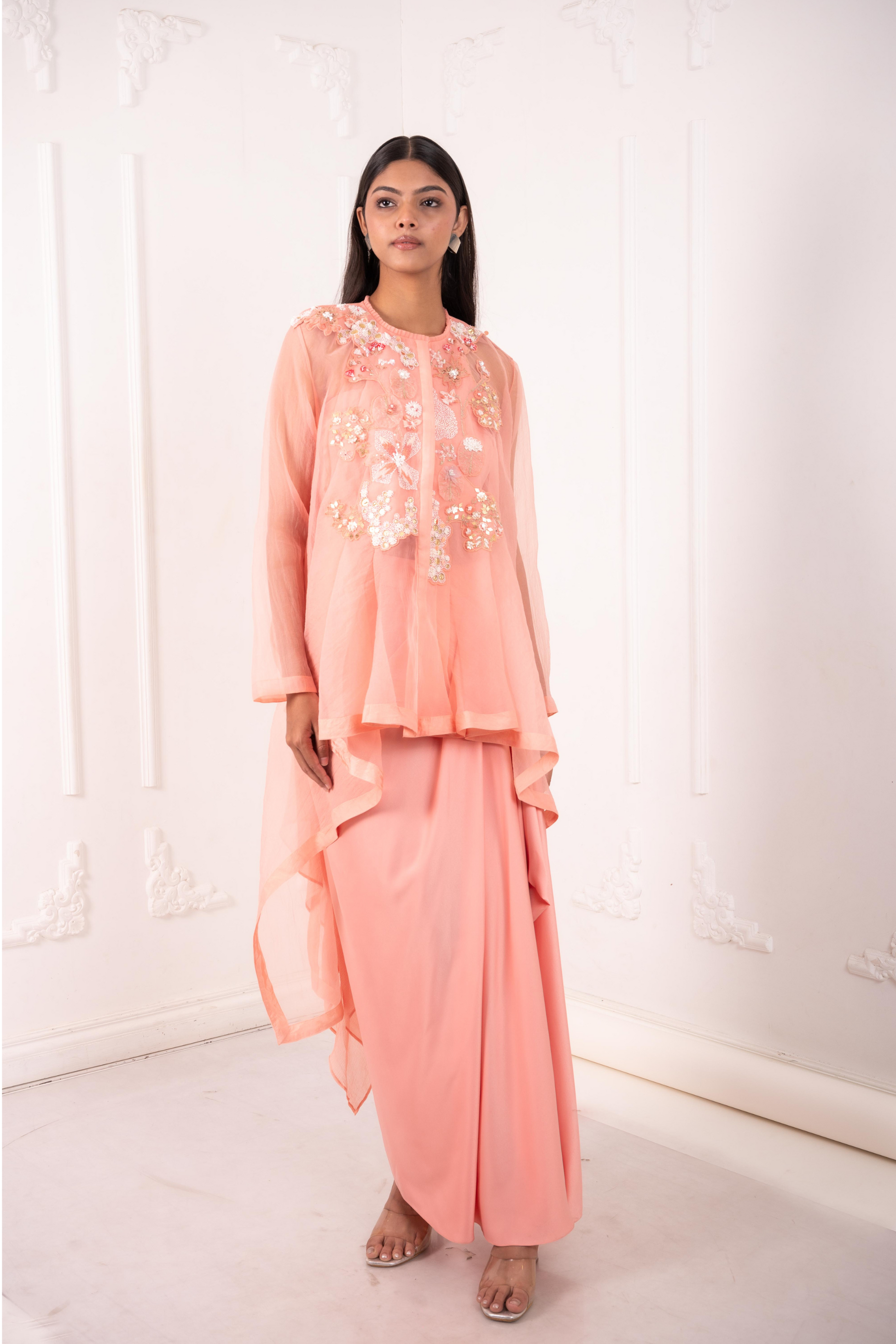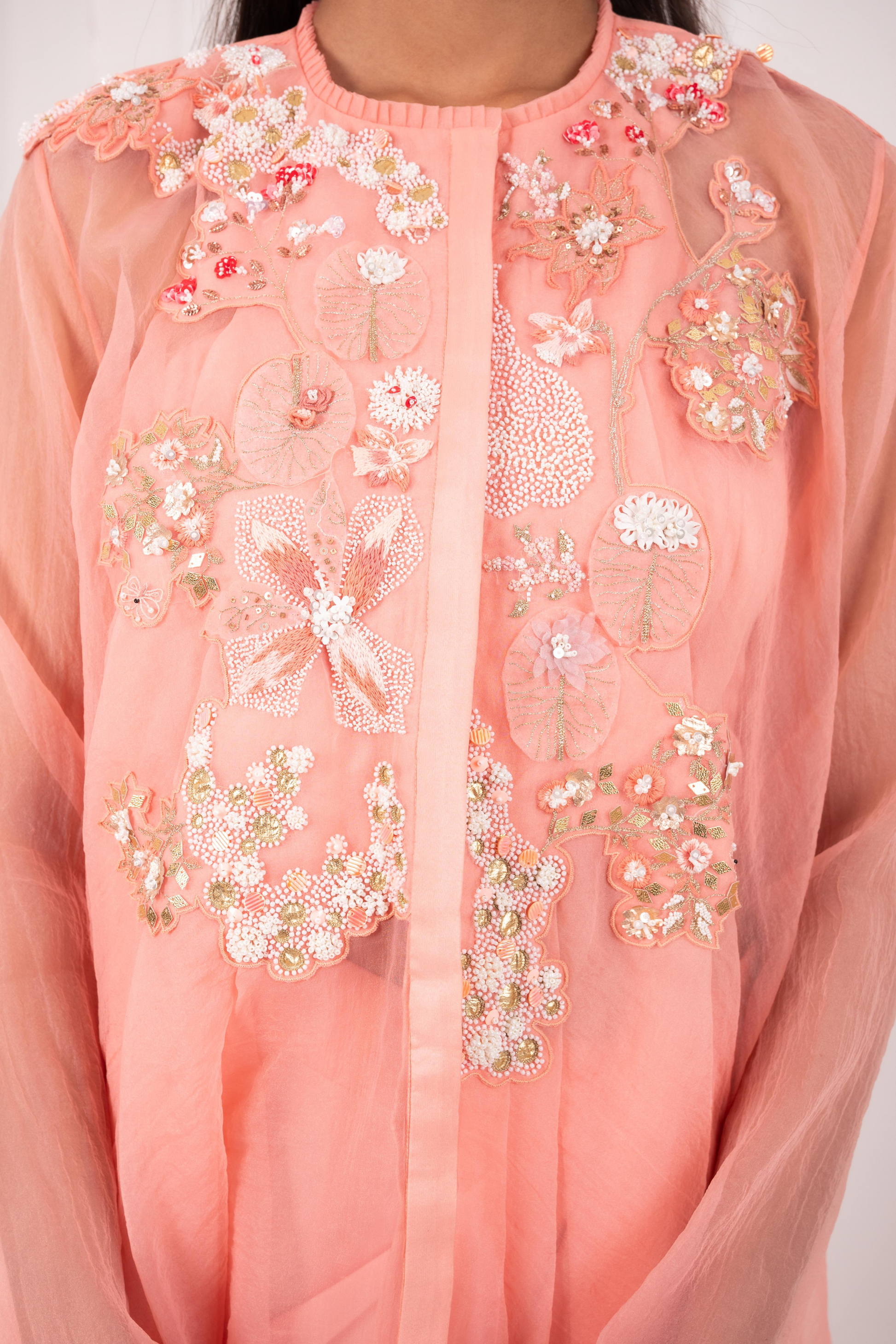 A cape set to steal your heart! the Calliope set feels like a gentle ode to wild gardens. Freehand motifs—water lilies, lotus leaves, and ribbon-like blossoms—bloom without symmetry, adorned with delicate bead clusters. A translucent cape floats over a draped skirt, soft and fluid like petals in motion.