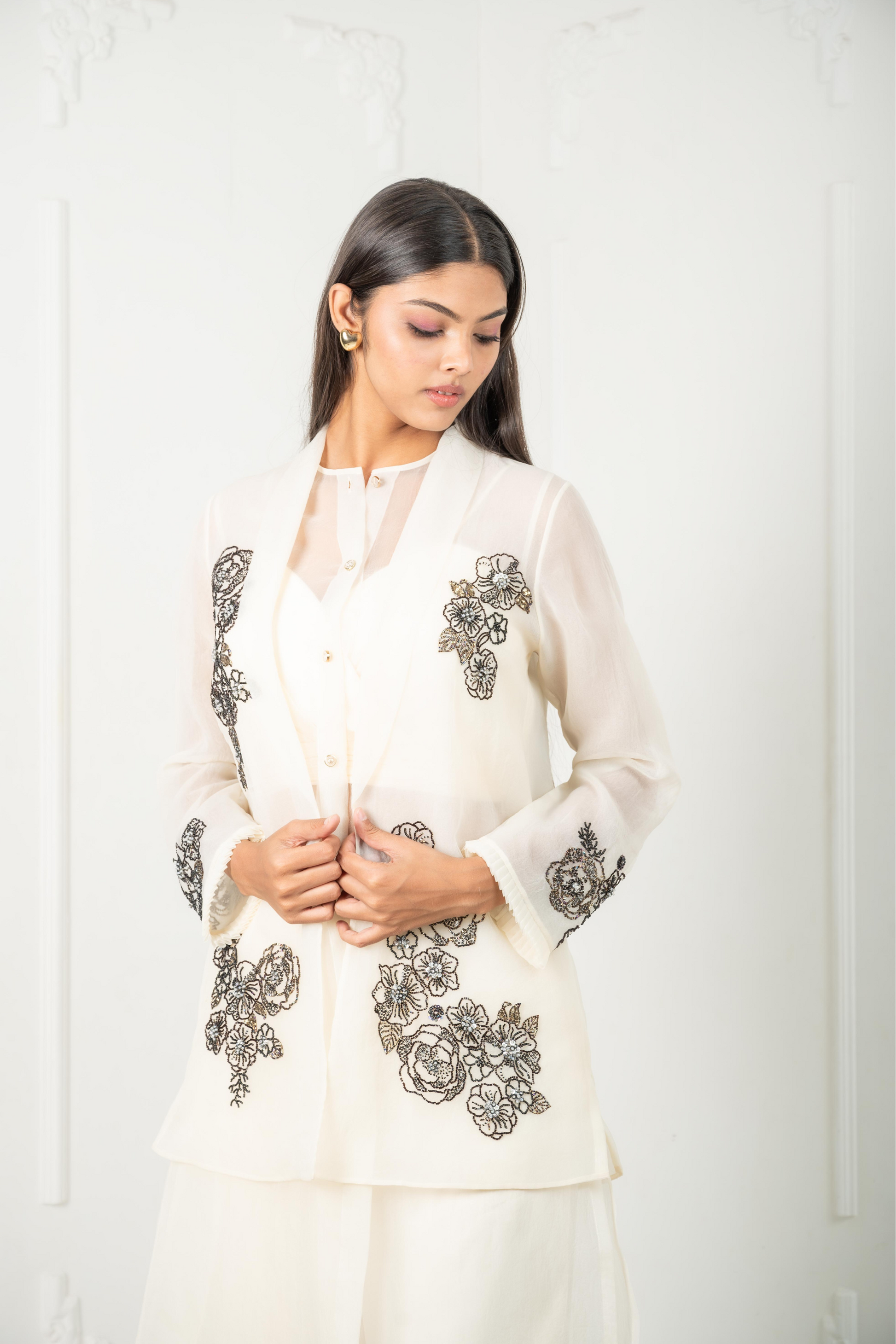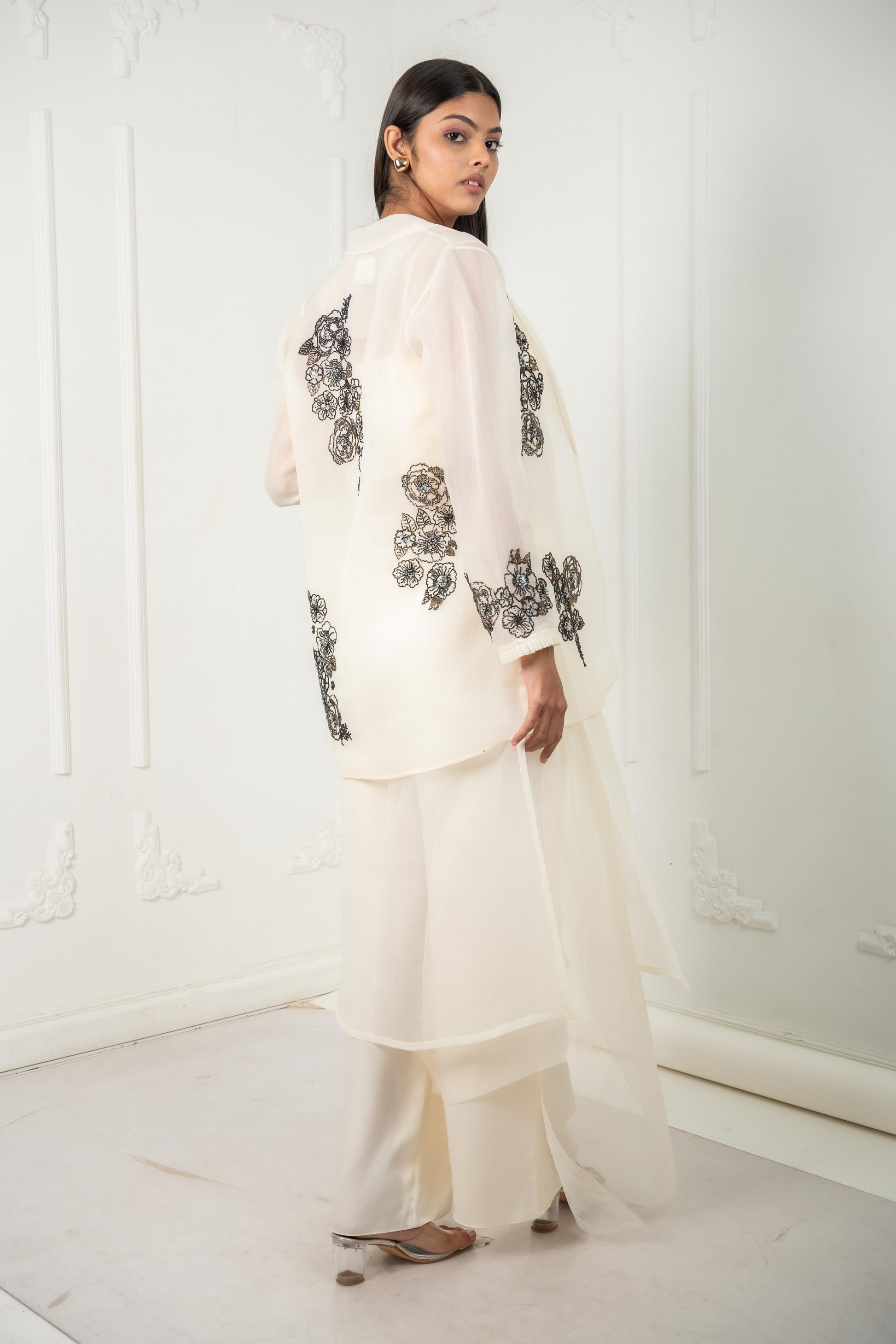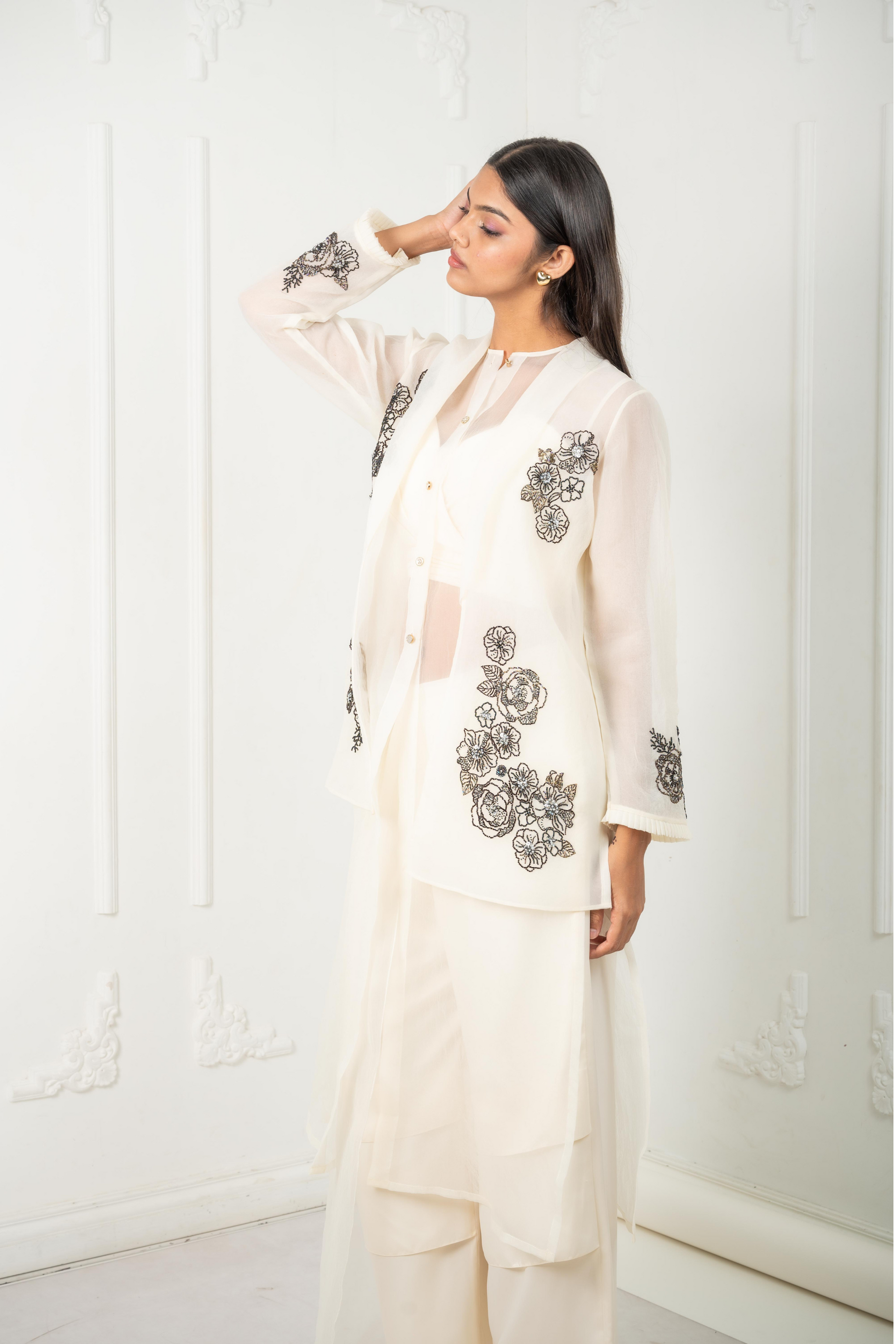 The Celeste set is a four-piece ensemble crafted for quiet power and grace. An ivory organza base sets the tone, adorned with black thread and bead floral clusters. It includes a sheer tunic, flowing pleated pants, a relaxed-fit blazer with tailored structure, and an inner camisole. Formal yet feminine, composed yet free.