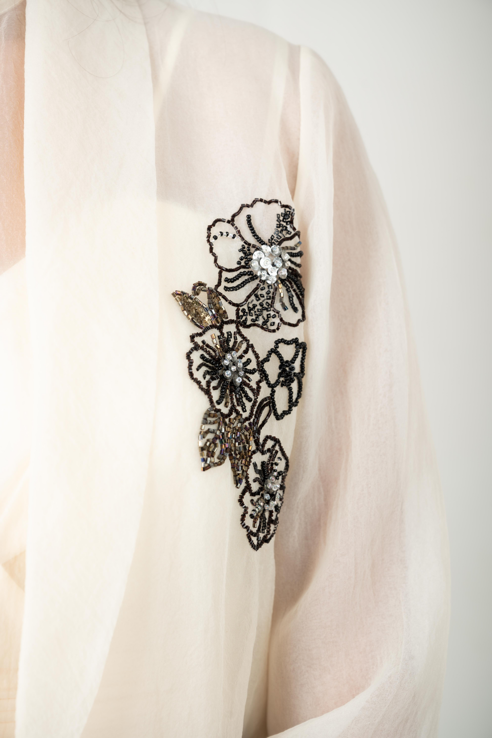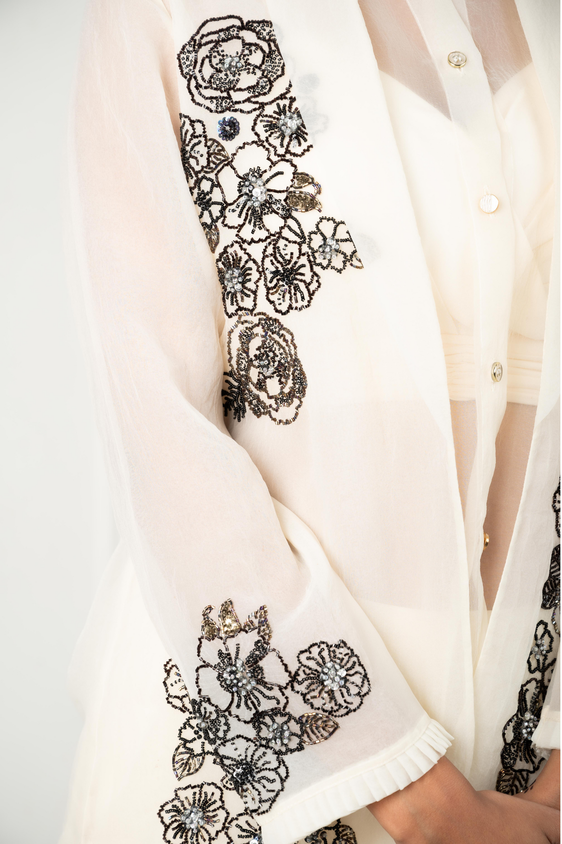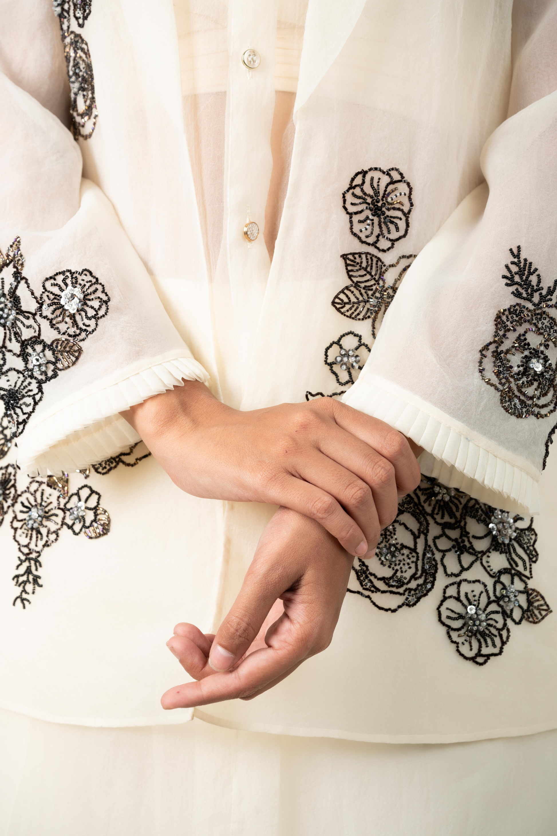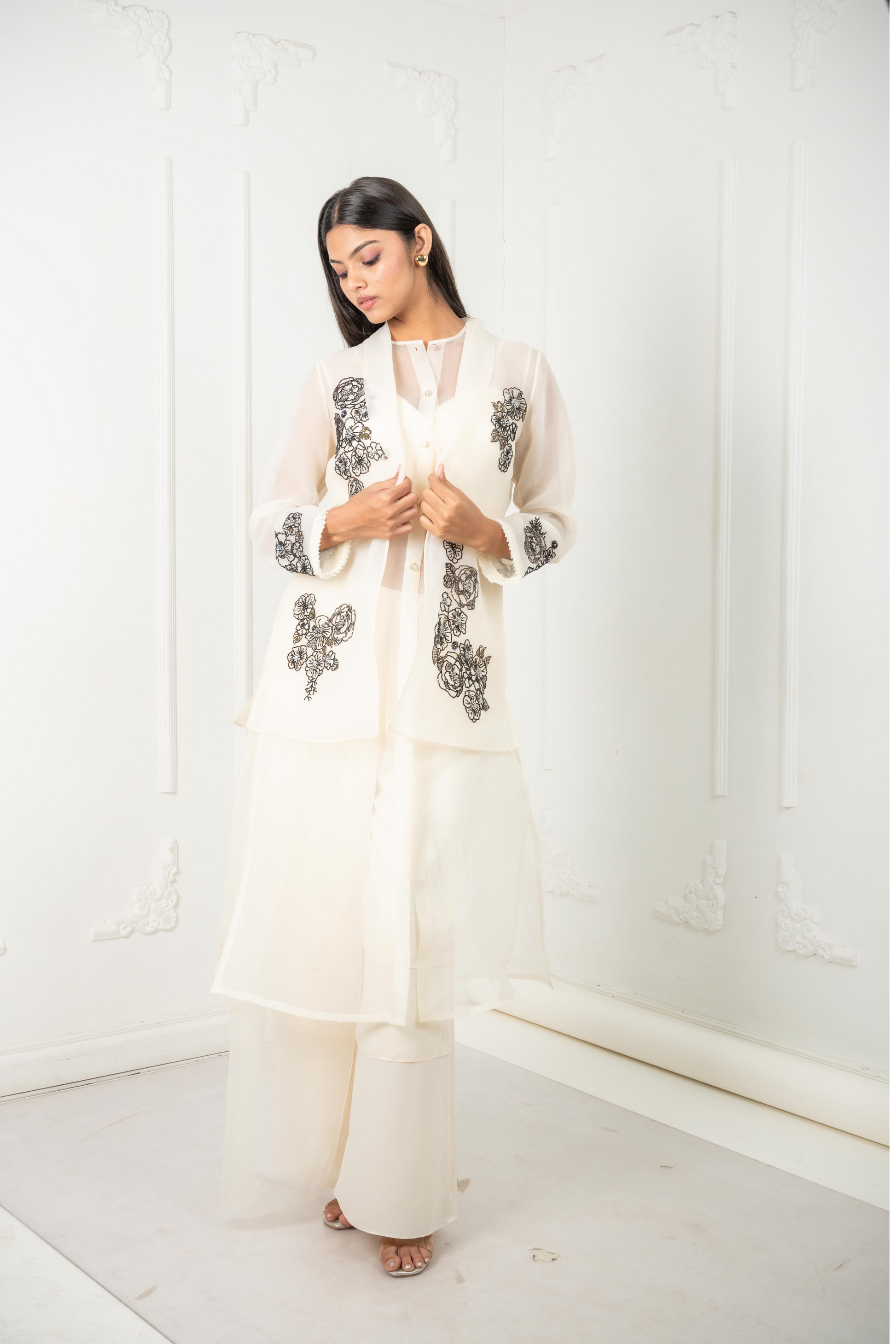 The Celeste set is a four-piece ensemble crafted for quiet power and grace. An ivory organza base sets the tone, adorned with black thread and bead floral clusters. It includes a sheer tunic, flowing pleated pants, a relaxed-fit blazer with tailored structure, and an inner camisole. Formal yet feminine, composed yet free.