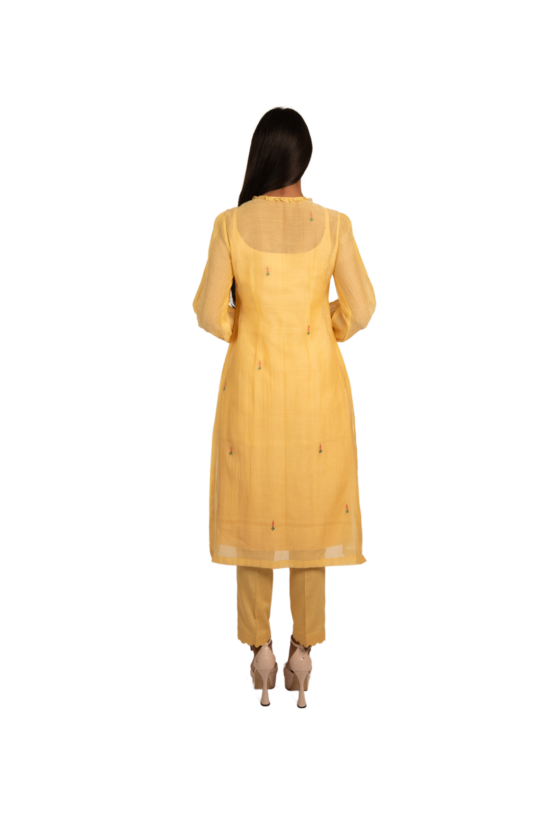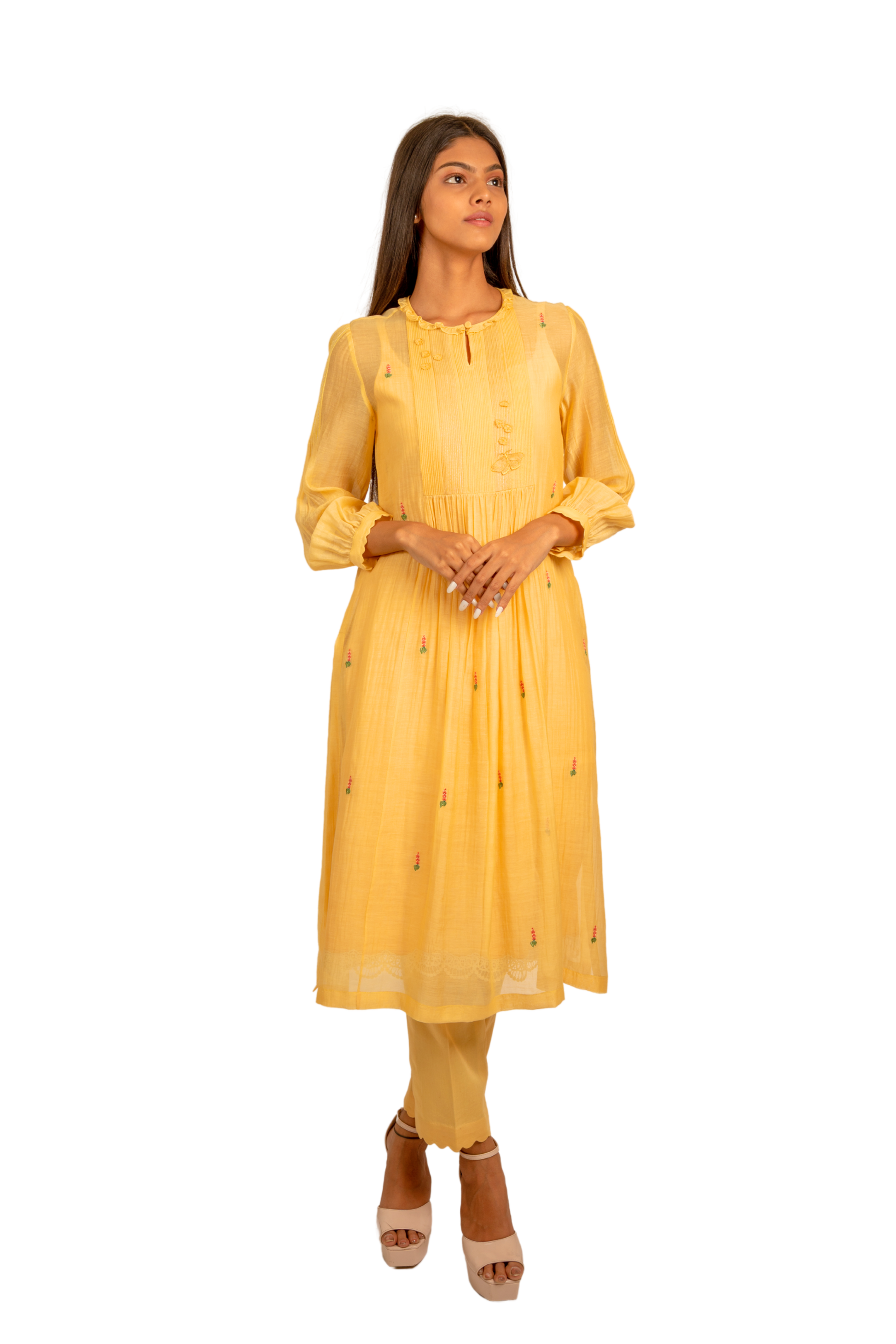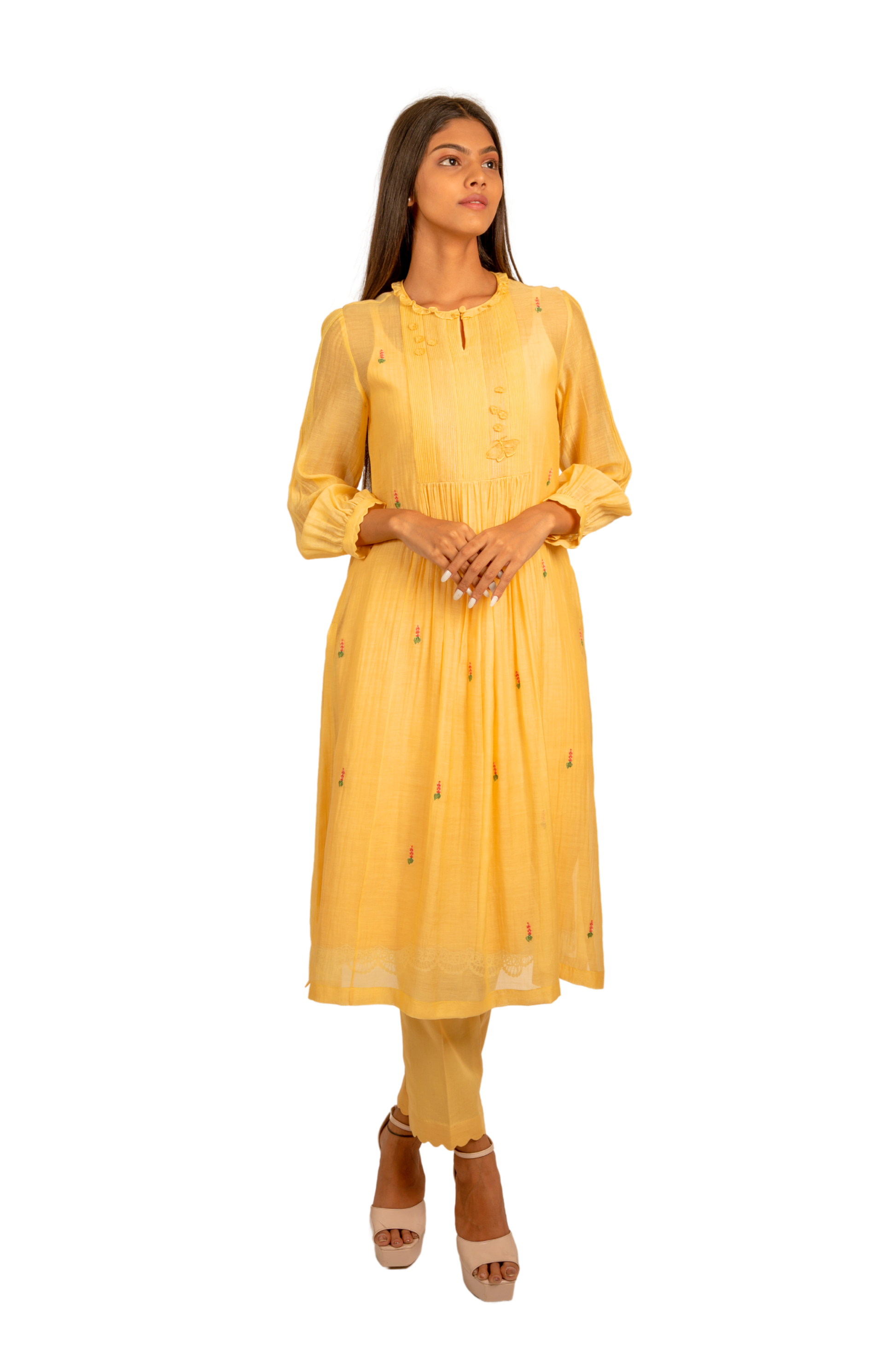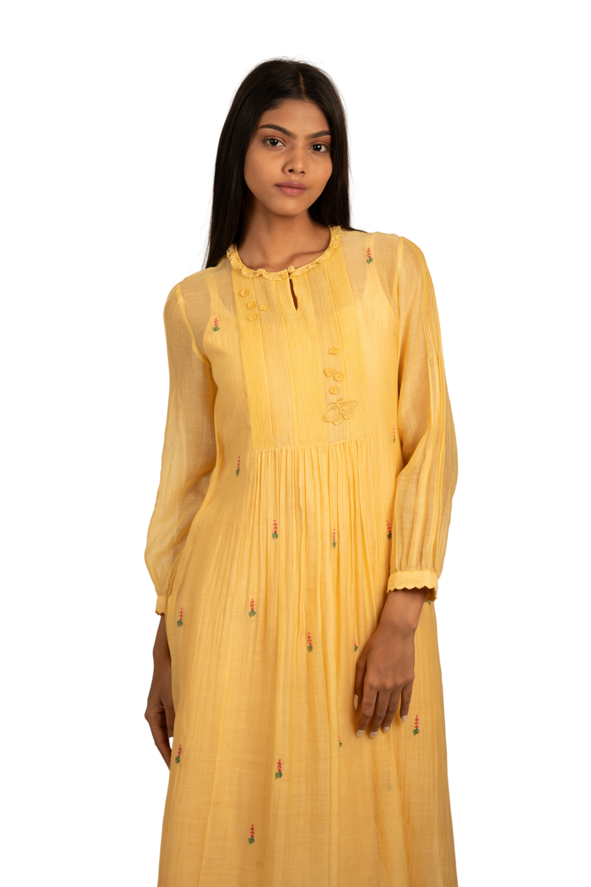 Sun-kissed yellow chanderi mulmul tunic glows with quiet charm. A pintucked yoke adorned with threadwork, zari, and a delicate organza butterfly sets the tone for the pretty Chrysallis and Elysian flowers embroidered all over. Finished with scalloped edges on the sleeves, it’s a piece that feels like golden hour captured in cloth.