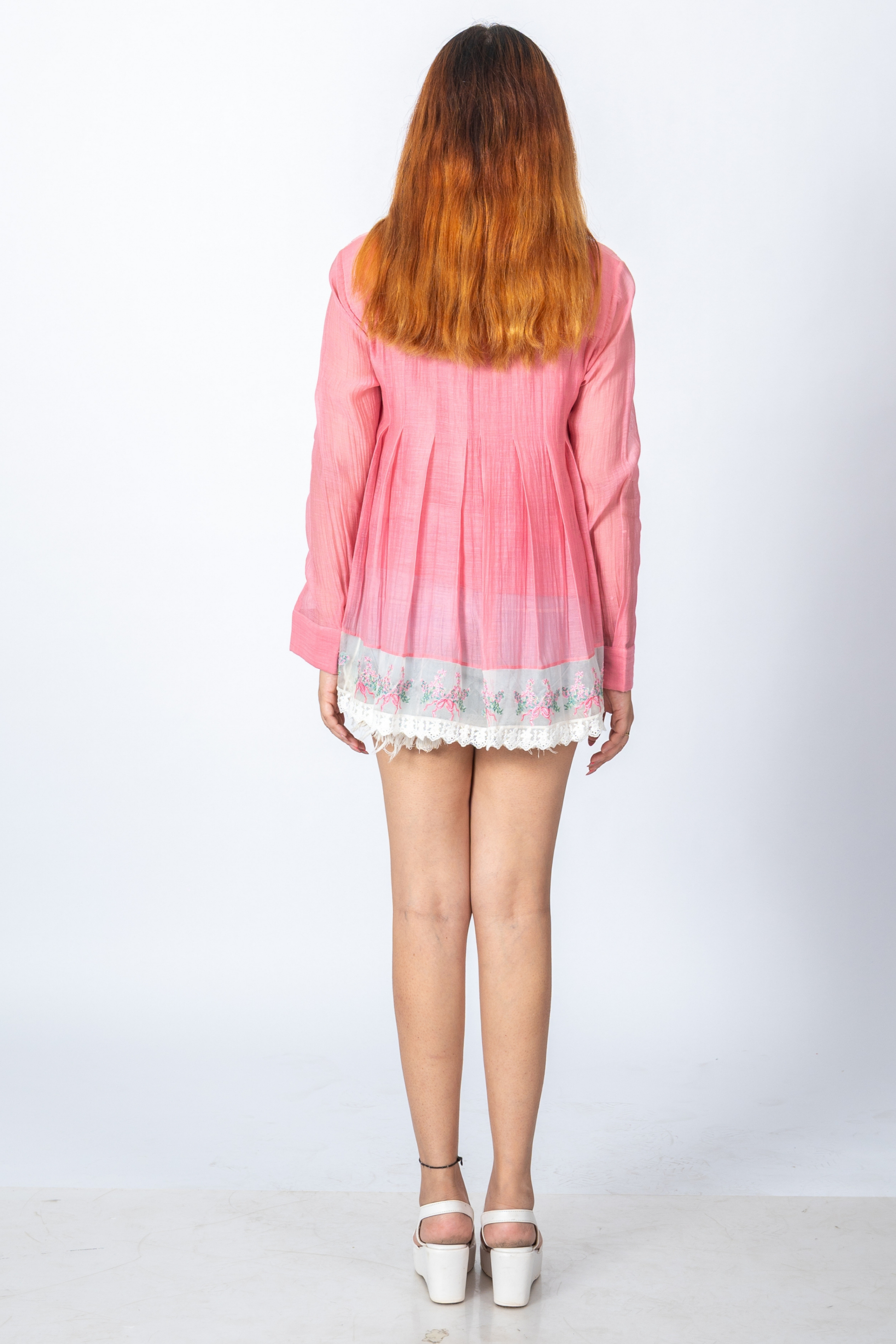 Like a gaze held just a second too long—gentle, warm, and unforgettable. The Eyes For You top is crafted in Chanderi, framed with a delicate holly-embroidered lace trim. A softly quilted collar adds structure, while fine thread detailing on the buttons lends a quiet, thoughtful charm. A tender expression of love, stitched into every seam.