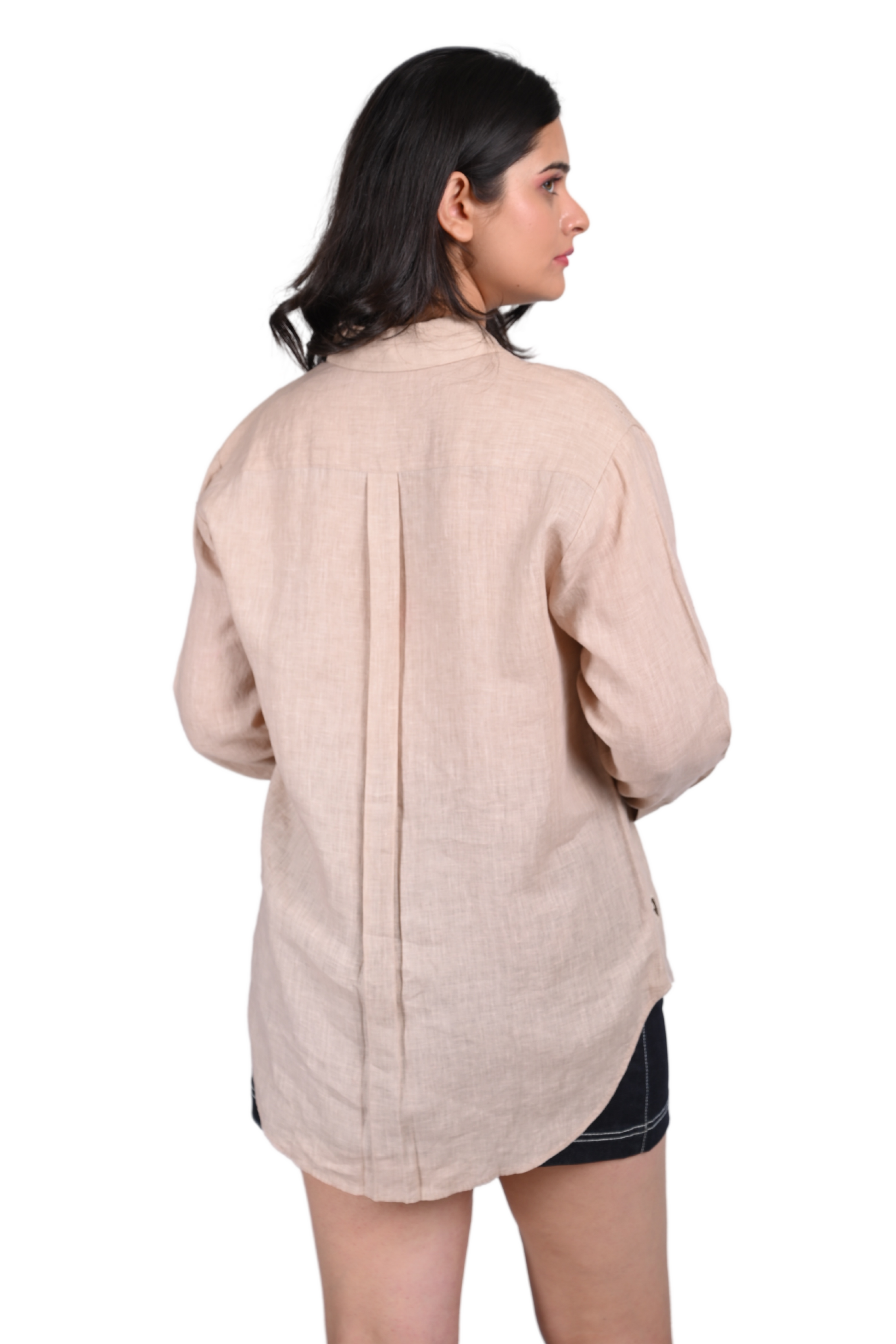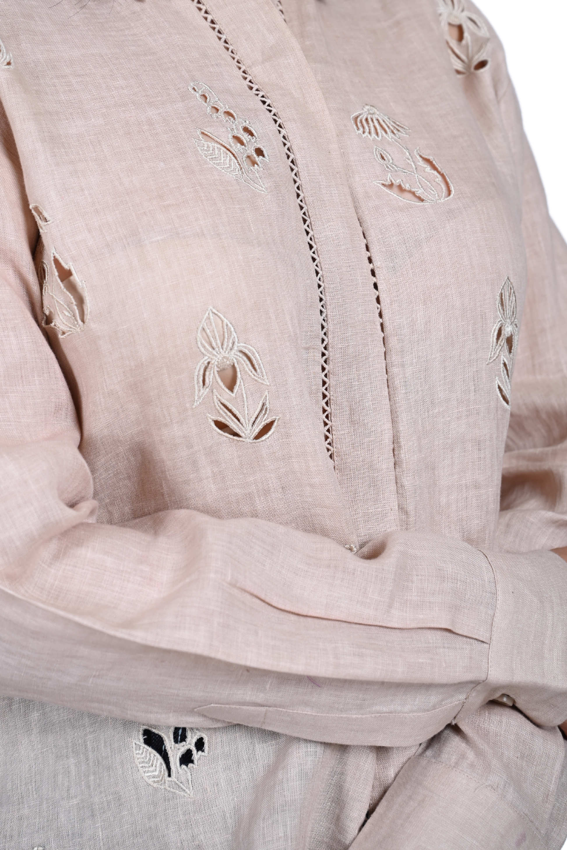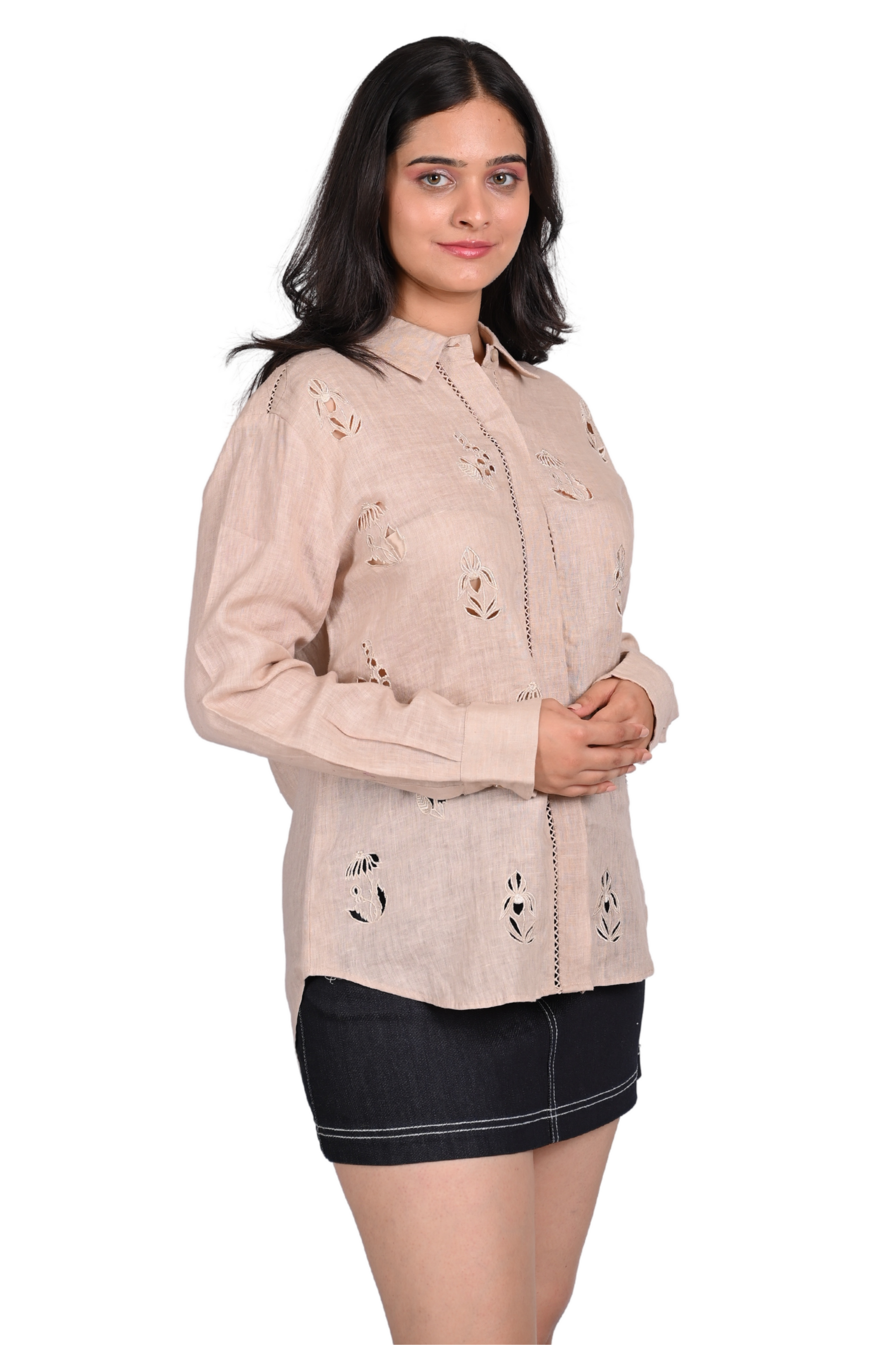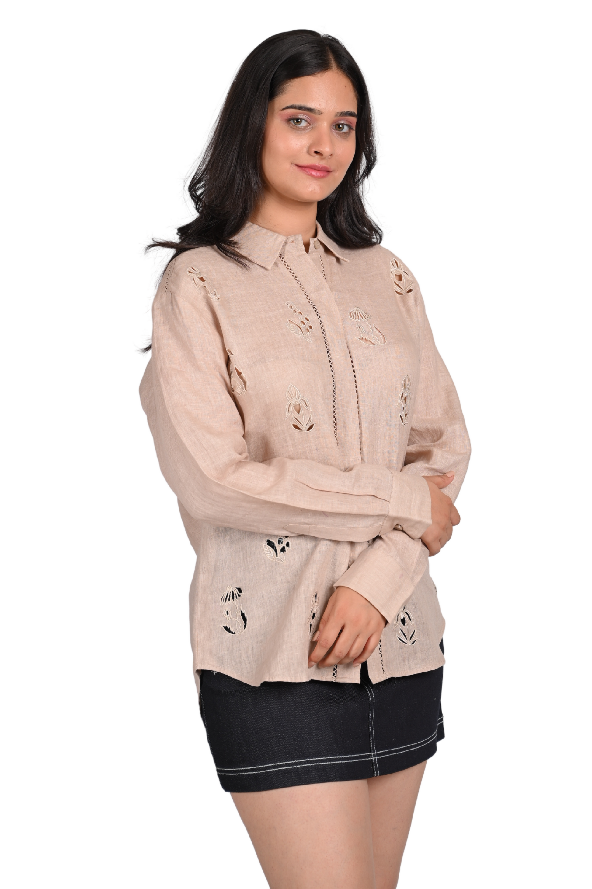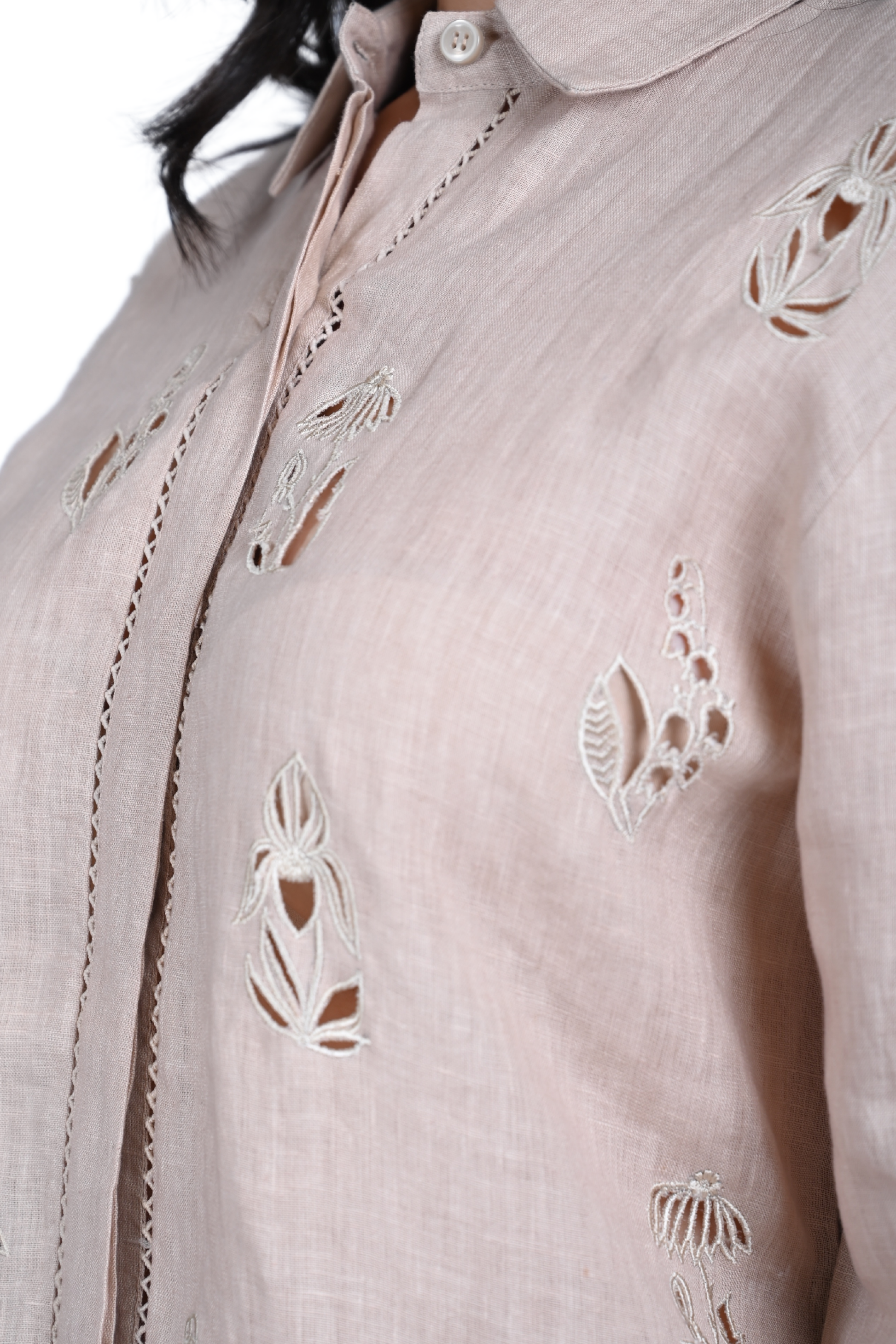 Flora is a linen shirt in which dainty cutwork flowers bloom across soft linen in a serene beige hue. The intricate cutwork creates a subtle yet captivating texture, celebrating simplicity with grace. Perfect for a casual brunch or an afternoon garden gathering, this piece whispers quiet beauty and timeless charm.