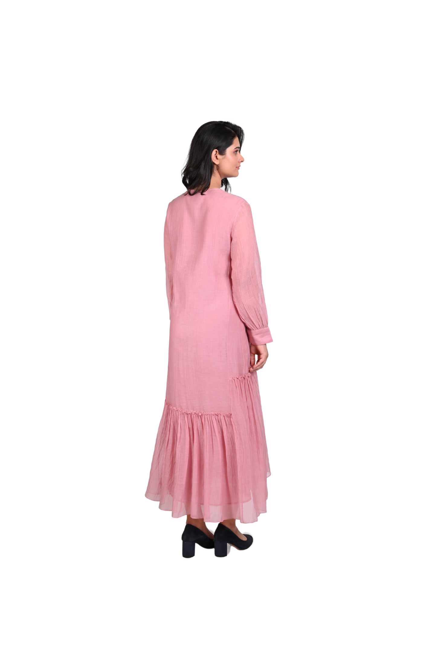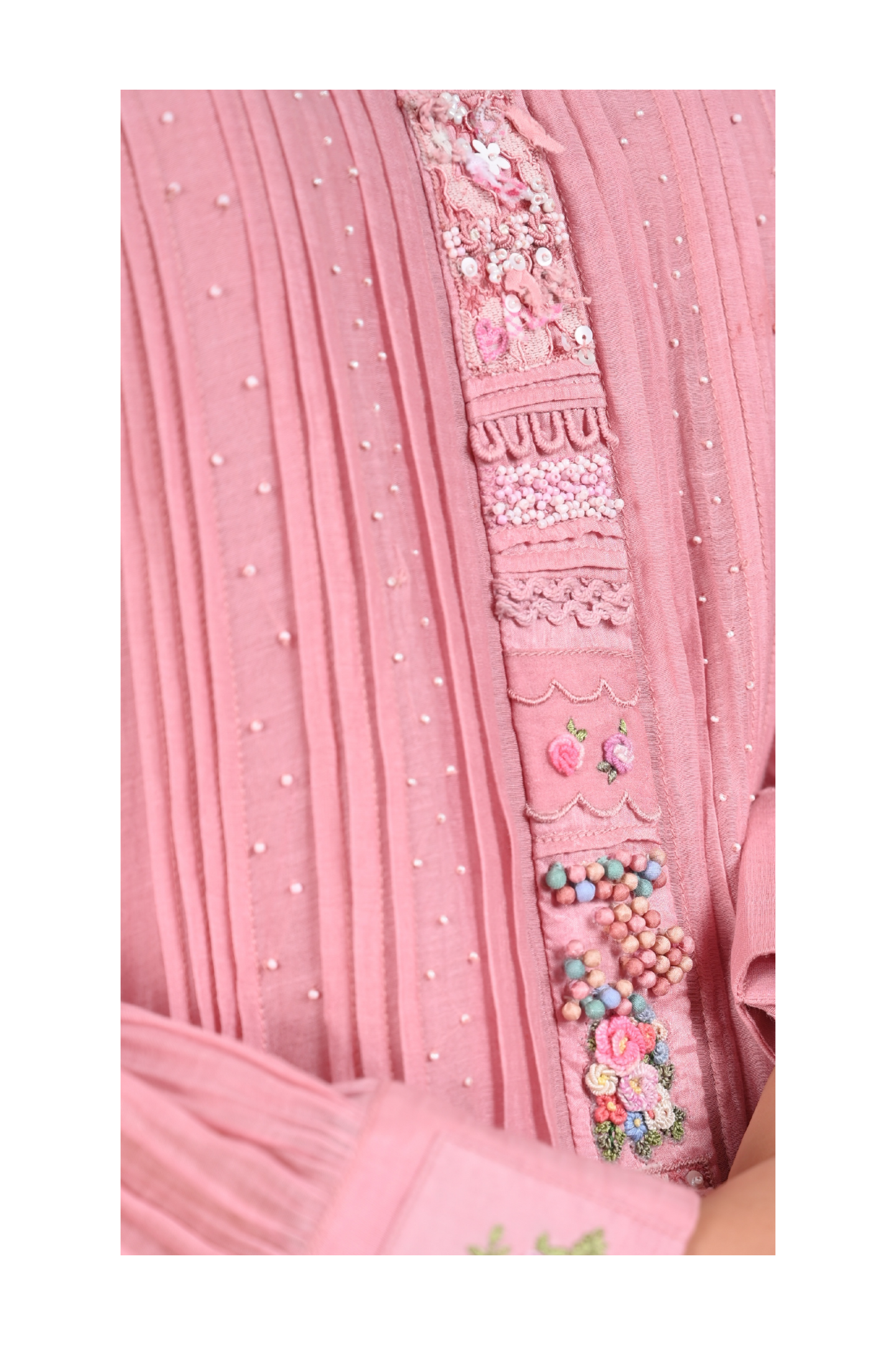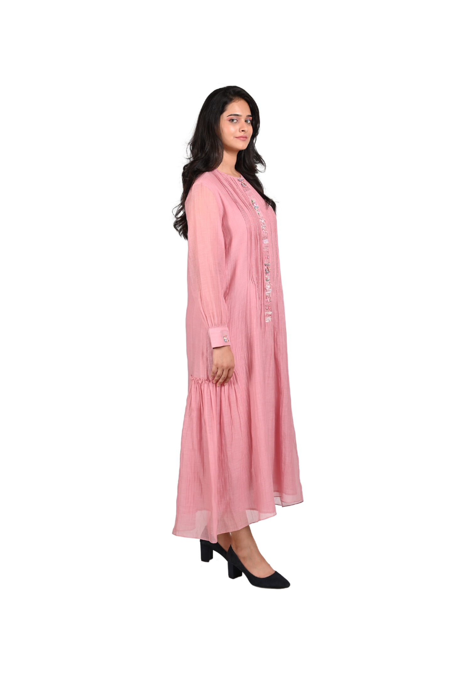 Forever is a journey of unexpected delights, where a long 18-inch placket unfolds a story of intricate beauty. Little lace textures, delicate flowers, beads, and button embroidery come together, one after the other, creating a tapestry of charm and elegance. A dress that speaks of timeless moments and hidden wonders. Perfect for a romantic evening or an elegant day out.