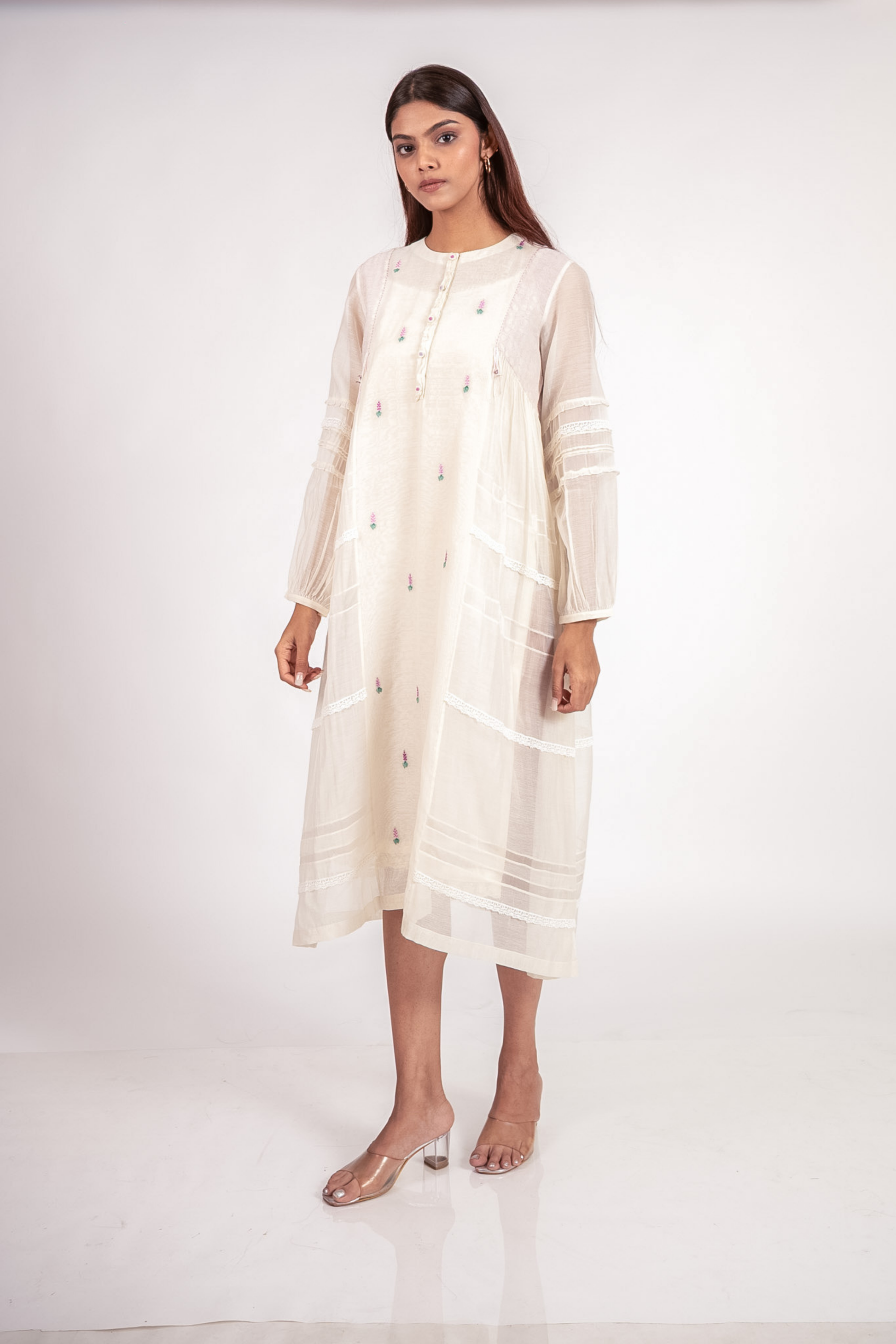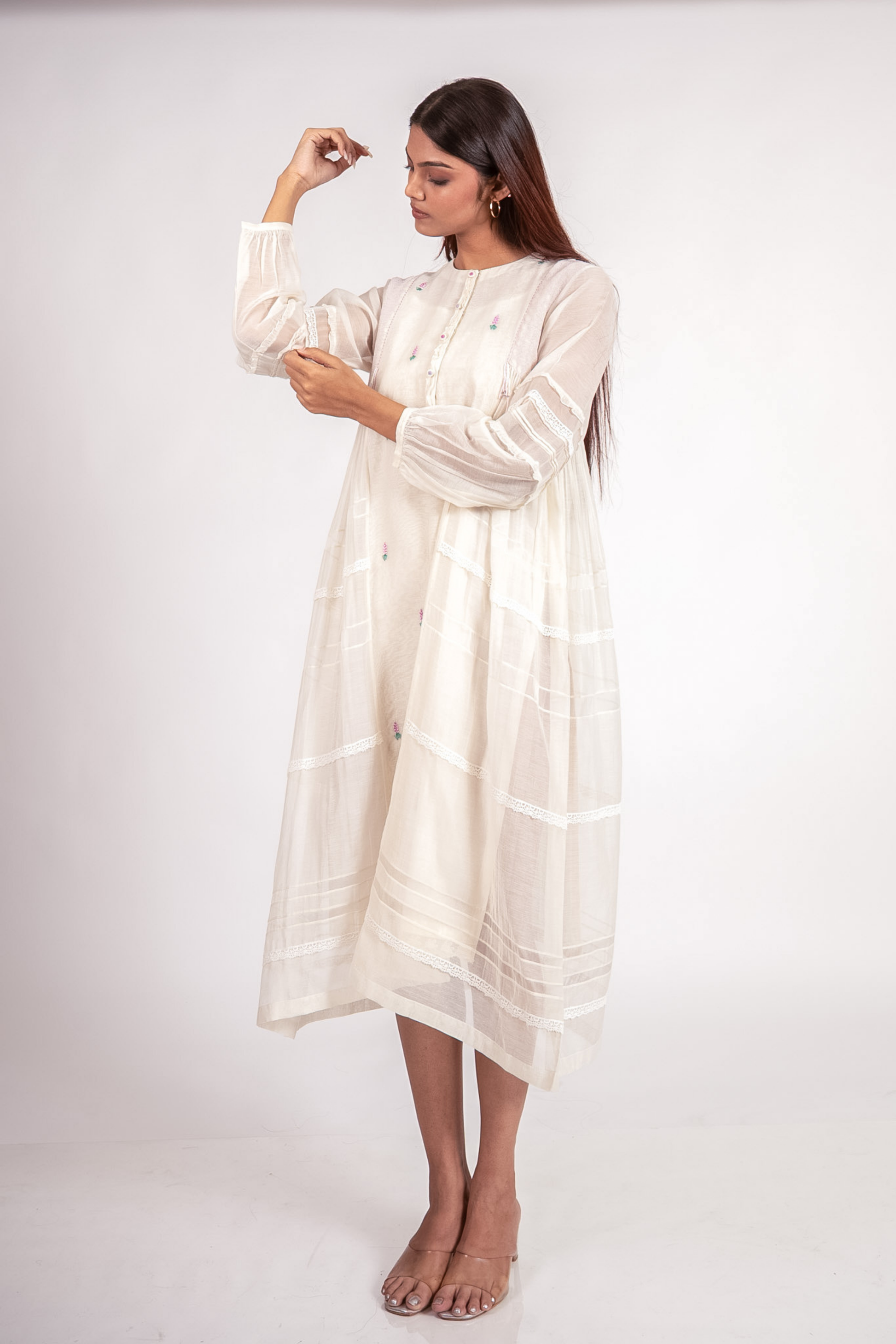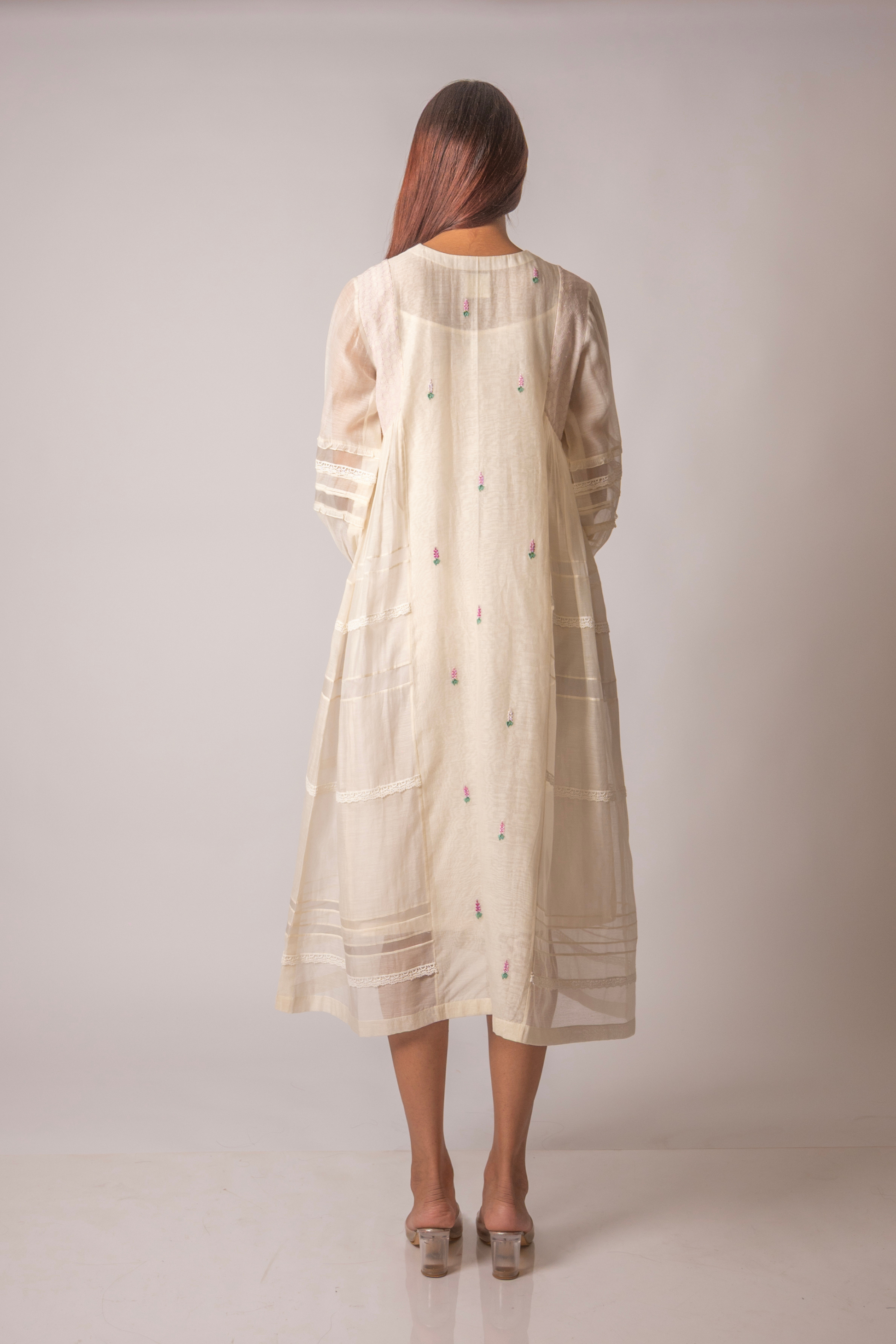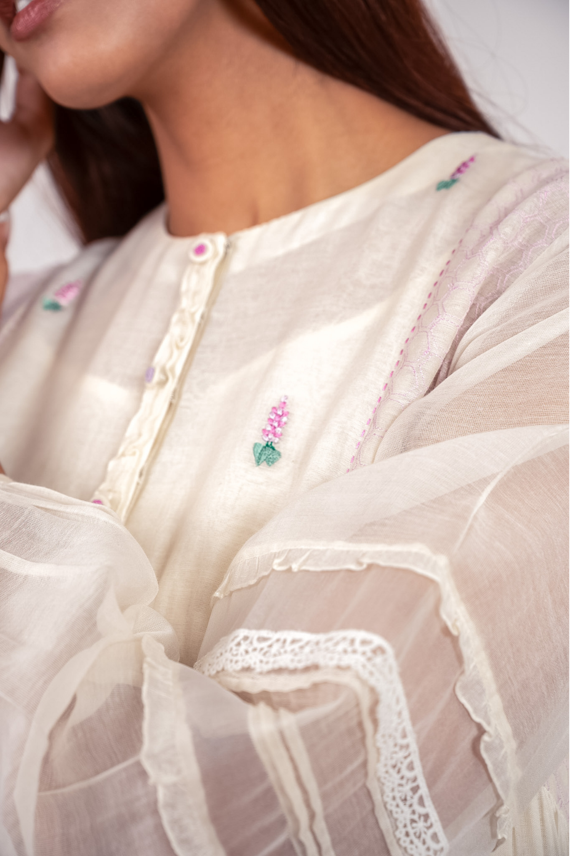 In Ivory, the Lilas tunic is a delicate bloom, adorned with pink lavender flowers that whisper of spring's quiet beauty. Crafted from organza and lace, the side panels reveal intricate detailing, while a frilled placket adds a tender touch. Hexagonal shapes on the shoulders echo the floral grace.