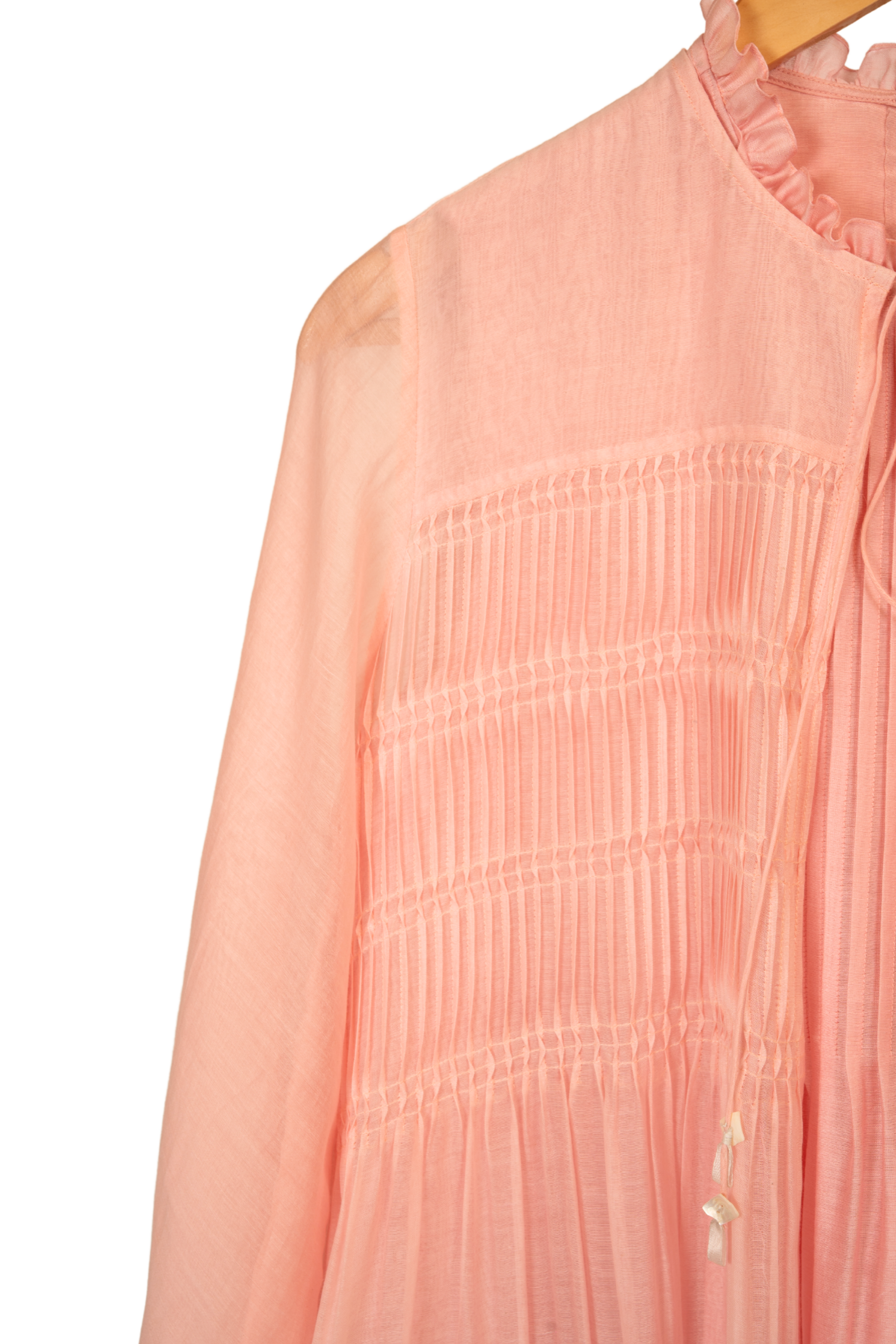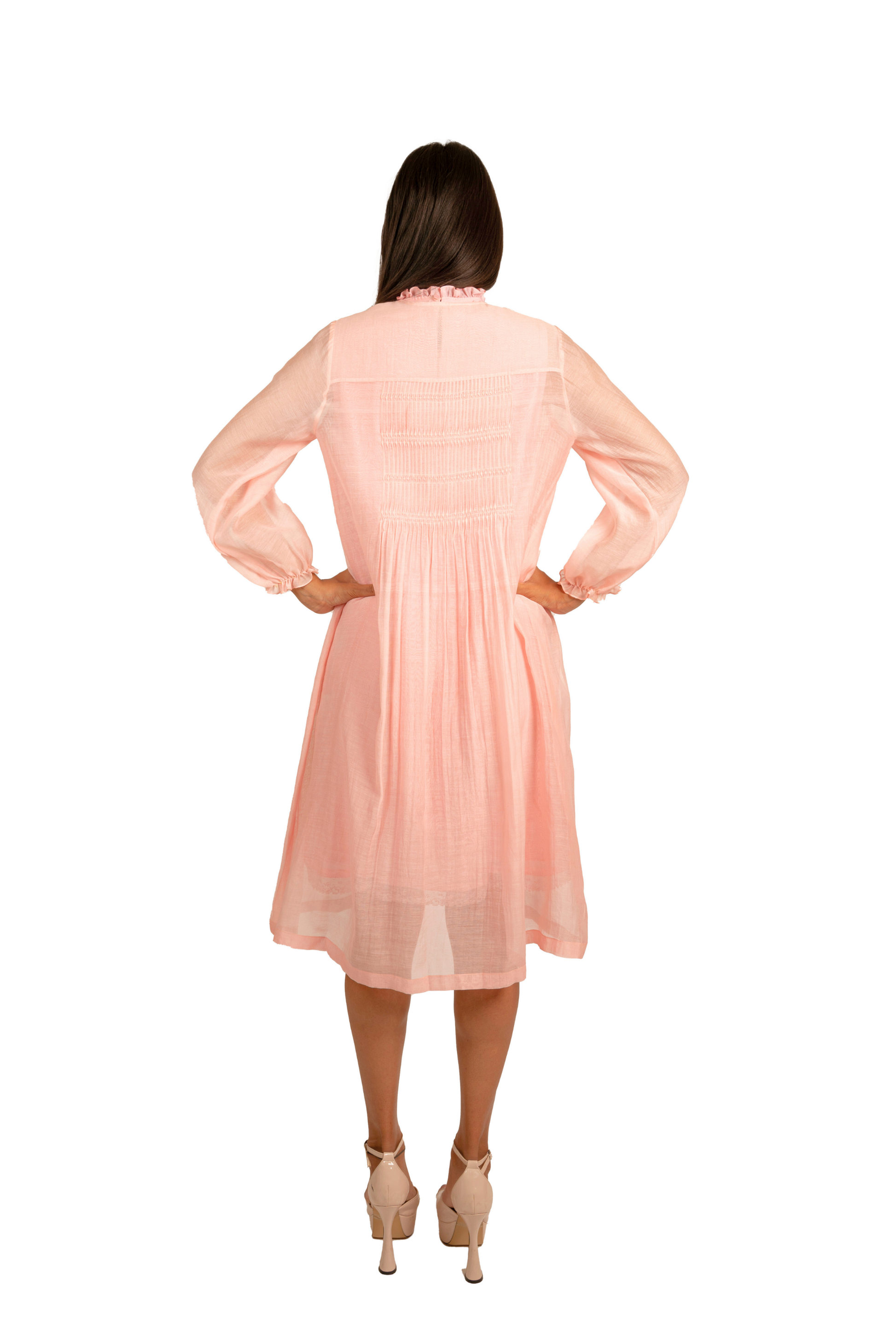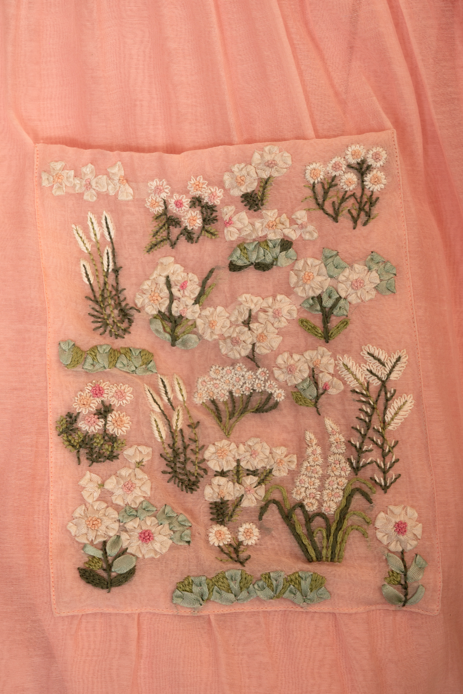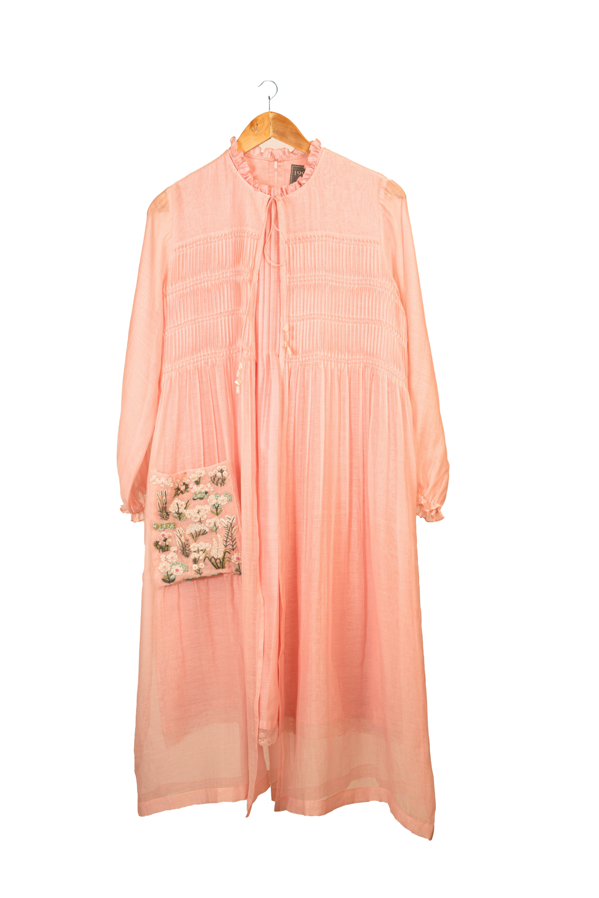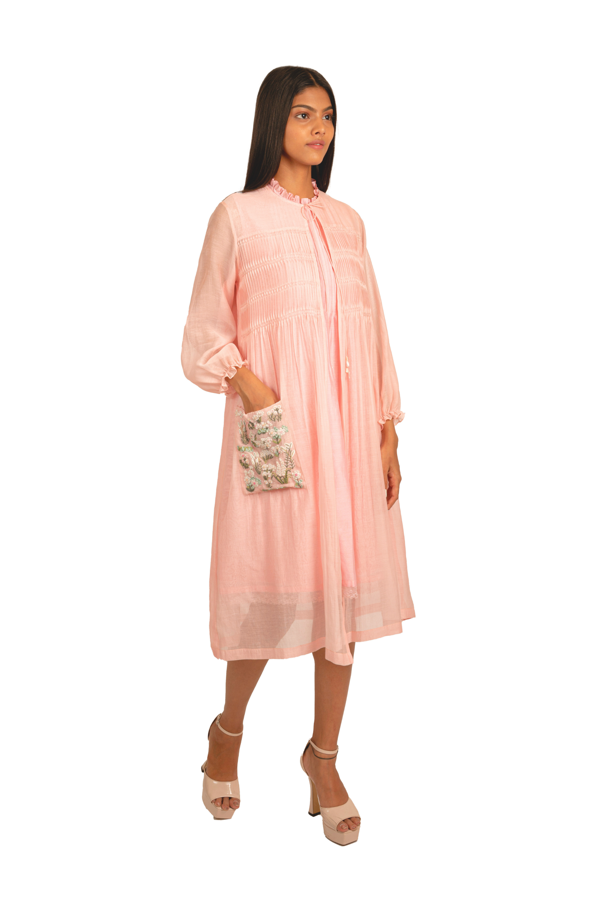 Little Blooms – As if gathered from a garden at dawn, this baby pink chanderi mulmul dress blooms with dense ribbon work echoing the lushness of the biosphere. The embroidery highlights a charming pocket, while dainty twisted pleats and a soft frill at the neckline lend a touch of whimsy. A piece made for sunlit mornings and quiet wonder.