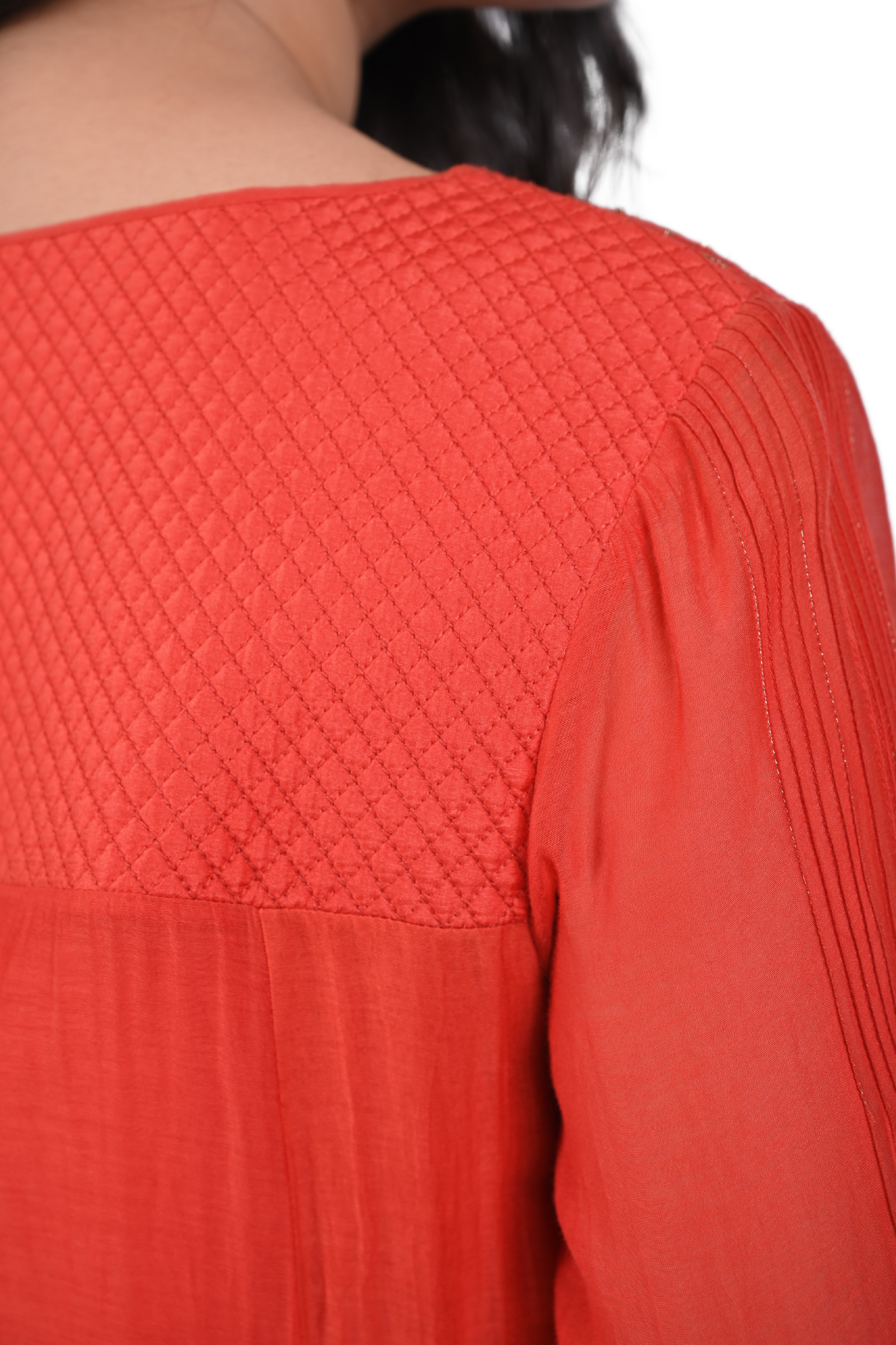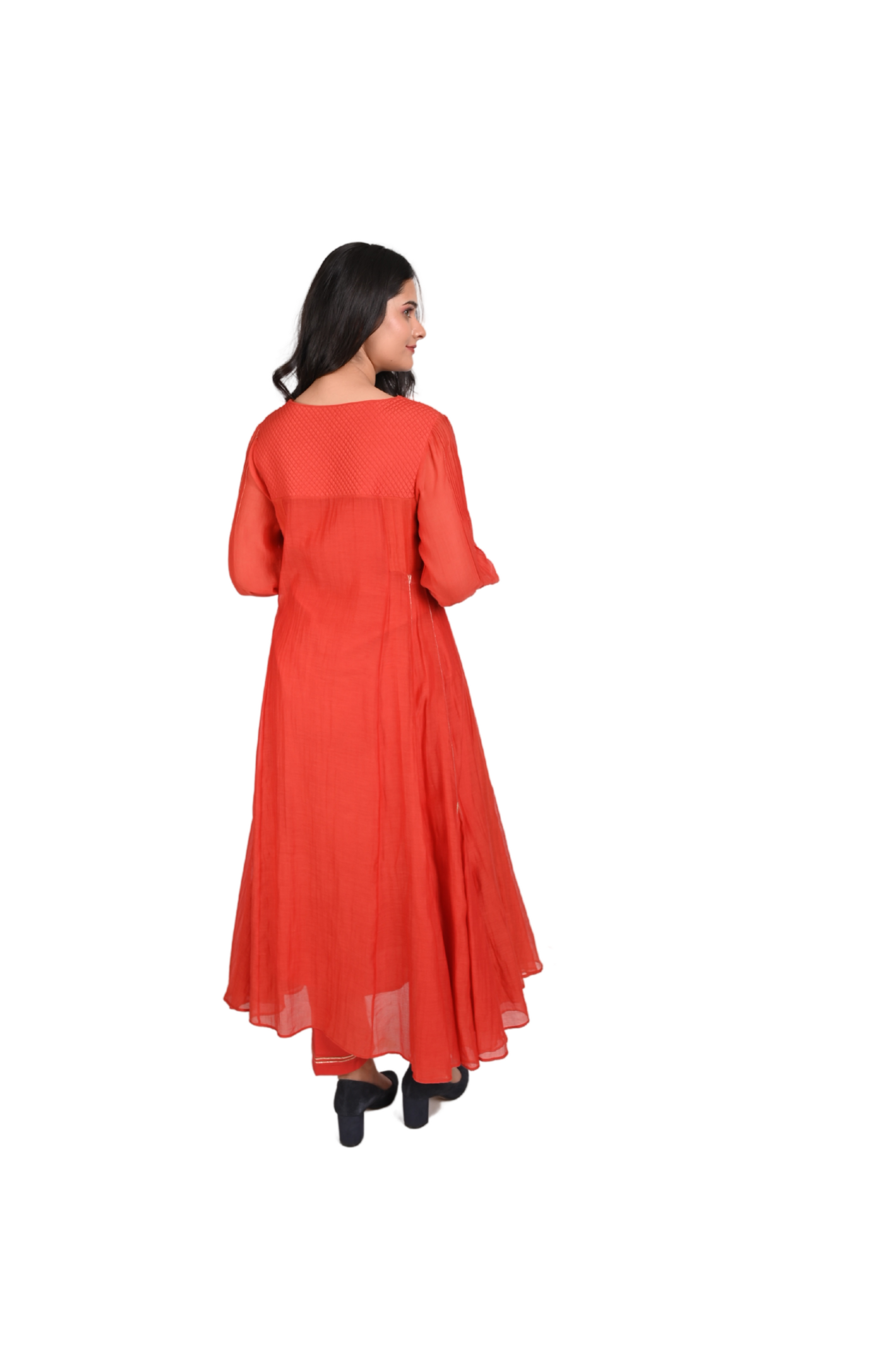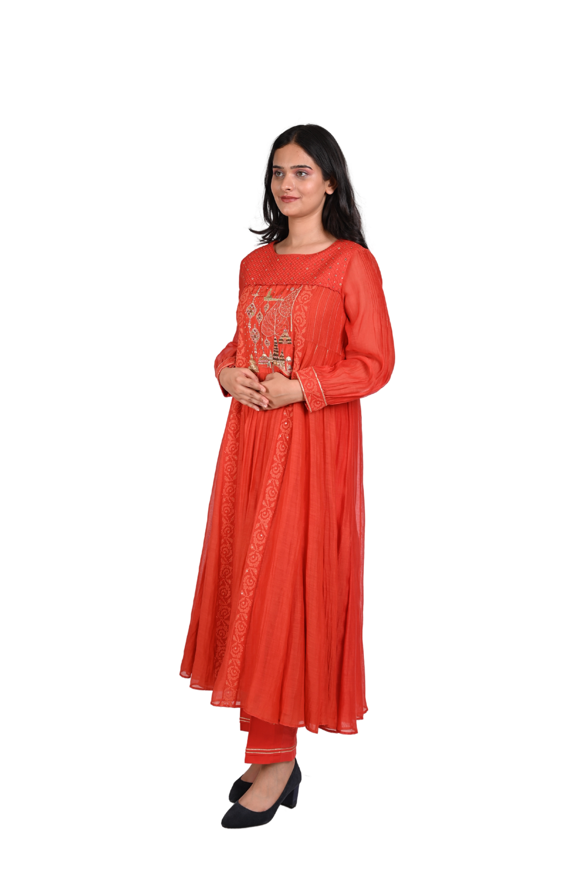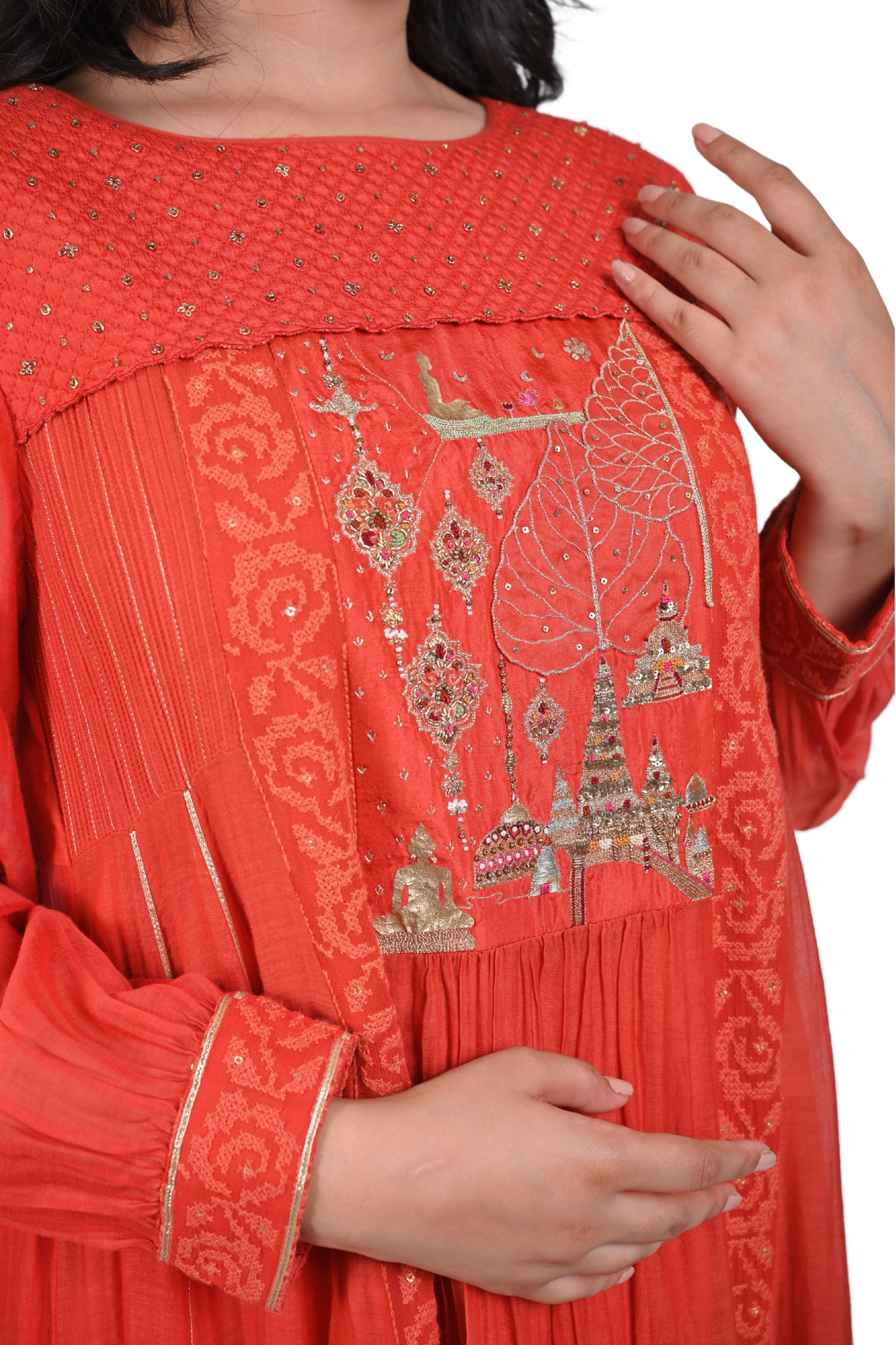 Maha is a tangerine orange kalidaar that holds stories older than time. Crafted in chanderi mulmul, its yoke becomes a sacred canvas—hand-embroidered with scenes of the Buddha, blooming lotuses, and whispers of ancient spirits. Quilted shoulders lend softness and strength, while a graceful Lucknowi panel flows through the silhouette like a quiet prayer. A piece where reverence meets radiance, designed for the modern muse who carries tradition with grace. Perfect for spiritual gatherings, temple visits, or soulful celebrations.