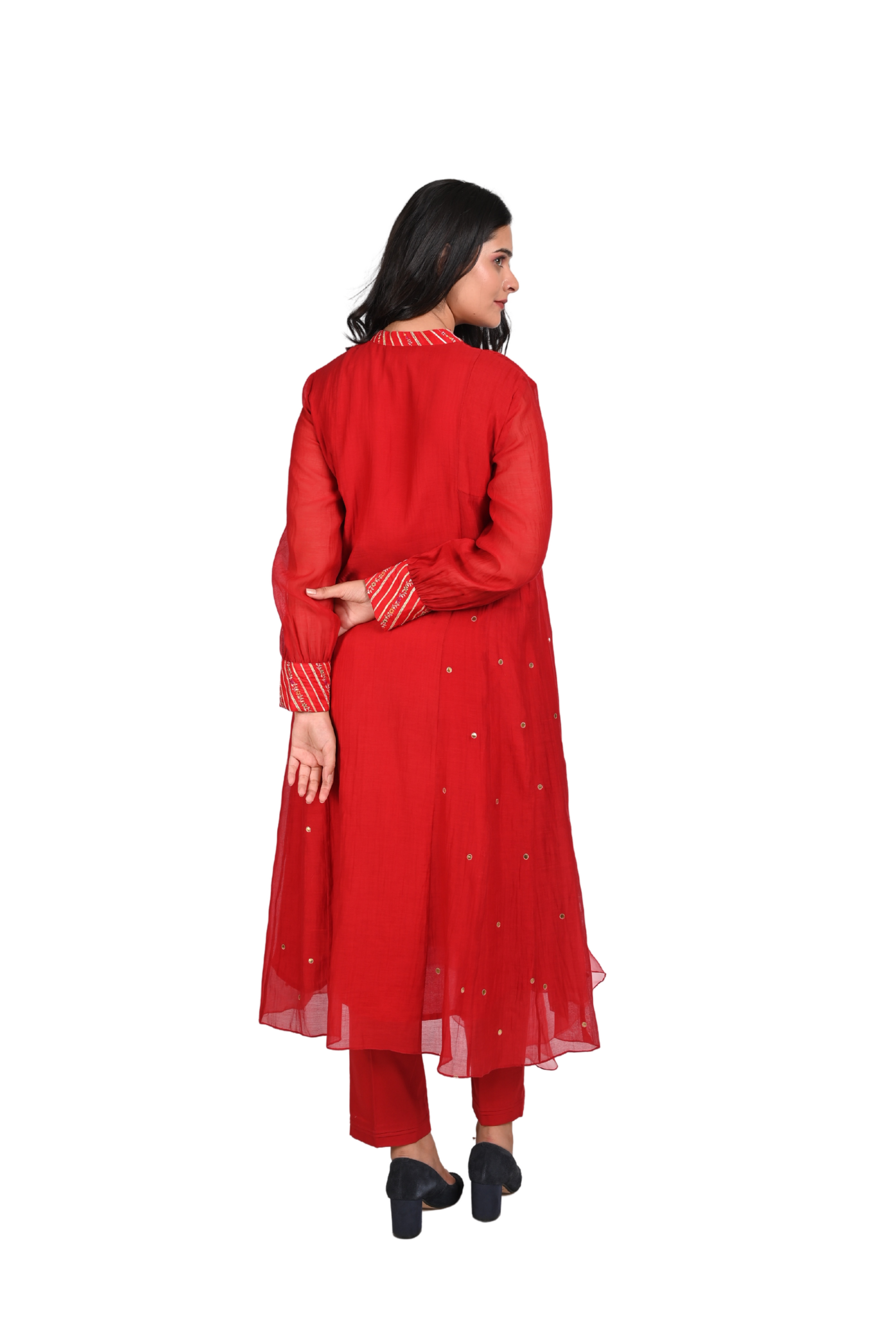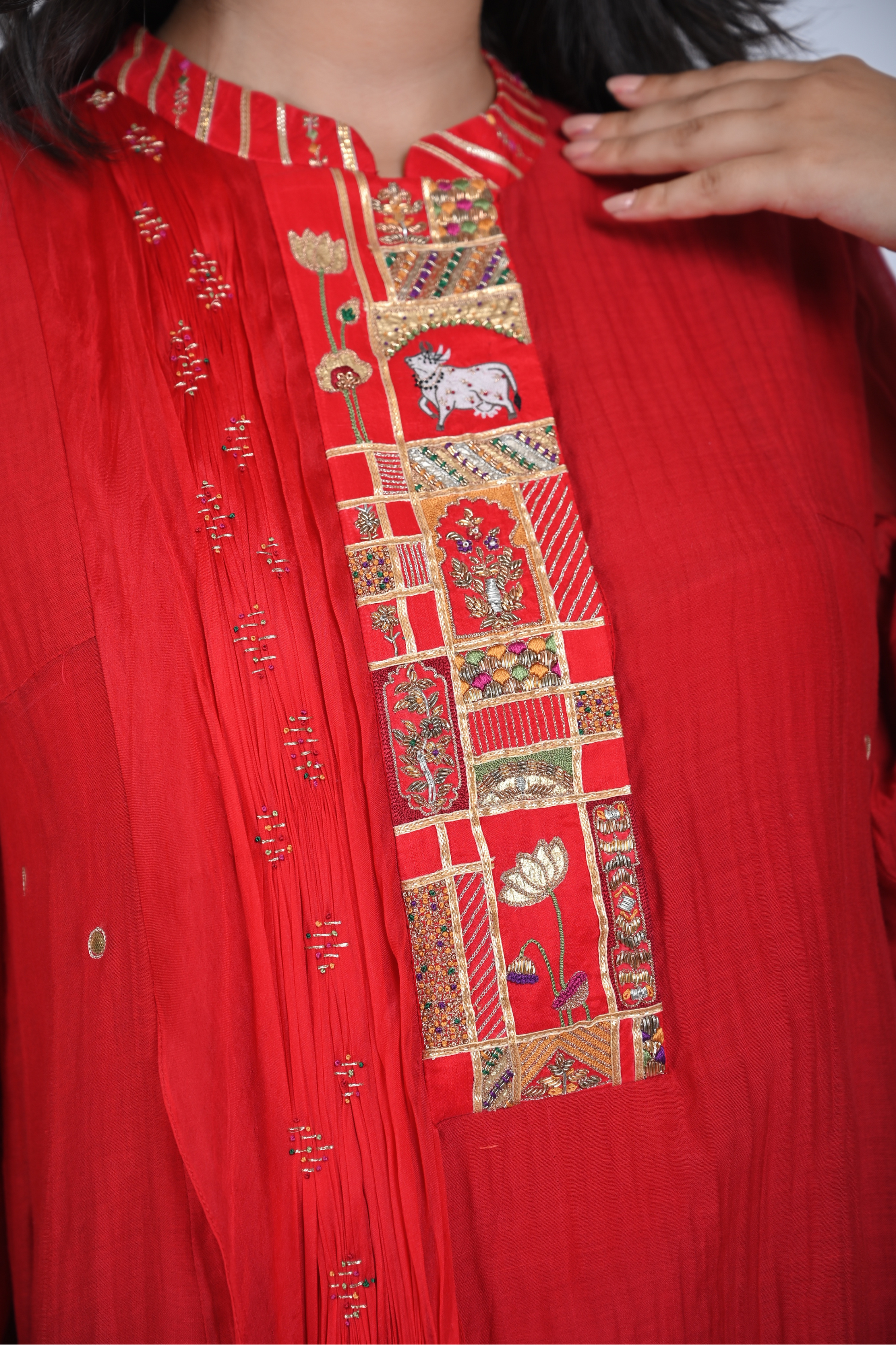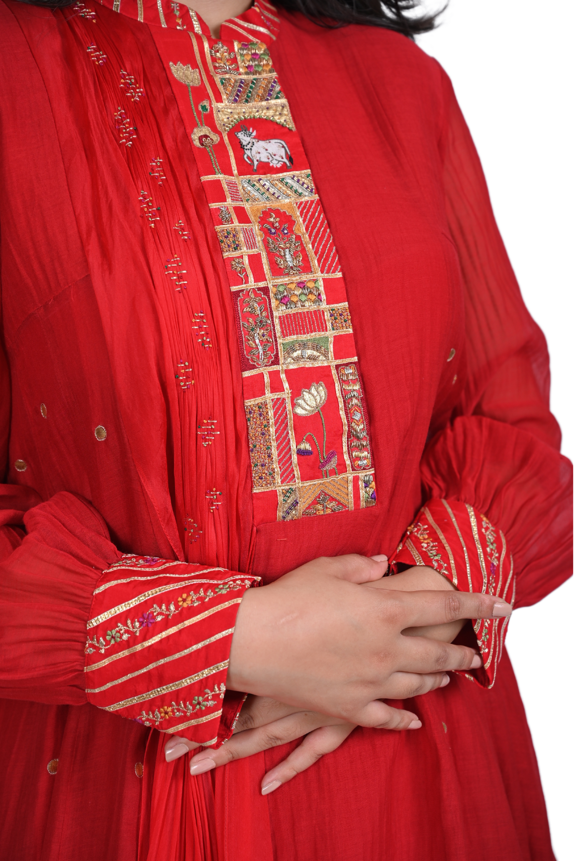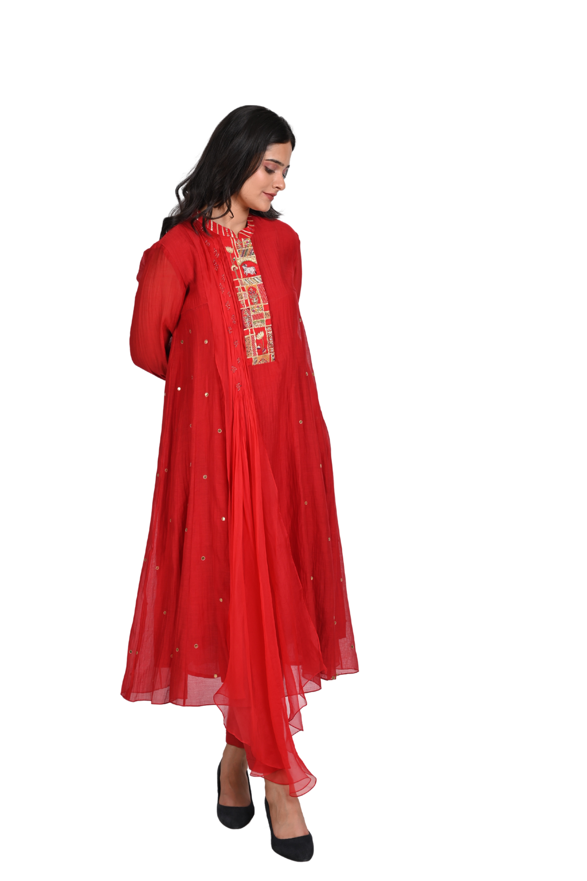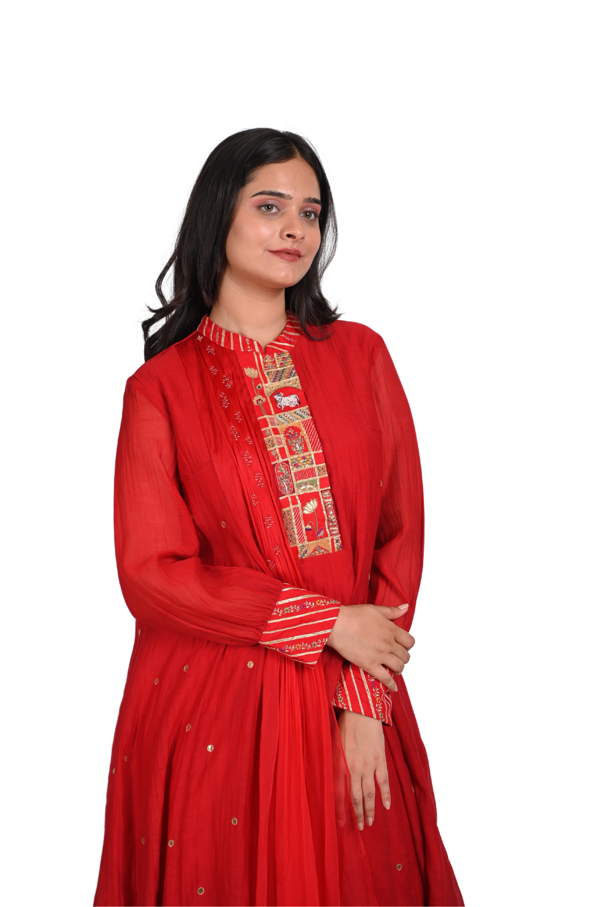 Myo is where geometry meets mythology, a kalidaar woven from chanderi mulmul and silk, rich in colour and intent. The statement placket, inspired by Mondrian’s lines and blocks, holds intricate hand-drawn motifs—lotuses in bloom, gentle cows, grand gateways, and sacred patterns—each one a tribute to heritage, translated through modern art. A sheer organza sash trails softly behind, like thought in motion. Radiant, artistic, and timeless, Myo is perfect for festive soirées, gallery evenings, or spirited celebrations of culture and self.