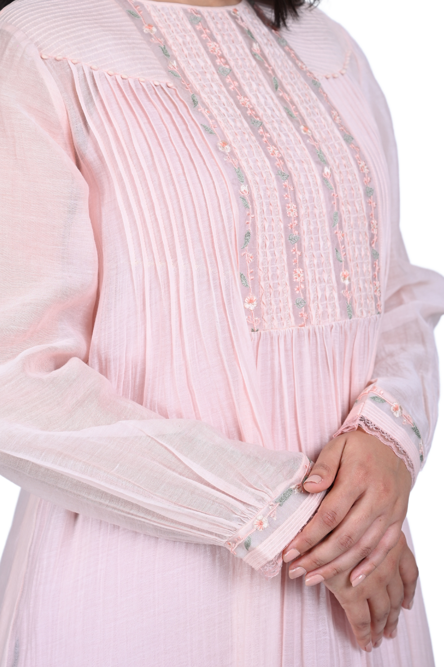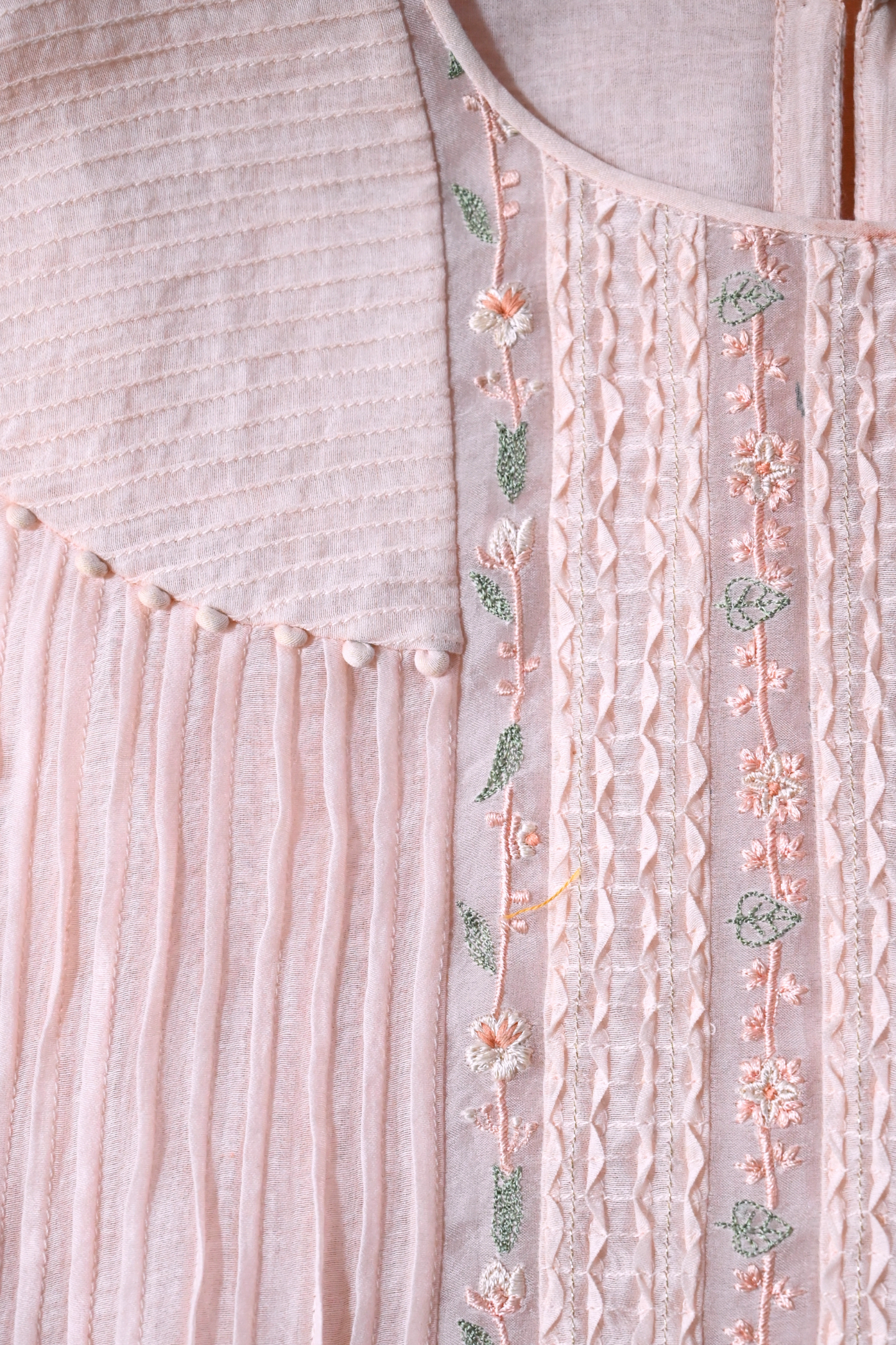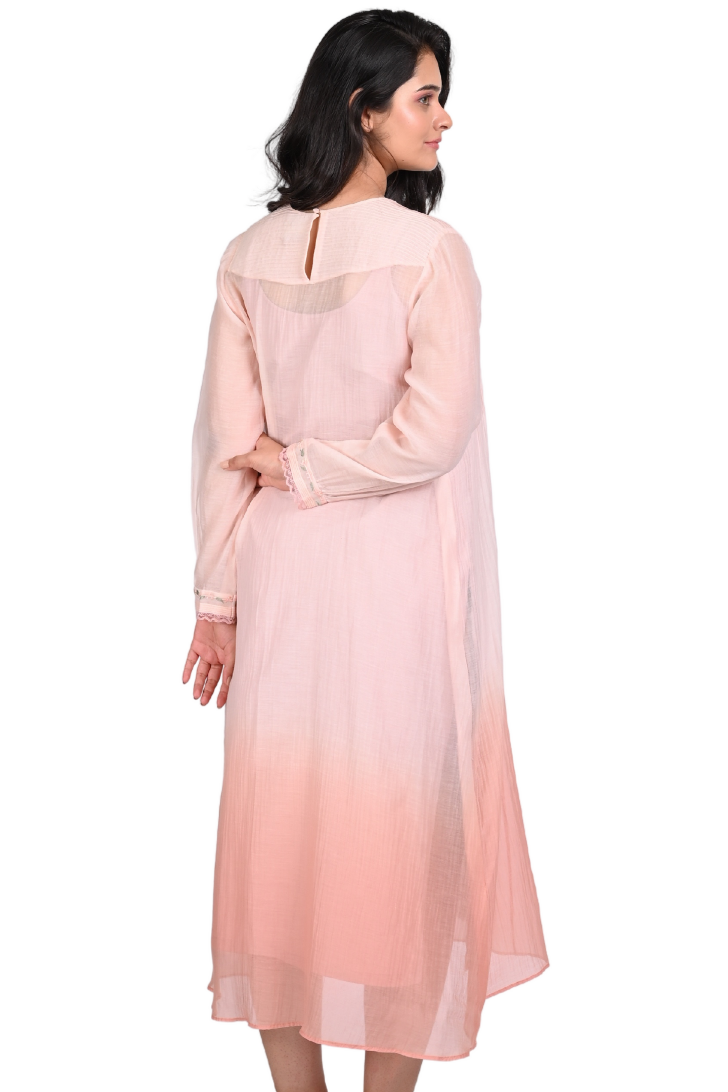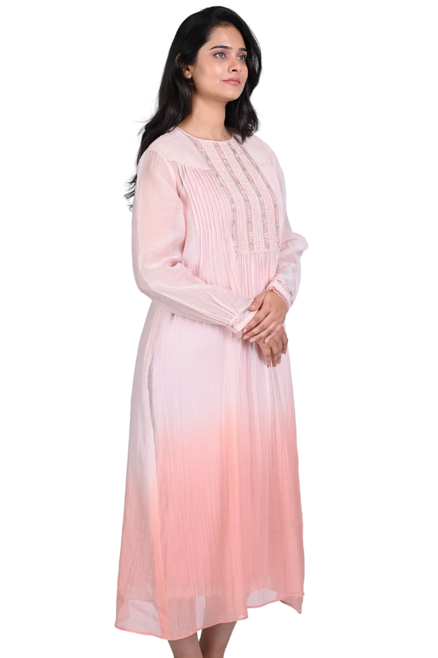 Crafted in soft Chanderi, this blush ombré dress captures the gentle hues of summer. It features organza insets with delicate thread embroidery and vertical pintucks on the yoke. The relaxed silhouette and subtle sheen make it a breezy and graceful pick for warm days.