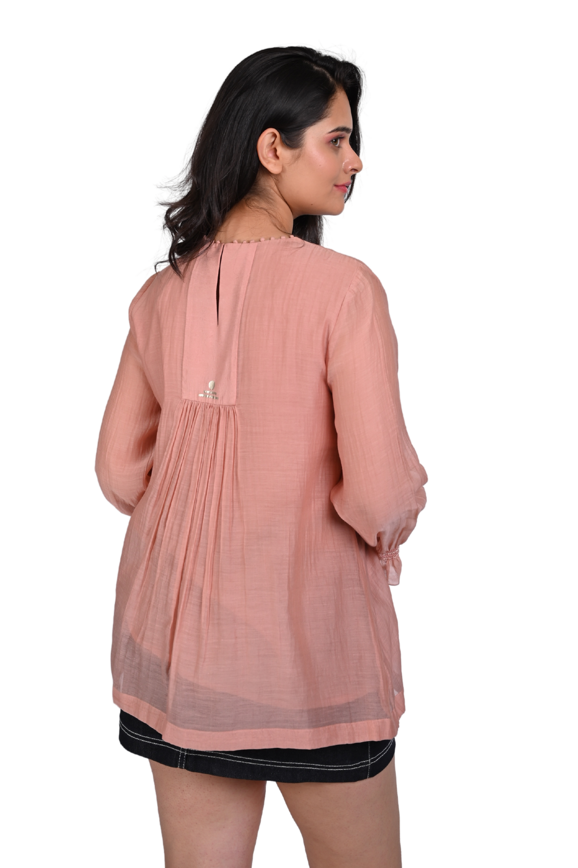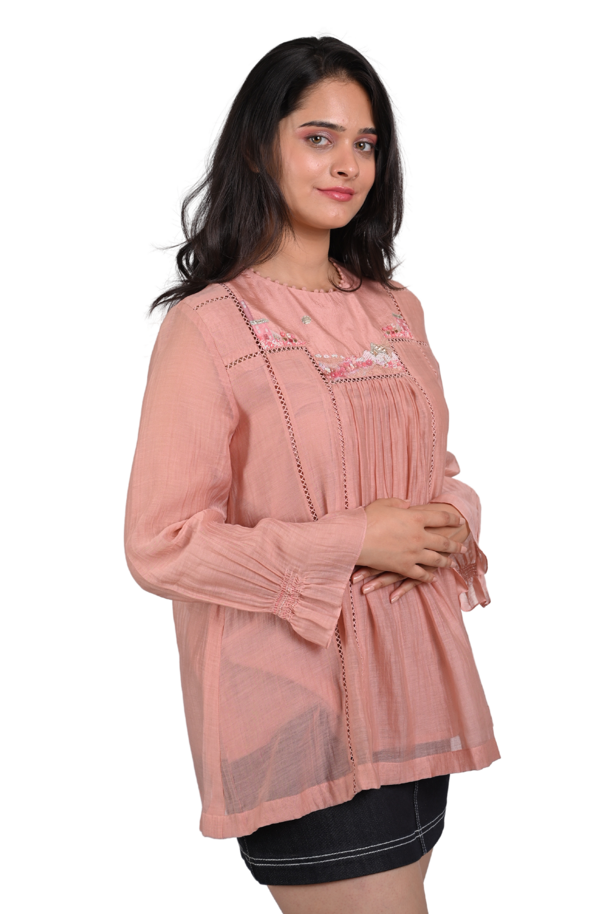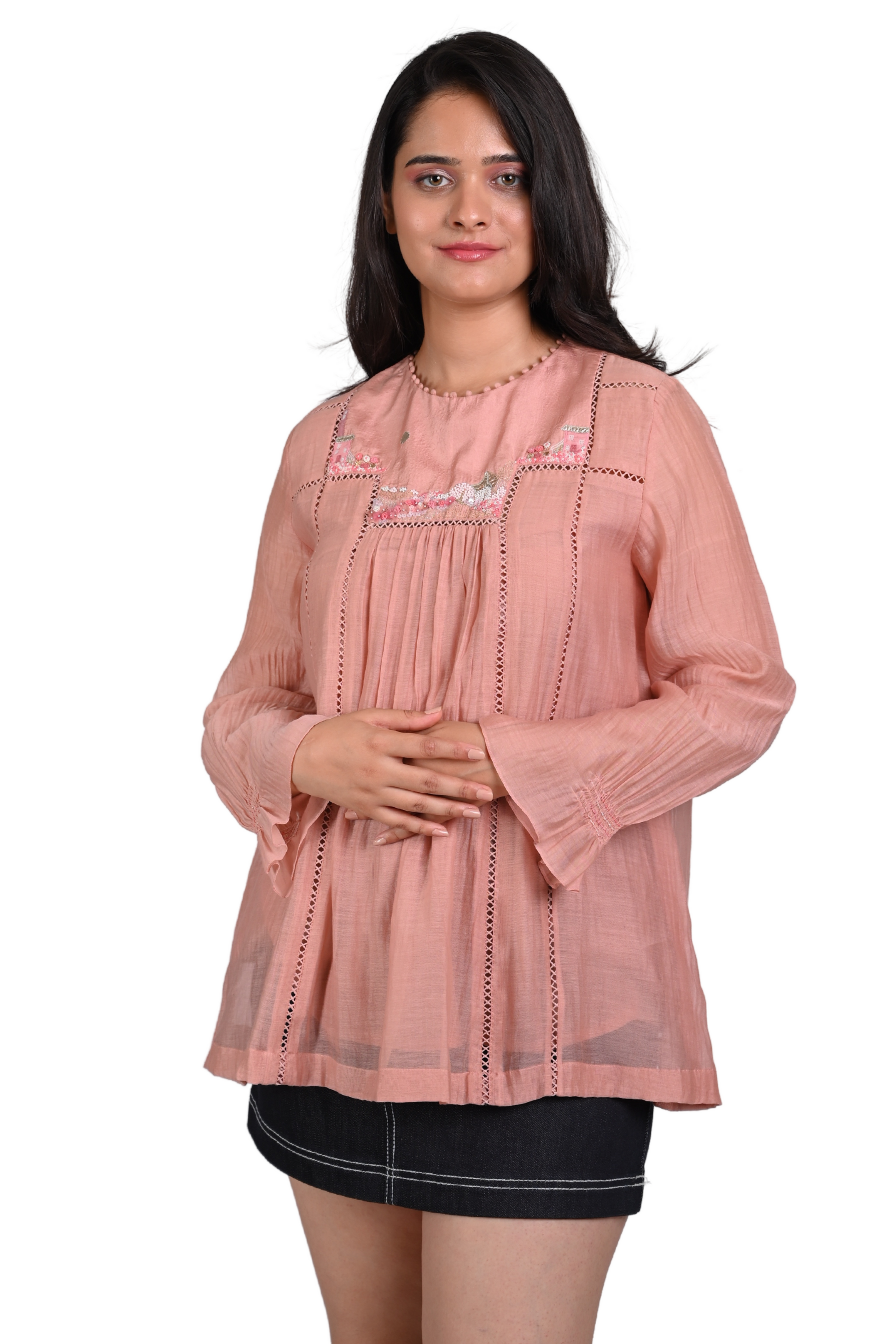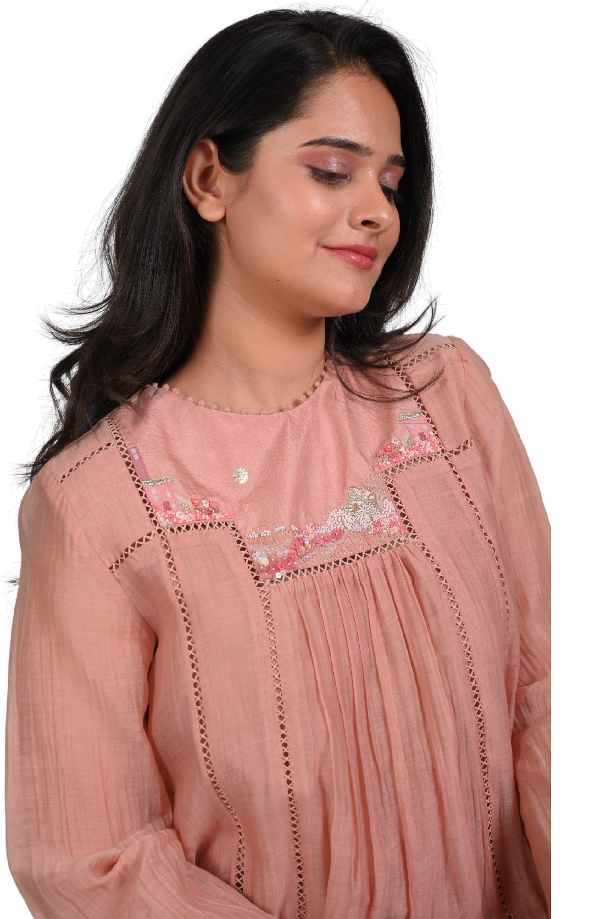 The Sunset top in soft chanderi draws inspiration from Van Gogh’s “Landscape with Houses,” echoing its serene countryside charm and gentle hues. Delicate lace insets and subtle gathers create a silhouette that mirrors the painting's tranquil rhythm. Like a brushstroke across a quiet sky, it carries the warmth of a fading day.