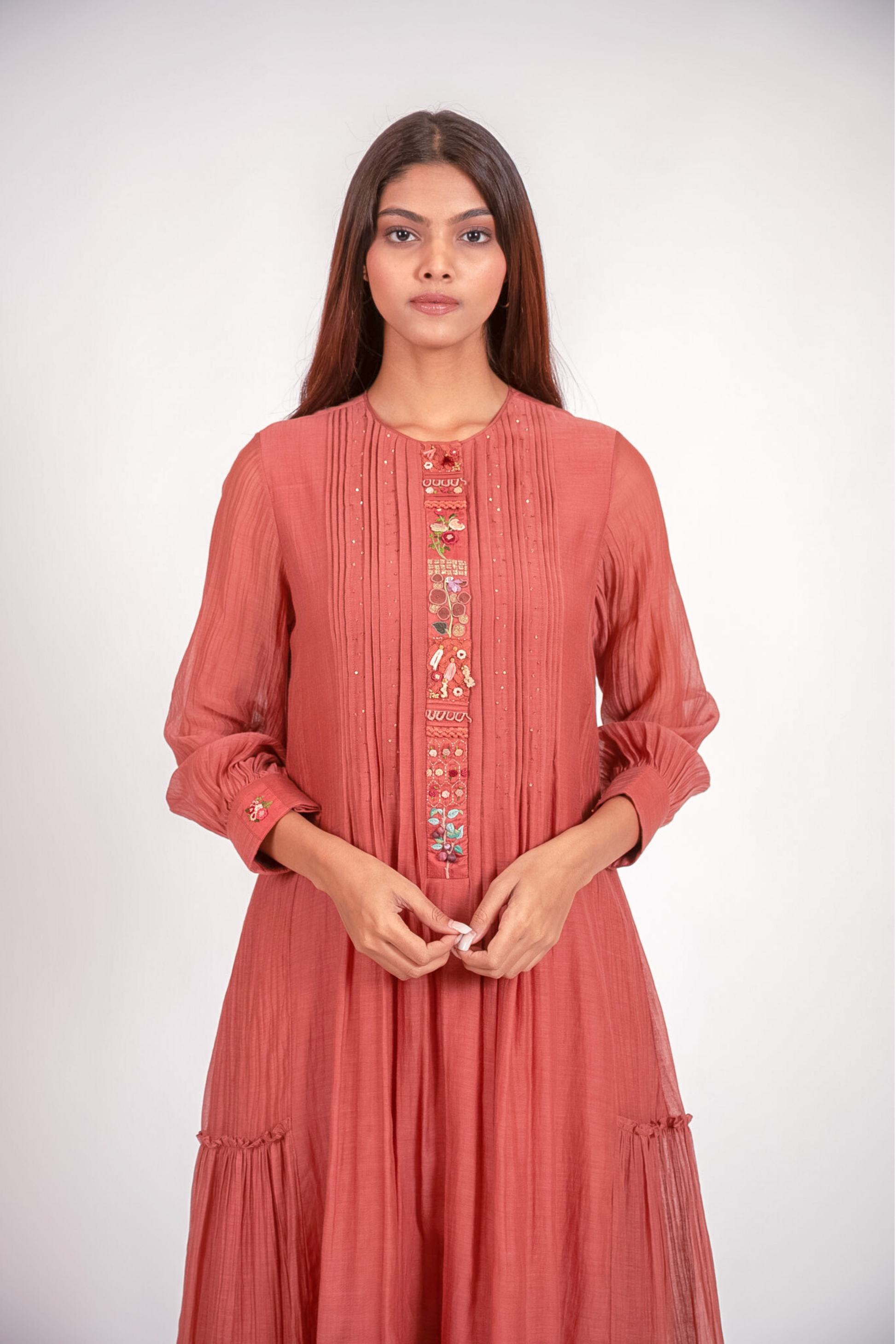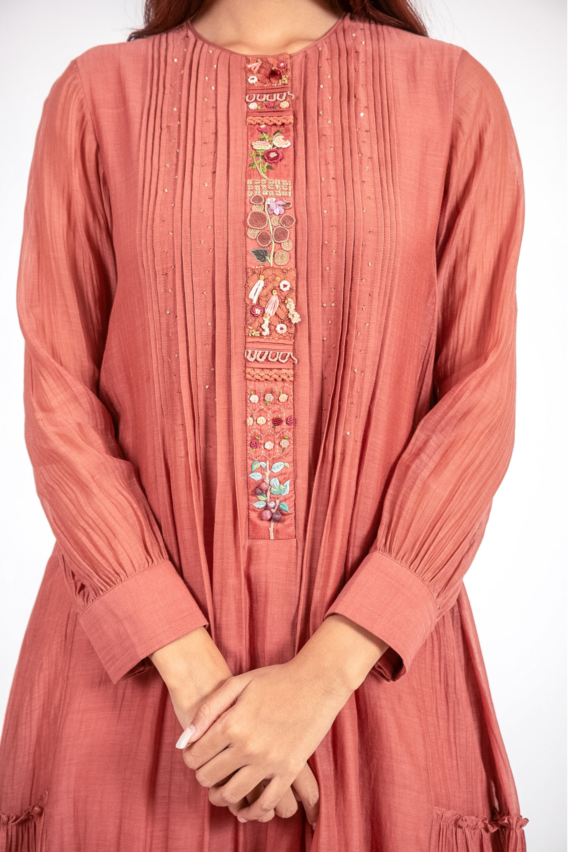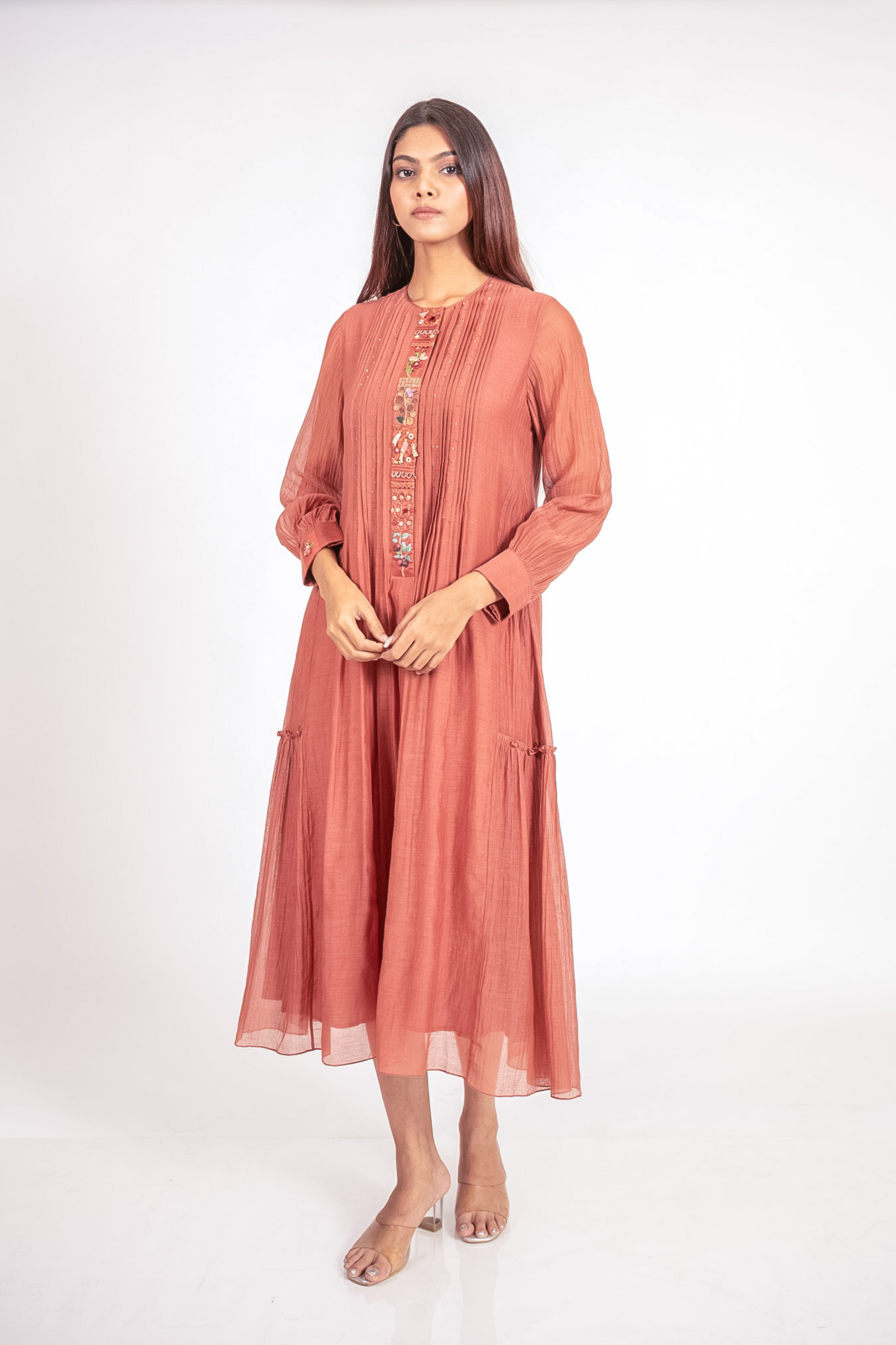 In soft, flowing fabric, the Sweet Pea midi dress carries the essence of a fragrance—rose, plum, woods, musk, and violet embroidered delicately along a long 18" placket. Gentle box pleats, adorned with subtle sequin highlights, add depth and movement, creating a piece that is both graceful and captivating.