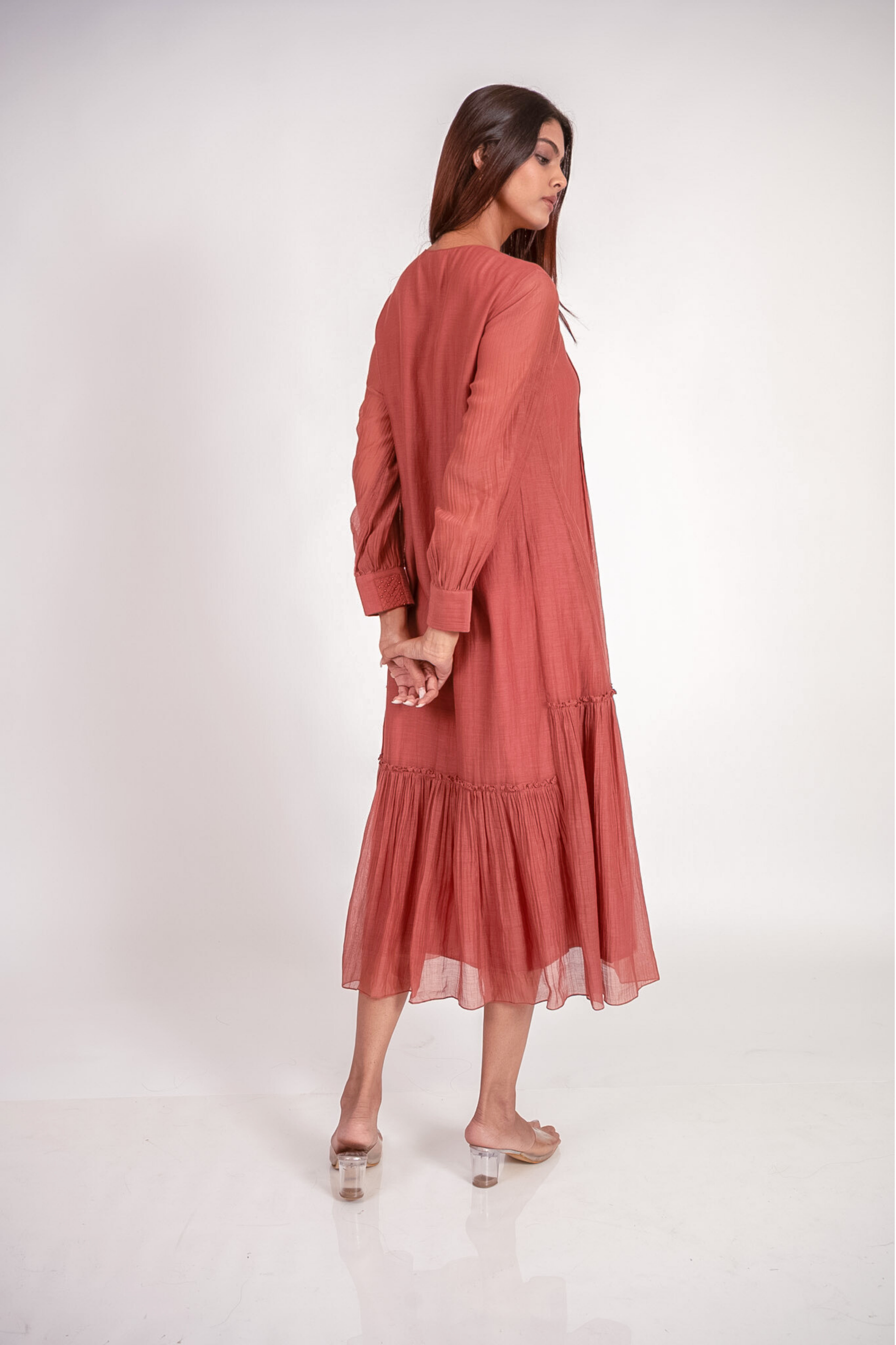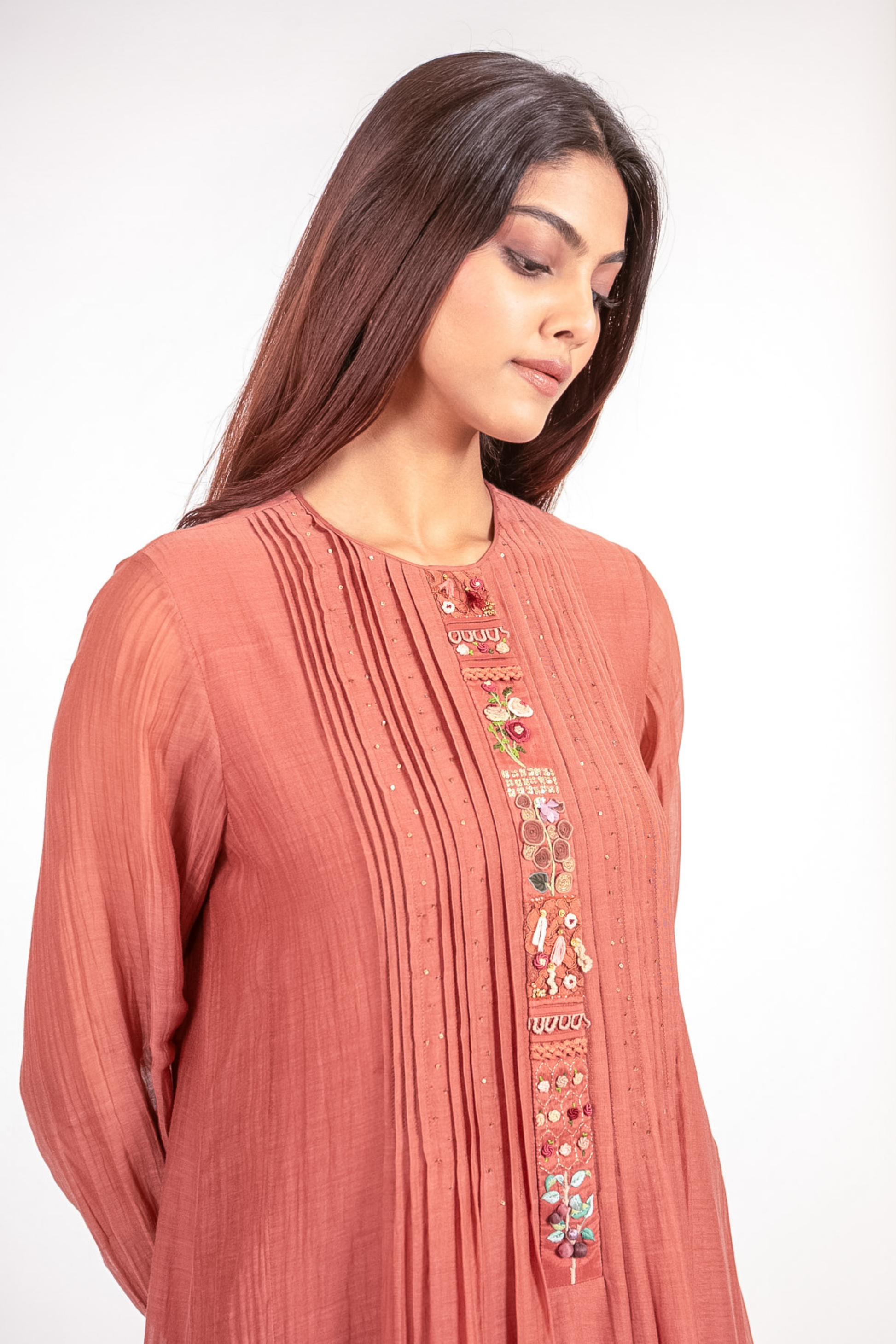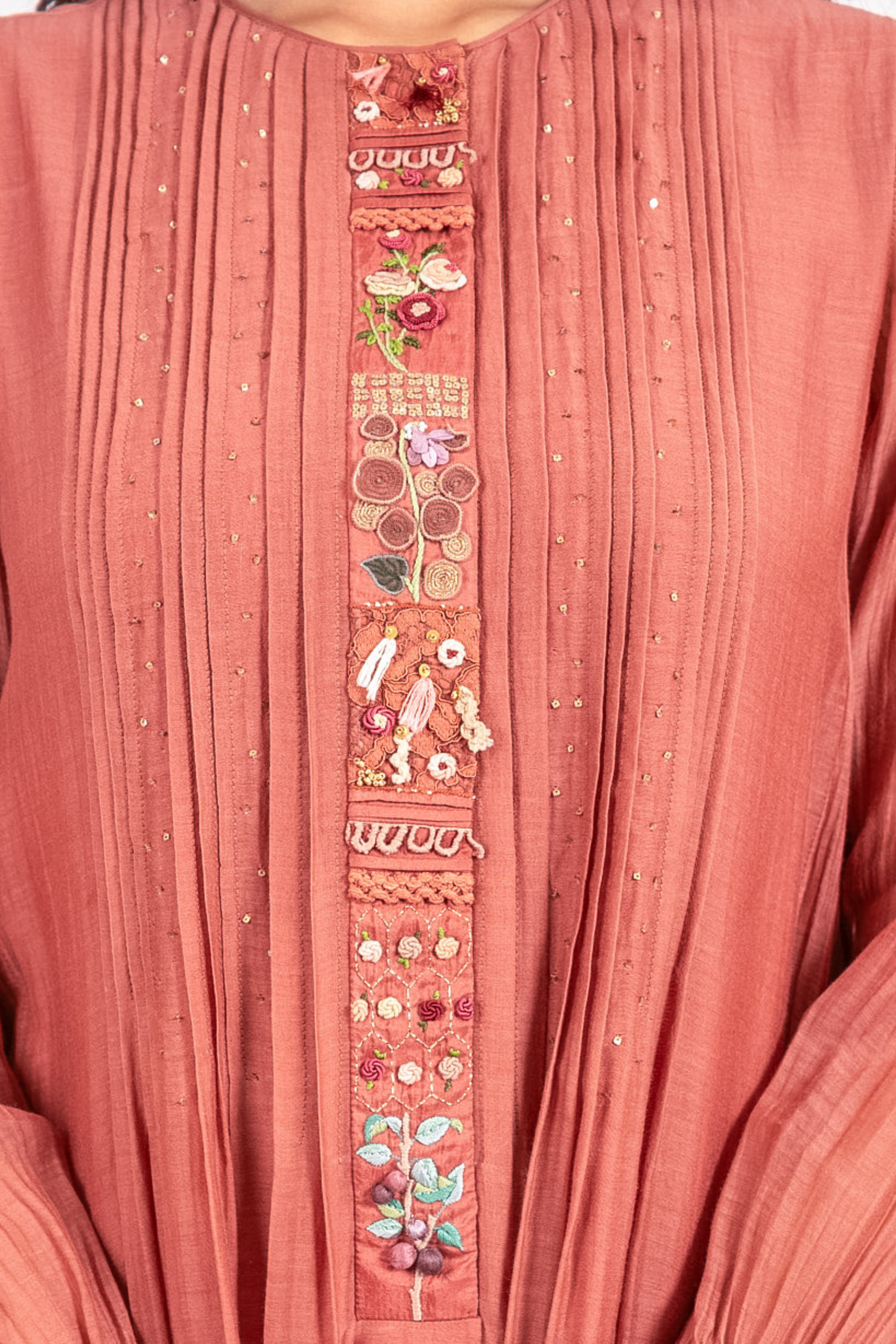In soft, flowing fabric, the Sweet Pea midi dress carries the essence of a fragrance—rose, plum, woods, musk, and violet embroidered delicately along a long 18" placket. Gentle box pleats, adorned with subtle sequin highlights, add depth and movement, creating a piece that is both graceful and captivating.