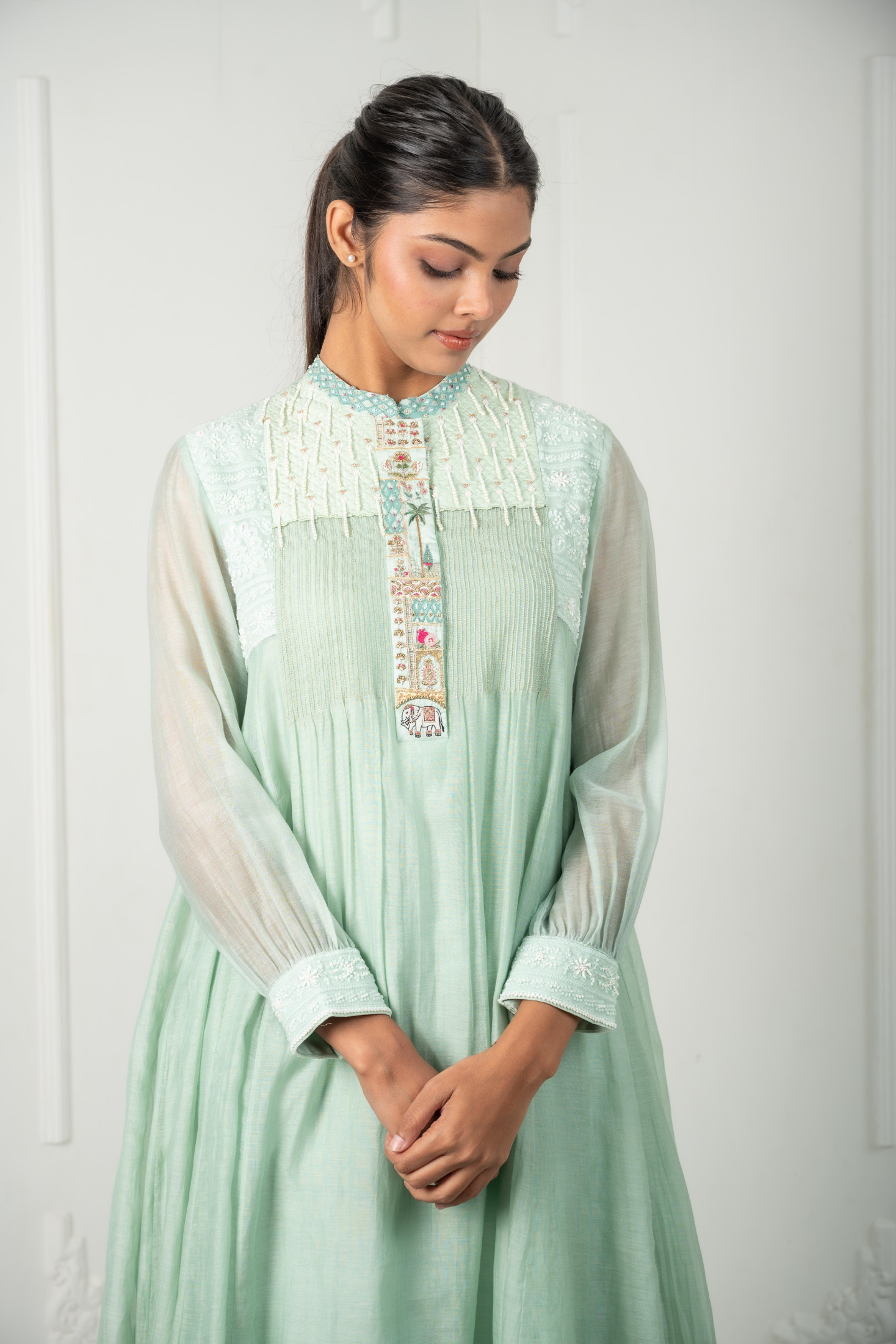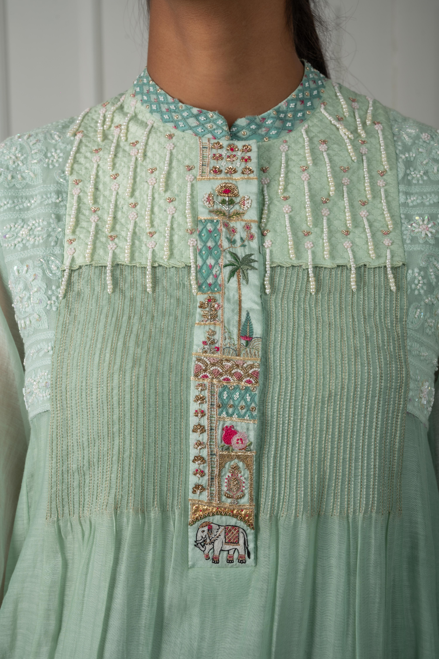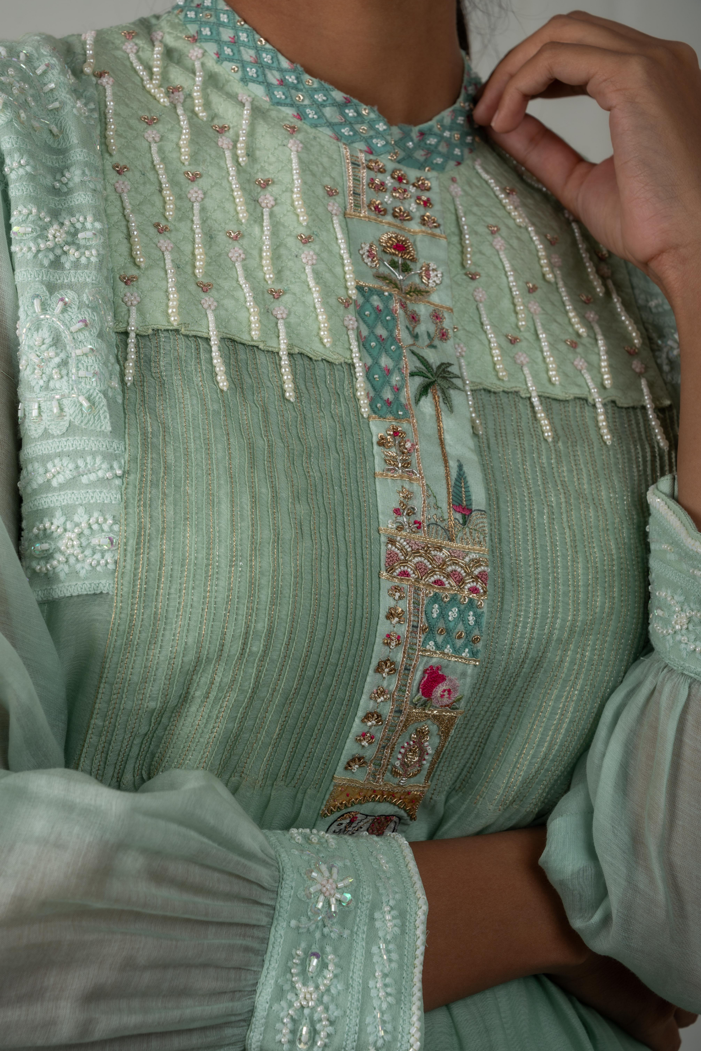 The Leela in sage green blends chanderi mulmul with silk for a soft, regal drape. The vibrant placket is brought to life with intricate hand-embroidered motifs of elephants, trees,and pomegranates. A quilted shoulder yoke finished with pearl hangings flows into Lucknowi embroidery, highlighted with cut dana and beads, offering richness in every detail. Perfect for festive lunches, cultural events, or elegant daytime gatherings.