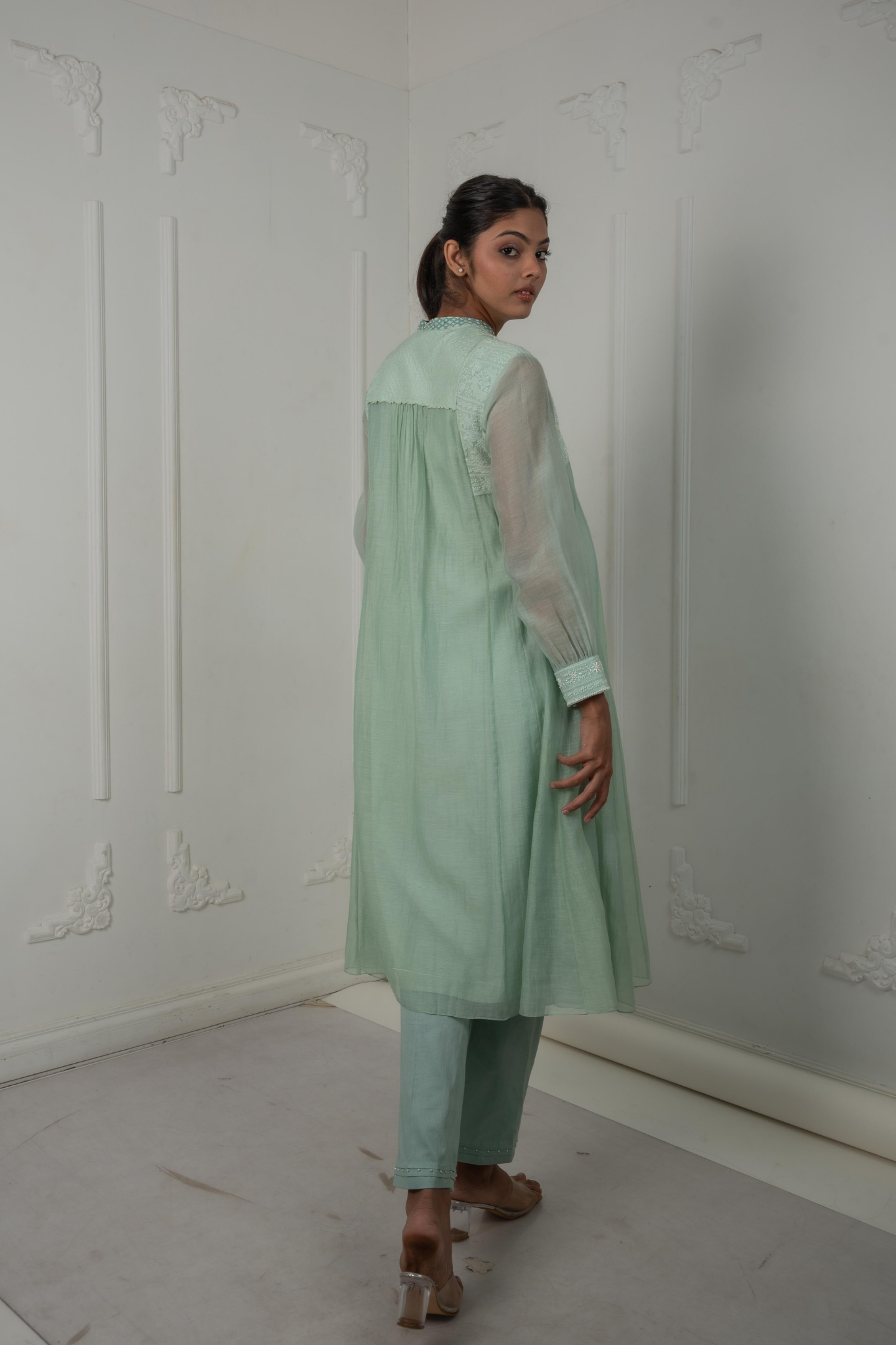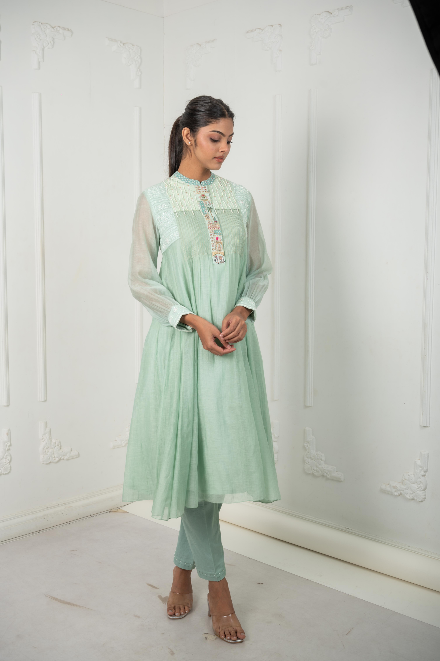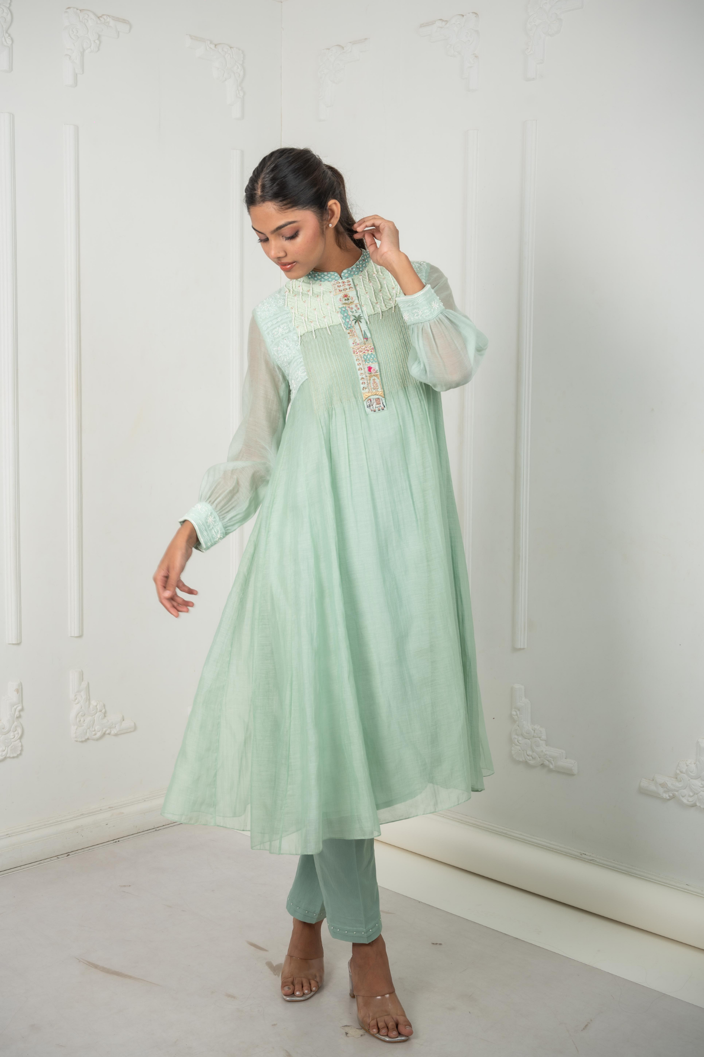 The Leela in sage green blends chanderi mulmul with silk for a soft, regal drape. The vibrant placket is brought to life with intricate hand-embroidered motifs of elephants, trees,and pomegranates. A quilted shoulder yoke finished with pearl hangings flows into Lucknowi embroidery, highlighted with cut dana and beads, offering richness in every detail. Perfect for festive lunches, cultural events, or elegant daytime gatherings.
