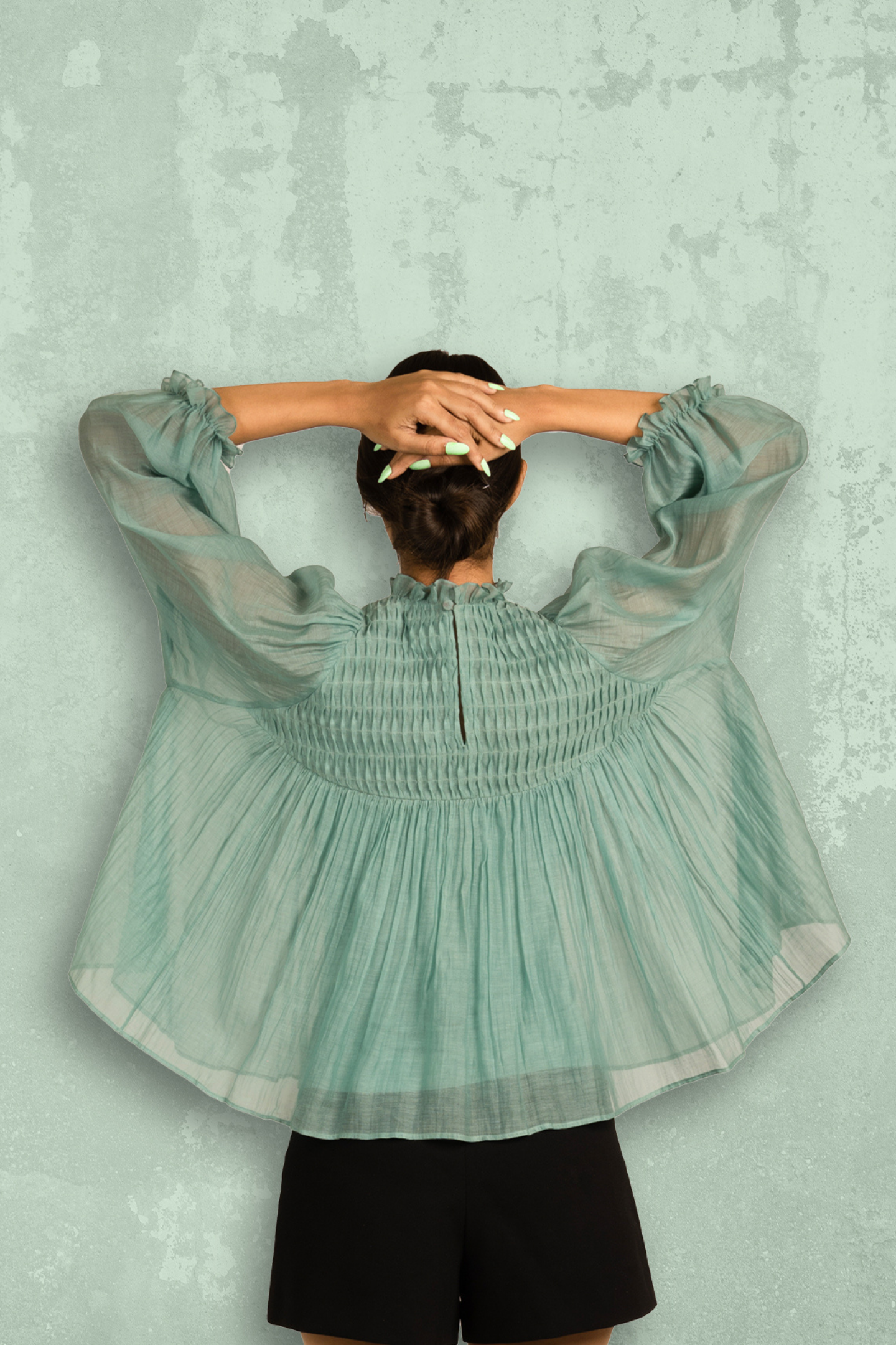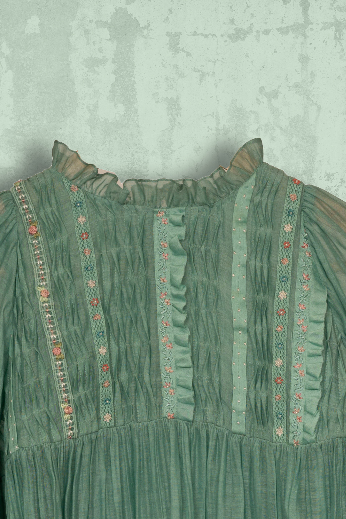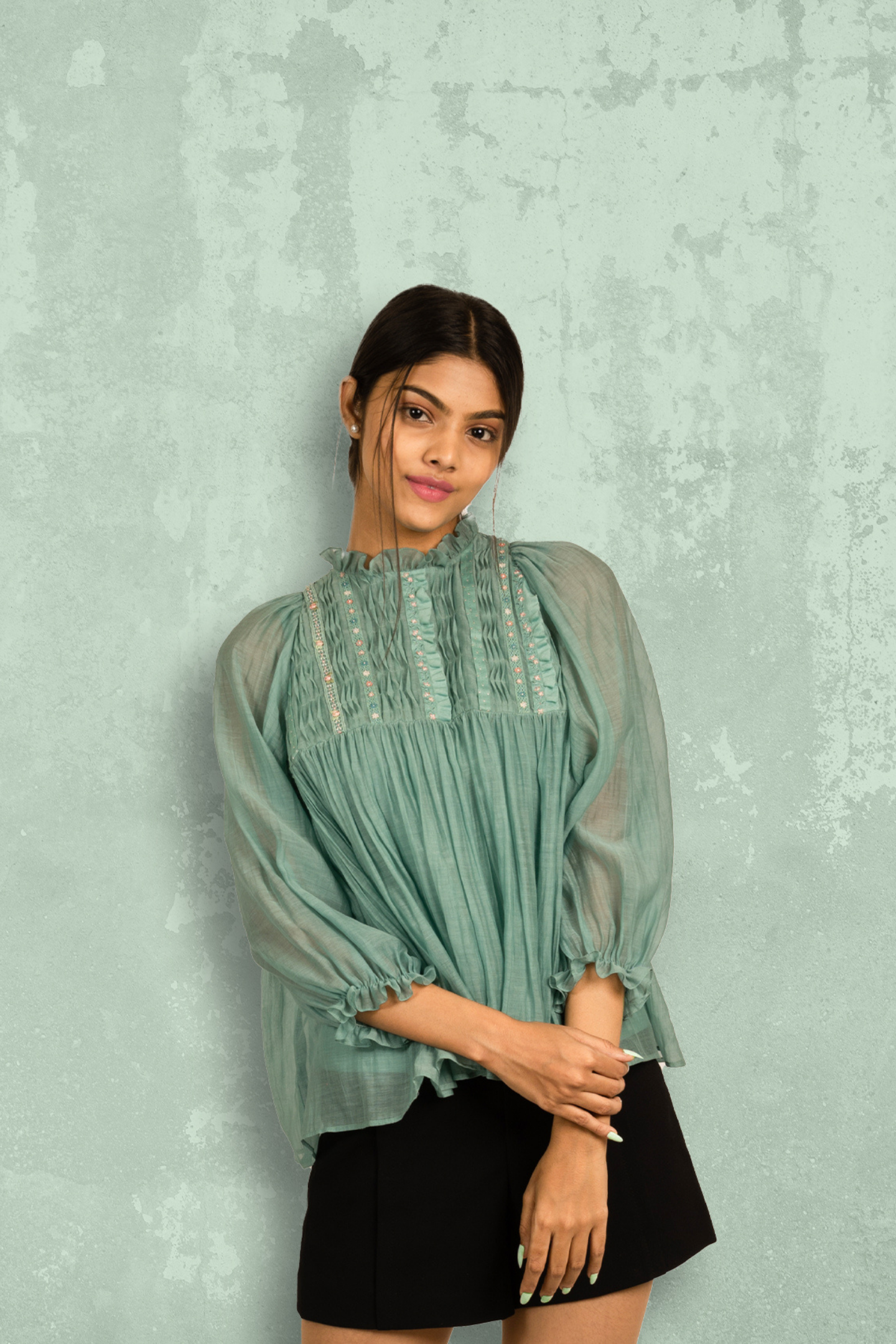 This sage green chanderi blouse features a textured yoke with inverted pleats, lace, frills, and delicate floral accents. A beautiful flare with soft gathers creates a summery, feminine silhouette, while a high ruffled neck adds an air of playful elegance. Perfect for garden parties, brunches, or warm evening soirées.