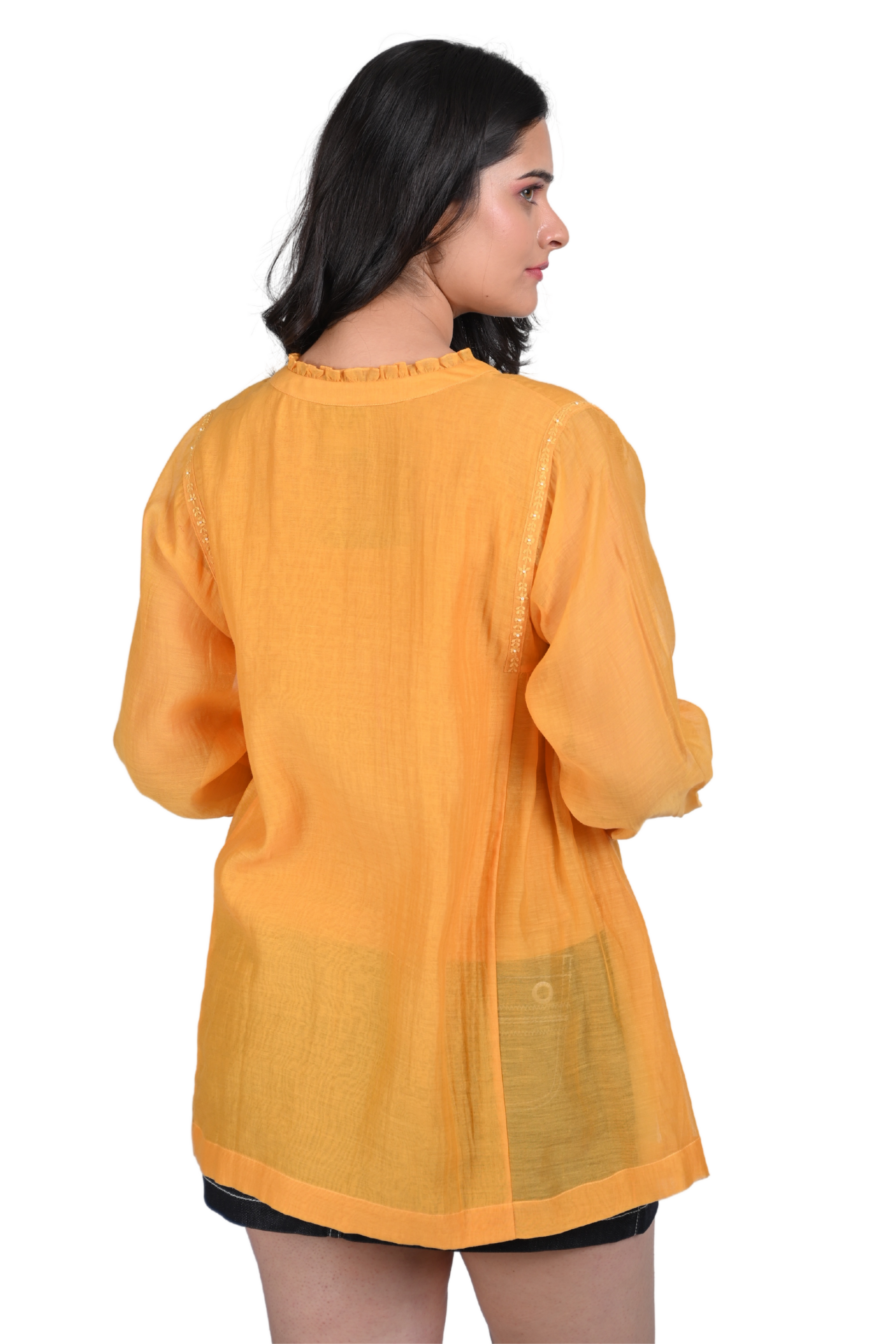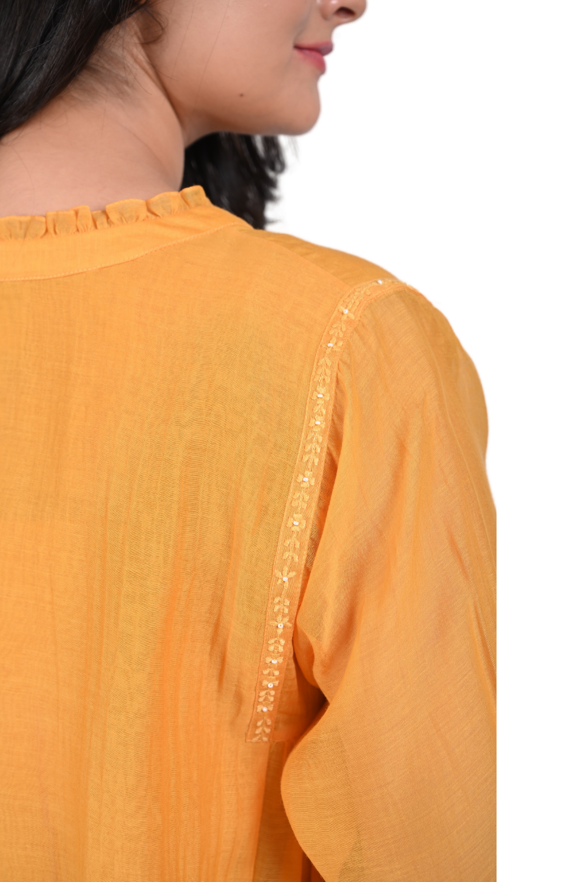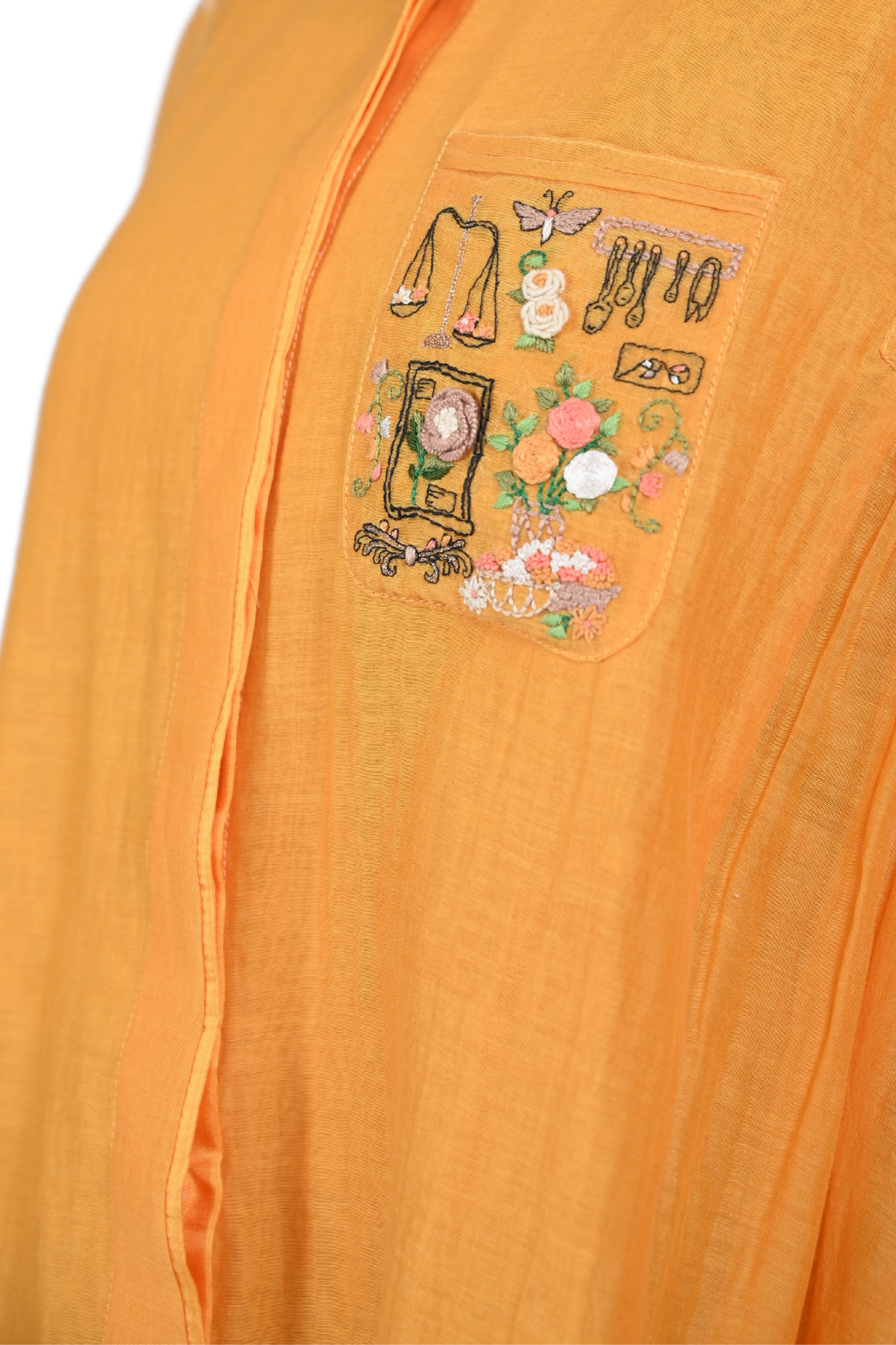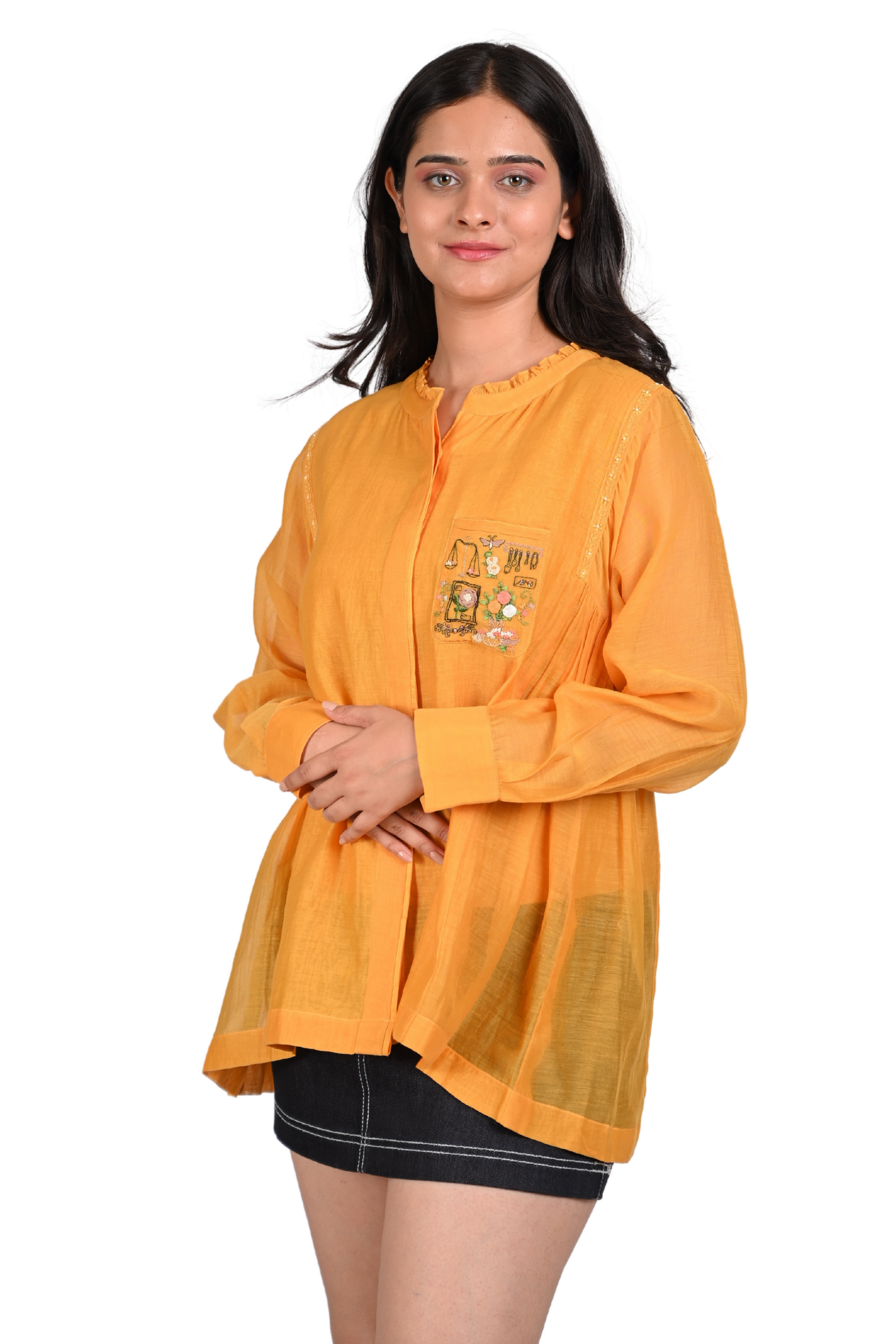 The Wish 2.0 Top in chanderi whispers celestial secrets through hand-embroidered zodiac signs and a petite pocket blooming with florals, bouquets, and butterflies. Sleeve and shoulder details add dreamy dimension.